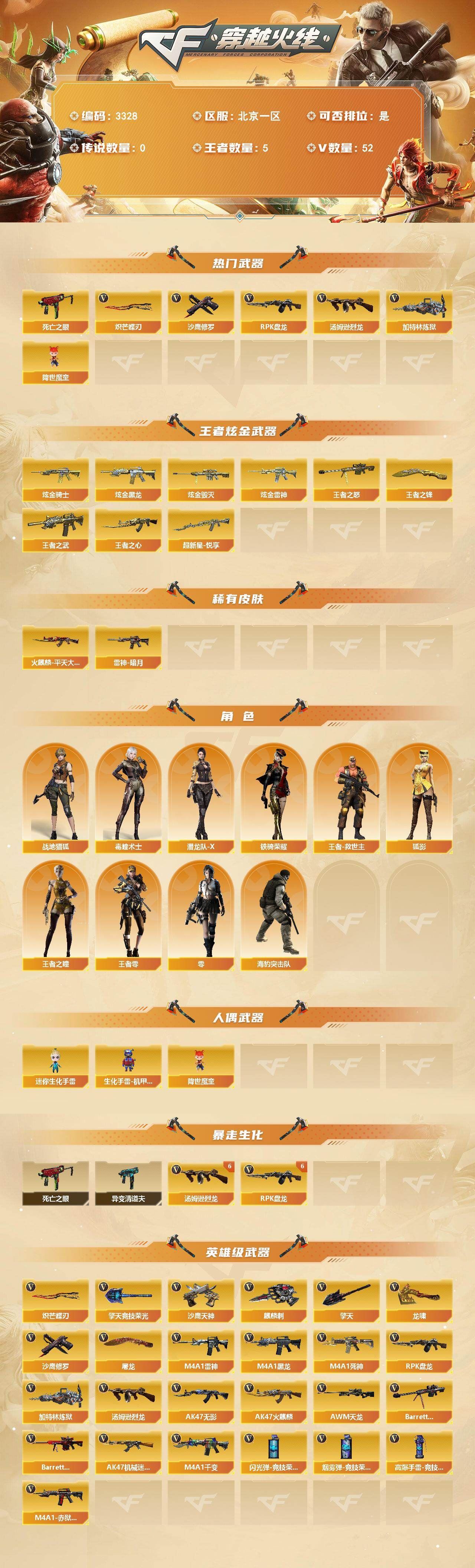 可二次可排位北京一区-52V-4王者武器数-4炫金武器数【热门武器】:死亡之眼*2,汤姆逊-烈龙*6,RPK-盘龙*6,加特林-炼狱*2,降世魔童,沙鹰-修罗*2,炽芒蝶刃【王者炫金武器】:超新星-悦享,王者之武,王者之心,王者之怒,王者之锋,炫金骑士,炫金黑龙,炫金雷神,炫金毁灭【皮肤】:雷神-暗月,火麒麟-平天大圣【角色】:零,4防毒蝰术士,战地猎狐,王者-零,王者之瞳,王者-救世主,狐影,潜龙队-X,铁骑荣耀,海豹突击队【人偶武器】:迷你生化手雷*2,生化手雷-机甲核心,降世魔童【暴走生化】:异变清道夫,死亡之眼*2【英雄级武器】:M4A1-千变,AK47-火麒麟*2,M4A1-黑龙,M4A1-雷神,AK47-无影,M4A1-死神*2,AK47-机械迷城,AWM-天龙,Barrett-毁灭,Barrett-极光*3,RPK-盘龙*6,加特林-炼狱*2,汤姆逊-烈龙*6,沙鹰-修罗*2,沙鹰-天神,屠龙*4,龙啸,擎天,麒麟刺,擎天-竞技荣光,炽芒蝶刃,高爆手雷-竞技荣光*4,闪光弹-竞技荣光*4,烟雾弹-竞技荣光*2,M4A1-赤狱骑士【其他武器】:源·火麒麟,魂·M4A1-雷神-化蛇,御·黑骑士·哪吒闹海,灵·黑骑士-破界 I,魂·黑武士-锋芒破茧,源·武圣,源·机械迷城,源·青龙,魂·HK417-朱雀-凤灵*2,源-金色蔷薇,魂·9A91·烈火-电子连击,源·天龙,魂·裁决-凤灵,魂·Barrett-金色蔷薇-蛇姬,魂·Barrett-朱雀- 新春神龙,灵·Barrett-朱雀-炫光,魂·炼狱-电子连击,魂·炼狱-玩具枪,魂·炼狱-月,源·武圣glock,魂·擎天-蒸汽钟表,魂·麒麟刺-神秘黑洞【道具】:战舰背包,炫彩背包,圣拳猎手-炽雪,救世主-黑桃战神,绿色巨人,灵魂忍者,变异宝贝,迷雾幽灵,夺命之镰,防化服*2,枪王排位28赛季金色流光,枪王排位29赛季金色流光,防弹头盔*2,防弹衣*2,C4工具钳*2,手雷包*2【特殊枪械】:6烈龙,6盘龙,2炼狱各种道具详情看截图、低价出售找回包 赔、截图展示段位不代 表实际段位,如赛季更新等不可抗拒因素发生变化、时限道具不保证所剩时间、标题未写送点劵默认不送【卖号买号首选亿梦】