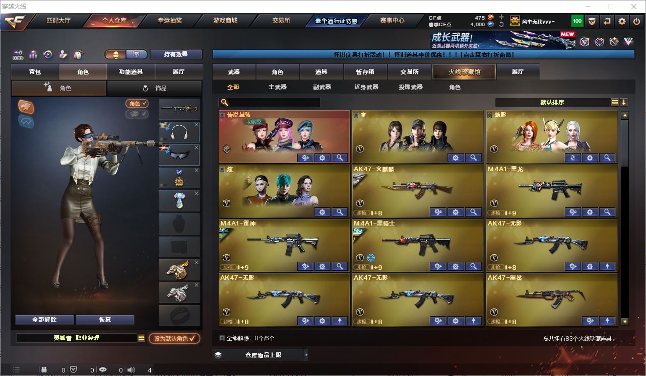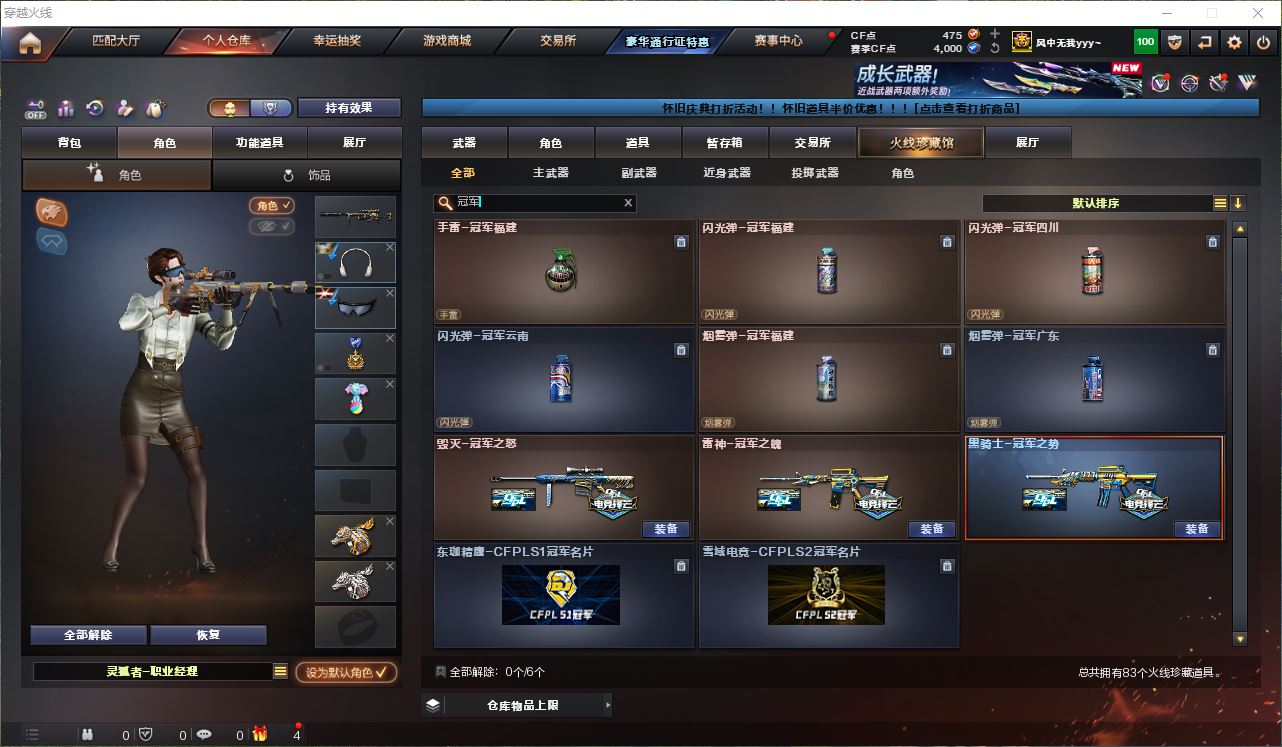 AK036430 四川一区 83v 【亮点解析 传说皮肤 】 【传说星骇】【M200-幻神+黄忠】【98K-星神】【AWM-裁决+音效卡+运输船 】【ScarLight-白虎】【QBZ金色蔷薇+音效卡】【战神+粉色甜心】【M4A1-雷神 +荣耀之魄+冠军之魄】【毁灭+音效卡+荣耀之怒+s2020】【AK47-火麒麟+传奇EVEN】【黑骑士+音效卡+海王+冠军之势】【朱雀】【烈火】【生化武器 盘龙*3 炼狱*2 6烈龙 死亡之眼】【武器:毁灭*2无影*3 黑鲨*2 机械迷城 王者之怒*2 王者冰魄 王者之幻 暗月传说】【4手枪:修罗*3 天神 】【9刀具:屠龙 龙啸 尼泊尔 斩神刀 丛林匕首 麒麟刺 堕天神 马来剑 】【8雷套:雷霆雷*1 雷暴雷*1 堕天神*3 玄豹*1 竞技荣光*1 夜魔*1】【音效卡:毁灭音效卡 黑骑士音效卡 金色蔷薇音效卡 裁决音效卡 】【四防角色:职业经理 】----更多炫彩背包/光效/名片/武器具体看图!截图展示段位不代实际段位,赛季更新等不可抗拒因素发生变化、时限道具不保证所剩时间、标题未写送点券默认不送】【主播担保+安全至上+性价比 买号卖号只选金牌商家一左友】