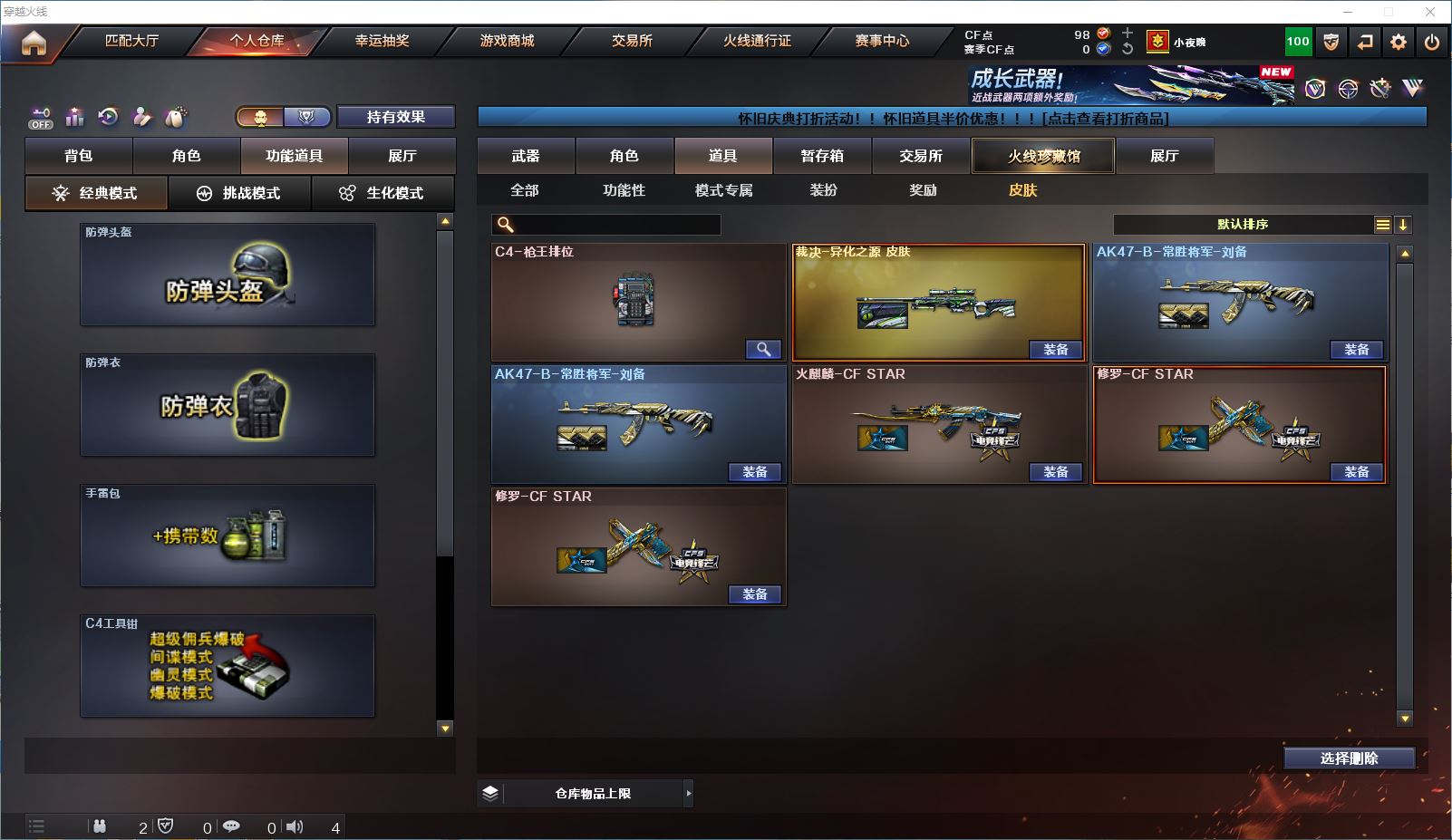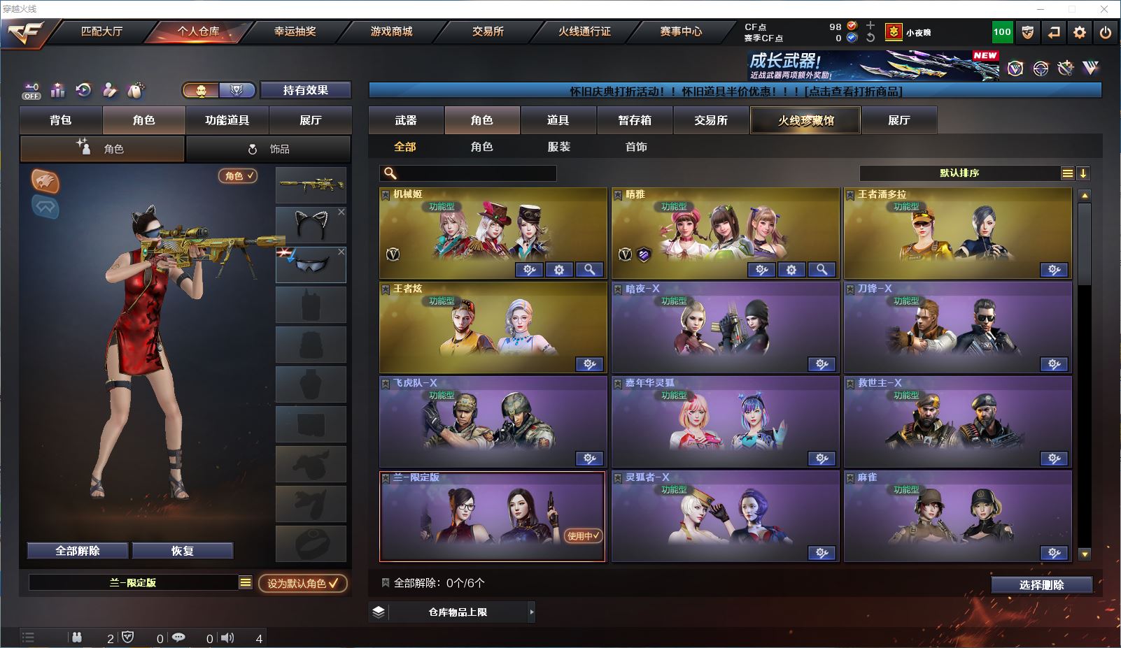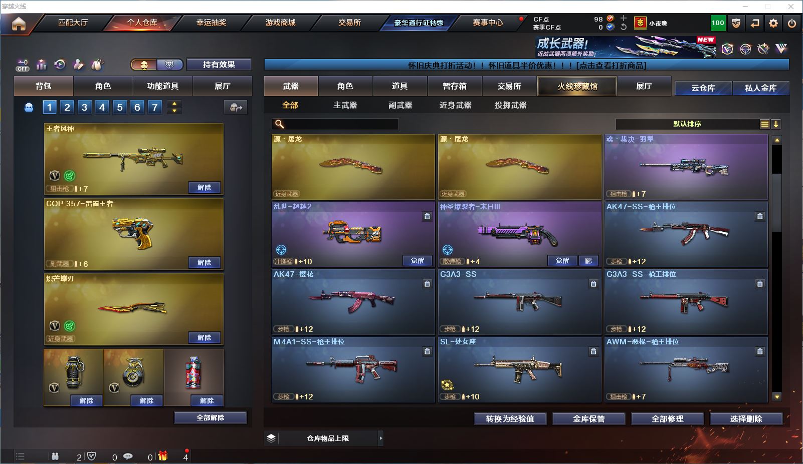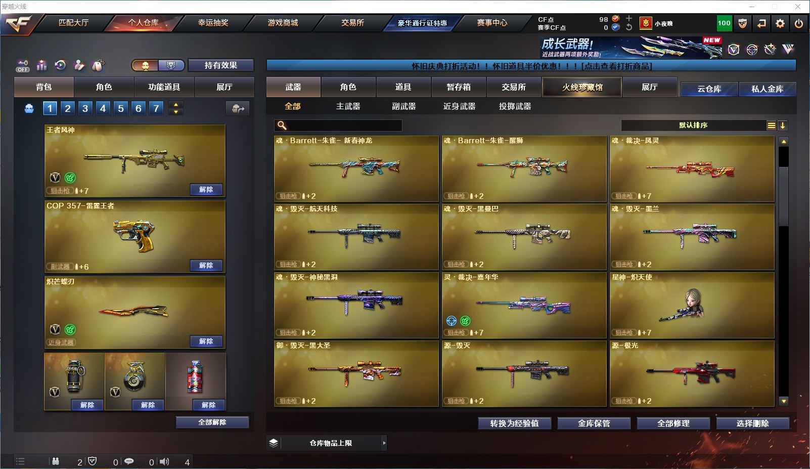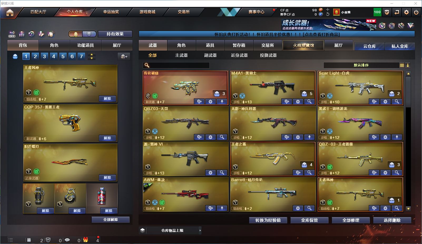 山东一区 vip6 42V 【传说武器!!!】【王者风神+传说破晓】【qbz03王者蔷薇】【星神炽天使】【白虎】【雷神+雷神音效卡】【裁决+异化之源】【黑骑士 qbz03天罚 无影神兵利器 黑武士锦绣游龙 源雷神VI 王者之鲨 巴雷特暗月传说 AA12雷霆】——【沙鹰修罗 沙鹰天神*6】——【炽芒蝶刃 屠龙 擎天 云龙扇】——【雷暴投掷武器套装 神工天巧投掷武器套装 云龙投掷武器套装*2 雷霆王者投掷武器套装】——【热门武器/小人枪】【王者风势 王者之势 炫金毁灭】——【角色】【4防(王者潘多拉 王者炫)】【机械及 晴雅】【截图展示段位不代表实际段位,如赛季更新等不可抗拒因素发生变化、时限道具不保证所剩时间、标题未写送cf点默认不送】更多武器角色道具详情看图 ⭐️买号看《无忧》 售后放心无忧⭐️