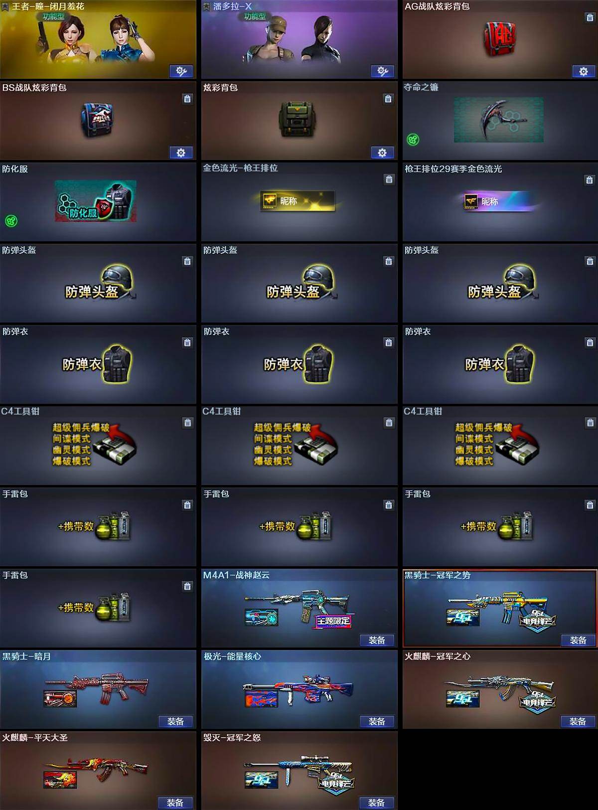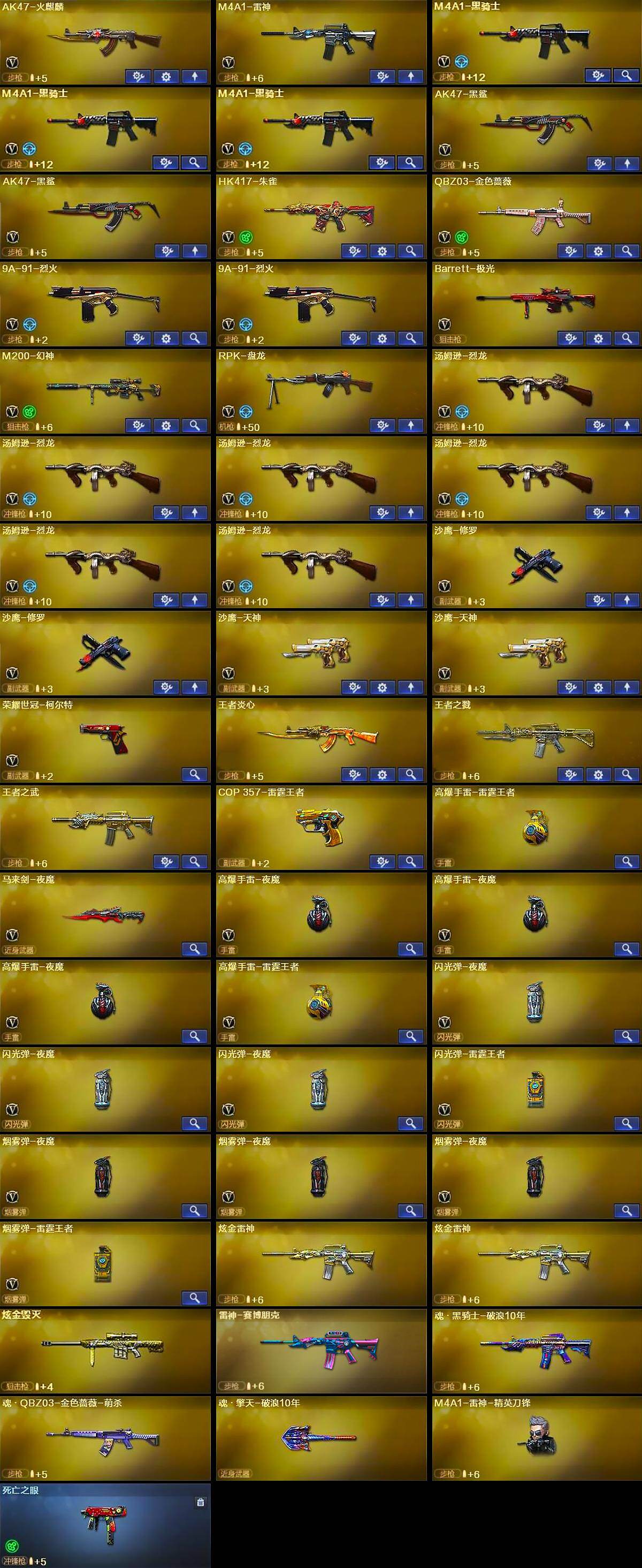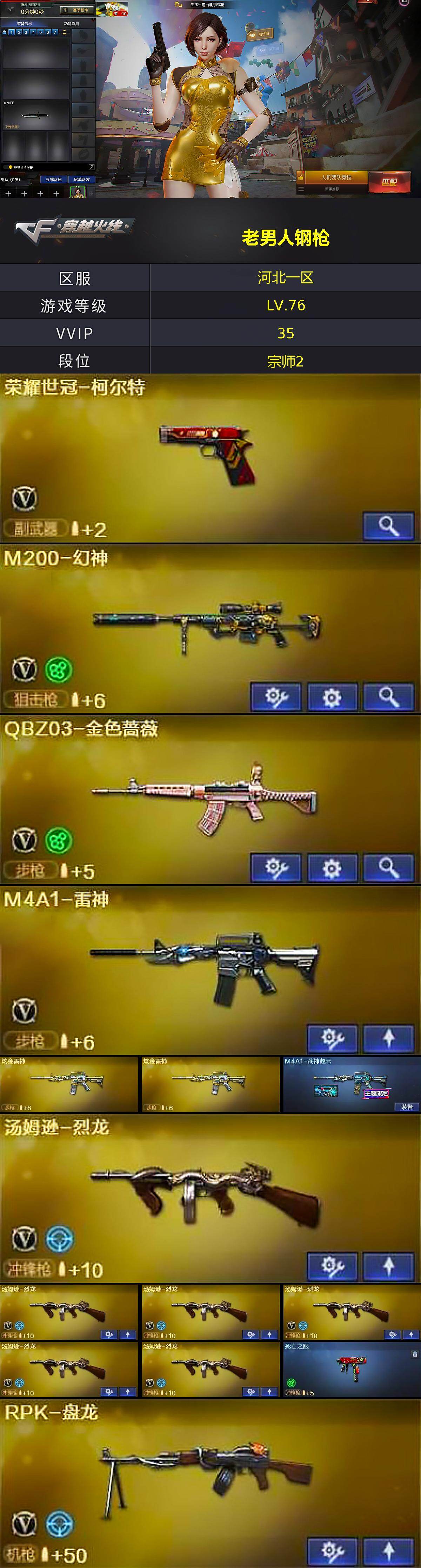 河北一区37V-7王者武器数-3炫金武器数 【热门武器】:QBZ03-金色蔷薇,HK417-朱雀,M200-幻神,死亡之眼,荣耀世冠-柯尔特,王者炎心,M4A1-黑骑士*3,汤姆逊-烈龙*6,RPK-盘龙,COP 357-雷霆王者,沙鹰-修罗*2 【王者炫金武器】:王者炎心,王者之戮,王者之武,COP 357-雷霆王者,高爆手雷-雷霆王者,炫金雷神*2,炫金毁灭 【皮肤】:M4A1-战神赵云,火麒麟-冠军之心,火麒麟-平天大圣,毁灭-冠军之怒,黑骑士-暗月,黑骑士-冠军之势,极光-能量核心 【角色】:王者-瞳-闭月羞花,潘多拉-X 【人偶武器】:M4A1-雷神-精英刀锋 【暴走生化】:死亡之眼 【英雄级武器】:AK47-火麒麟,M4A1-雷神,M4A1-黑骑士*3,AK47-黑鲨*2,HK417-朱雀,QBZ03-金色蔷薇,9A91-烈火*2,Barrett-极光,M200-幻神,RPK-盘龙,汤姆逊-烈龙*6,沙鹰-修罗*2,沙鹰-天神*2,荣耀世冠-柯尔特,马来剑-夜魔,高爆手雷-夜魔*3,高爆手雷-雷霆王者-觉醒版,闪光弹-夜魔*3,闪光弹-雷霆王者-觉醒版,烟雾弹-夜魔*3,烟雾弹-雷霆王者-觉醒版 【其他武器】:雷神-赛博朋克,魂·黑骑士-破浪10年,魂·QBZ03-金色蔷薇-萌杀,魂·毁灭-青帝*2,魂·擎天-破浪10年,魂·龙啸-秦师 【道具】:AG战队炫彩背包,BS战队炫彩背包,炫彩背包,夺命之镰,防化服,金色流光-枪王排位,枪王排位29赛季金色流光,防弹头盔*3,防弹衣*3,C4工具钳*3,手雷包*4 【特殊枪械】:3黑骑士,6烈龙,1盘龙