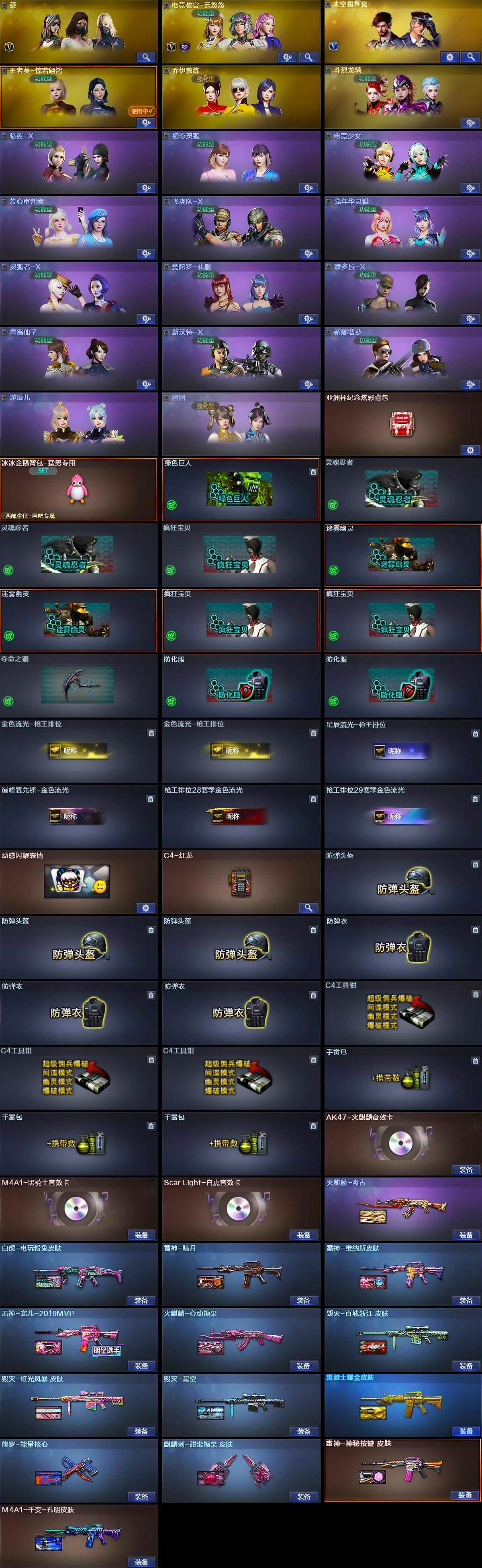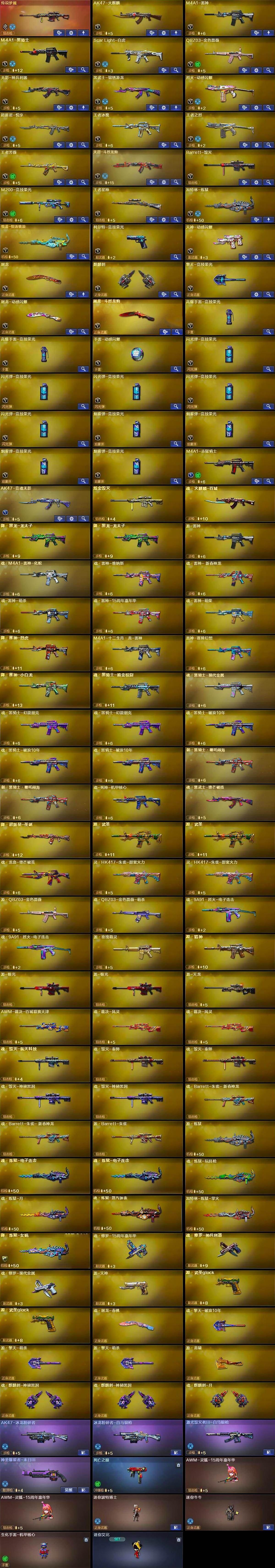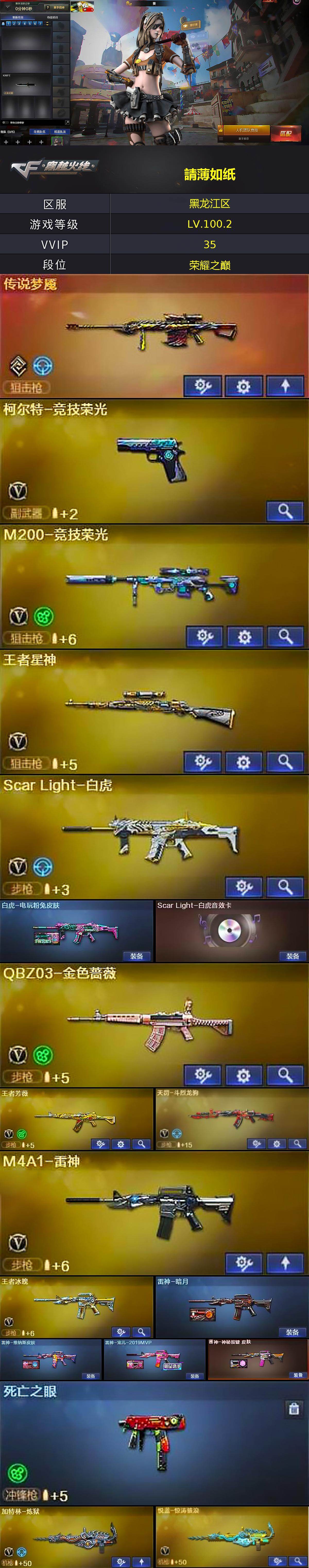 黑龙江区41V-6王者武器数-1炫金武器数 【传说武器】:传说梦魇 【热门武器】:传说梦魇,QBZ03-金色蔷薇,Scar Light-白虎,M200-竞技荣光,死亡之眼,金色小号,M4A1-黑骑士,加特林-炼狱 【王者炫金武器】:炫金毁灭 【音效卡】:AK47-火麒麟音效卡,M4A1-黑骑士音效卡,Scar Light-白虎音效卡 【皮肤】:白虎-电玩粉兔皮肤,雷神-暗月,雷神-宠儿-2019MVP,雷神-维纳斯皮肤,雷神-神秘按键 皮肤,火麒麟-盘古,火麒麟-心动糖果,毁灭-星空,毁灭-百城浙江 皮肤,毁灭-虹光风暴 皮肤,M4A1-千变-孔明皮肤,黑骑士耀金皮肤,修罗-能量核心,麒麟刺-甜蜜糖果 皮肤 【角色】:葵,电竞教官-云悠悠,太空指挥官,王者葵-惊若翩鸿,乔伊教练,斗烈龙骑,暗夜-X,初恋灵狐,电竞少女,芳心审判者,飞虎队-X,嘉年华灵狐,灵狐者-X,曼陀罗-礼服,潘多拉-X,青霞仙子,斯沃特-X,新娜塔莎,游珑儿,团团 【人偶武器】:AWM-灵狐-15周年嘉年华*2,迷你波特博士,迷你牛牛,生化手雷-机甲核心,迷你艾比,灵狐娃娃手雷*2 【暴走生化】:死亡之眼 【挑战大师】:AK47-冰龙粉碎者,冰龙粉碎者-白马银枪,激光毁灭者III-白马银枪,神圣爆裂者-末日III 【英雄级武器】:AK47-火麒麟,M4A1-雷神,M4A1-黑骑士,Scar Light-白虎,QBZ03-金色蔷薇,无影-神兵利器,黑武士-锦绣游龙,烈火-动感闪耀,超新星-悦享-觉醒版,王者冰魄-觉醒版,王者之烈-觉醒版,王者芳薇-觉醒版,天罚-斗烈龙驹,Barrett-毁灭,M200-竞技荣光,王者星神-觉醒版,加特林-炼狱,悦蓝-惊涛骇浪-觉醒版,柯尔特-竞技荣光,天神-动感闪耀,屠龙,麒麟刺,擎天-竞技荣光,屠龙-动感闪耀,屠龙-斗烈龙驹,高爆手雷-竞技荣光*2,手雷-动感闪耀,闪光弹-竞技荣光*5,烟雾弹-竞技荣光*4,M4A1-赤狱骑士,AK47-竞魂无影 【其他武器】:魂·火麒麟-百城,御·黑龙-龙太子*2,源·雷神,魂·M4A1-雷神-化蛇,魂·雷神-维纳斯,魂·雷神-新春神龙,魂-雷神-萌杀,魂·雷神-15周年嘉年华,魂·雷神-萌柴,御·雷神-机甲刑天*2,御·雷神-烈虎,M4A1-十二生肖·龙-雷神,雷神-赛博幻想,御·雷神-小白龙,魂·黑骑士-摸金校尉,魂·黑骑士-现代金属,魂·黑骑士-幻能朋克*2,魂·黑骑士-破浪10年*3,御·黑骑士·哪吒闹海*2,魂-死神-机甲核心,魂·黑武士-锋芒破茧,源·天启,御·超新星-圣诞,源·武圣*2,魂·龙血-锋芒破茧,灵·HK417-朱雀-甜蜜火力*2,源-金色蔷薇,魂·QBZ03-金色蔷薇-萌杀,魂·9A91·烈火-电子连击*2,源·玫瑰精灵,源·猎神,源-极光*2,源·天龙,AWM-裁决-百城联赛天津,魂·裁决-凤灵*2,魂·裁决-羽掣,魂·毁灭-航天科技,魂·毁灭-秦师*2,魂·毁灭-青帝*2,魂·毁灭-神秘黑洞*2,御·毁灭-黑大圣*2,魂·Barrett-朱雀- 新春神龙*2,源·Barrett-朱雀,源·炼狱,魂·炼狱-电子连击*2,魂·炼狱-玩具枪,魂·炼狱-月,魂·炼狱-蒸汽钟表,加特林-炼狱-掌火,御·炼狱-女娲,魂·修罗-15周年嘉年华,魂·修罗-神兵利器,魂·修罗-现代金属,源·天神,魂·天神-阿努比斯,源·武圣glock*2,魂·屠龙-春桃,魂·擎天-破浪10年,源·擎天-萌杀*2,源·龙啸,魂·麒麟刺-神秘黑洞*2,魂·麒麟刺-月 【道具】:亚洲杯纪念炫彩背包,冰冰企鹅背包-猛男专用,绿色巨人,灵魂忍者*2,变异宝贝,迷雾幽灵*2,疯狂宝贝*2,夺命之镰,防化服*2,金色流光-枪王排位*2,星辰流光-枪王排位,巅峰赛先锋-金色流光,枪王排位28赛季金色流光,枪王排位29赛季金色流光,动感闪耀表情,C4-红龙,防弹头盔*3,防弹衣*3,C4工具钳*3,手雷包*3 【特殊枪械】:1白虎,1黑骑士,1炼狱