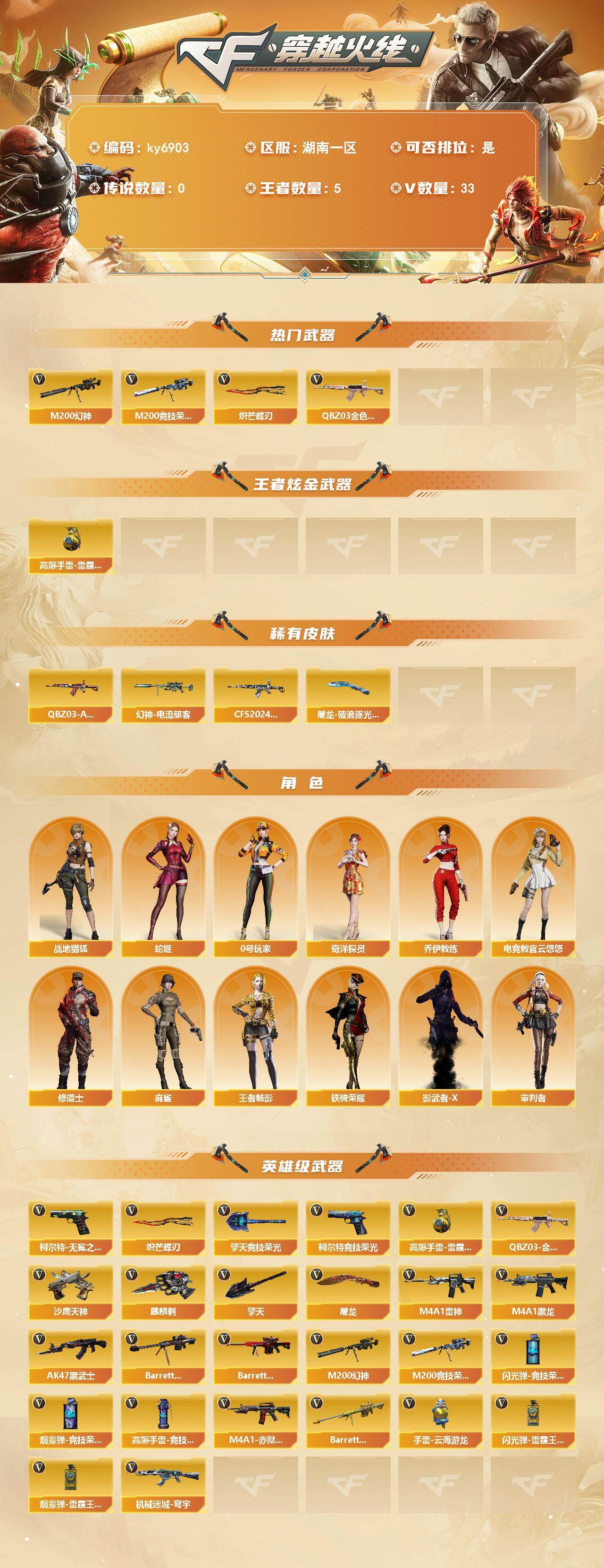 湖南一区37V-5王者武器数-0炫金武器数 【热门武器】:QBZ03-金色蔷薇,M200-幻神,M200-竞技荣光,炽芒蝶刃 【王者炫金武器】:高爆手雷-雷霆王者 【皮肤】:幻神-电流骇客 皮肤,QBZ03-AG-CFPLS19冠军,QBZ03-CFS2024 皮肤,屠龙-破浪逐光 皮肤*2 【角色】:电竞教官-云悠悠,审判者,战地猎狐,王者-魅影,奇洋探员,乔伊教练,修道士,0号玩家,麻雀,蛇姬,铁骑荣耀,影武者-X 【英雄级武器】:M4A1-黑龙,M4A1-雷神,AK47-黑武士,QBZ03-金色蔷薇,机械迷城-穹宇,Barrett-毁灭,Barrett-极光,M200-幻神,M200-竞技荣光,Barrett-雷霆王者-觉醒版,沙鹰-天神,柯尔特-无冕之王,柯尔特-竞技荣光*2,屠龙*2,擎天,麒麟刺,擎天-竞技荣光,炽芒蝶刃,高爆手雷-竞技荣光*4,手雷-云海游龙,高爆手雷-雷霆王者-觉醒版,闪光弹-竞技荣光*3,闪光弹-雷霆王者-觉醒版*2,烟雾弹-竞技荣光*3,烟雾弹-雷霆王者-觉醒版,M4A1-赤狱骑士 【其他武器】:源·火麒麟,源·雷神,魂·M4A1-雷神-化蛇,魂·雷神-诺拉,御·黑骑士·哪吒闹海,御·超新星-圣诞,源·机械迷城,M4A1-青龙-掌上穿越火线,魂·HK417-朱雀-凤灵*2,源-金色蔷薇,魂·QBZ03-金色蔷薇-蛇姬,QBZ03-文殊坊,魂·9A91·烈火-电子连击,源·天龙,魂·天龙-彼岸花,魂·裁决-凤灵,魂·裁决-羽掣,御·毁灭-黑大圣,源·Barrett-朱雀,灵·Barrett-朱雀-炫光,魂·炼狱-电子连击,魂·炼狱-蒸汽钟表,魂·修罗-神兵利器,魂·修罗-现代金属,魂·天神-宇航兔兔,灵·天神-穹宇,魂·屠龙-惊鸿,魂·擎天-破浪10年,魂·擎天-蒸汽钟表,魂·龙啸-秦师,魂·麒麟刺-月,灵·麒麟刺-穹宇 【道具】:CFS限定背包,亚洲杯纪念炫彩背包,奇洋探员-海龟背包,超级背包,黑桃战神背包,女皇终结者-魔龙之吻,救世主-黑桃战神,绿色巨人,灵魂忍者,迷雾幽灵,疯狂宝贝,夺命之镰,防化服*2,枪王排位28赛季金色流光,枪王排位29赛季金色流光,EP战队名片,EP战队喷图,防弹头盔*2,防弹衣*2,C4工具钳*2,手雷包*2 【特殊枪械】: