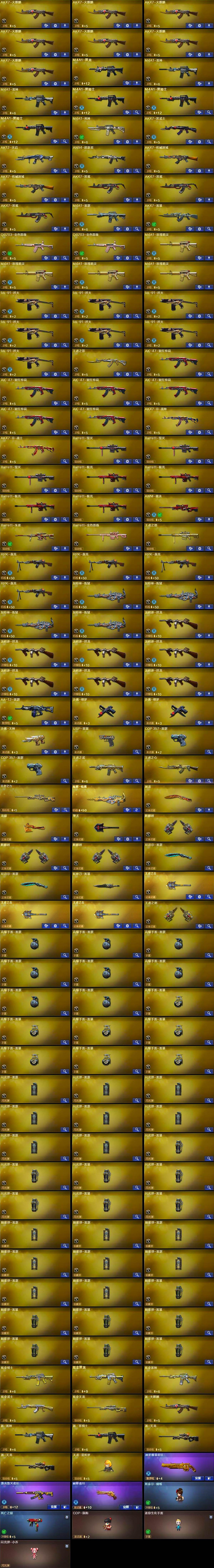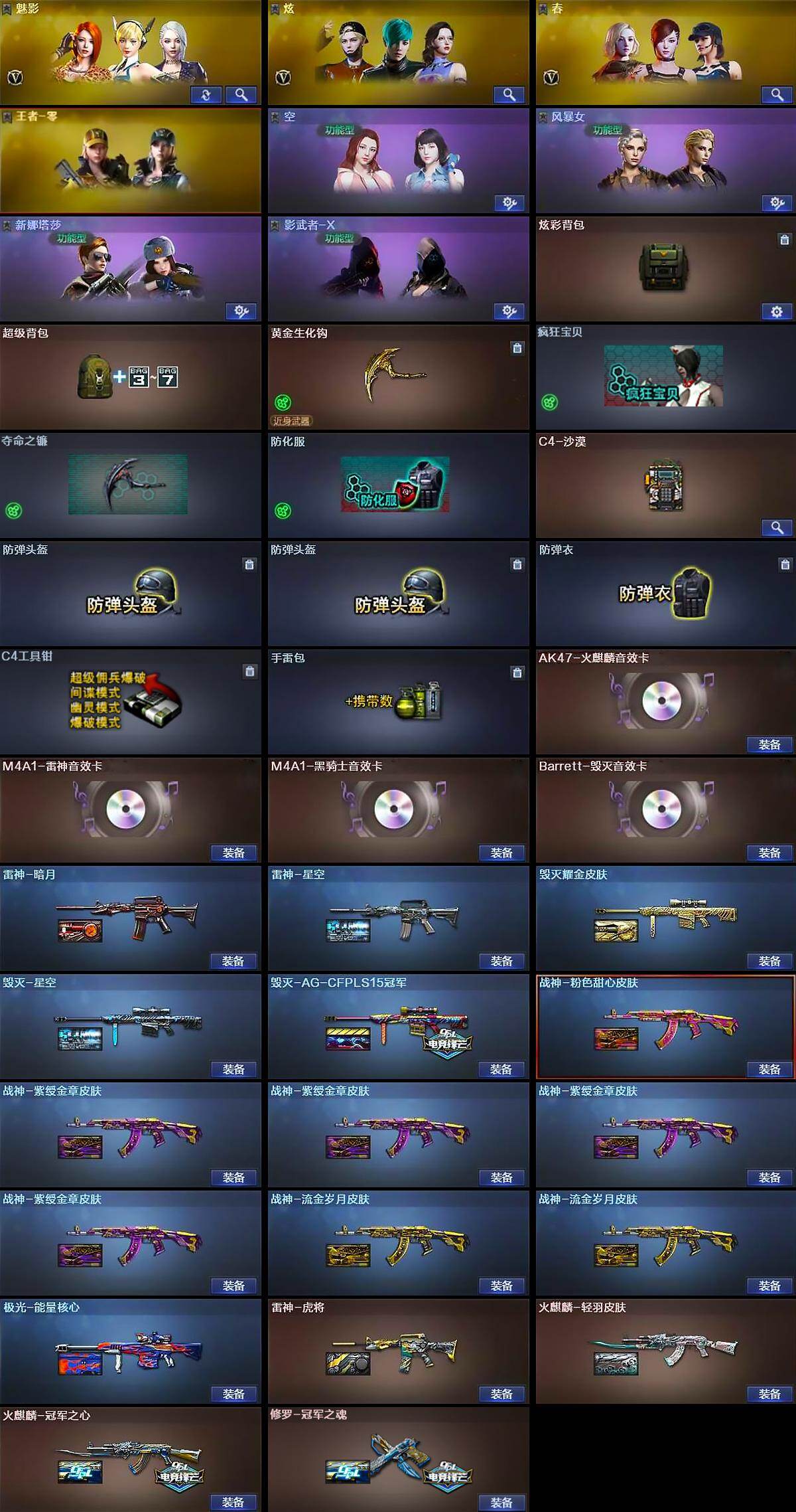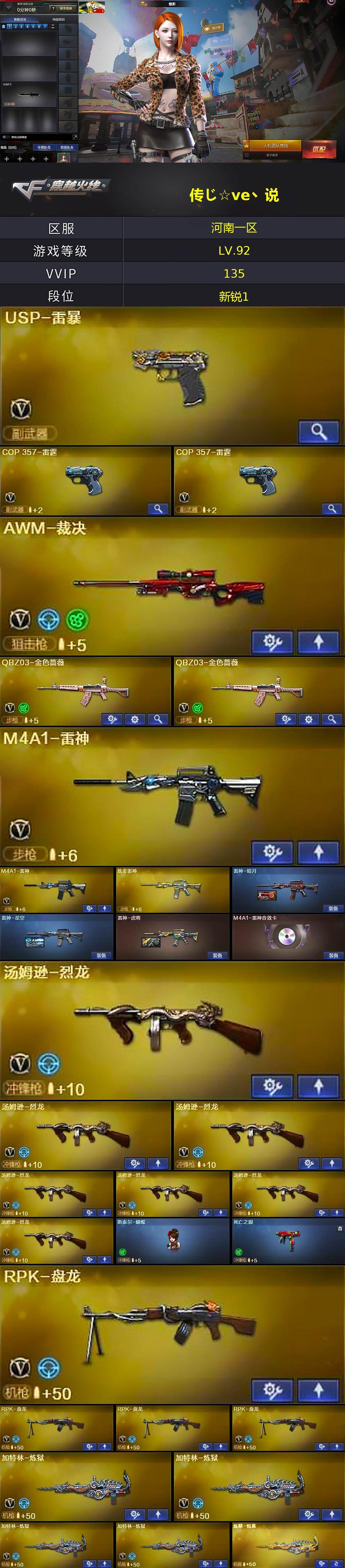 河南一区141V-10王者武器数-5炫金武器数 【热门武器】:QBZ03-金色蔷薇*2,死亡之眼,M4A1-黑骑士*3,汤姆逊-烈龙*7,RPK-盘龙*4,加特林-炼狱*4,斯泰尔-蝴蝶,降世魔童,USP-雷暴,沙鹰-修罗*2 【王者炫金武器】:王者之武,王者之心,王者之力,炼狱-悦蓝,炫金骑士,炫金黑龙,炫金雷神,炫金武士,炫金天龙 【音效卡】:AK47-火麒麟音效卡,M4A1-雷神音效卡,M4A1-黑骑士音效卡,Barrett-毁灭音效卡 【皮肤】:雷神-暗月,雷神-星空,雷神-虎将,火麒麟-冠军之心,火麒麟-轻羽皮肤,毁灭耀金皮肤,毁灭-星空,毁灭-AG-CFPLS15冠军,战神-粉色甜心皮肤,战神-紫绶金章皮肤*4,战神-流金岁月皮肤*2,极光-能量核心,修罗-冠军之魂 【角色】:魅影,炫,春,王者-零,空,风暴女,新娜塔莎,影武者-X 【人偶武器】:天龙-曼陀罗,斯泰尔-蝴蝶,COP-旗袍,迷你生化手雷,闪光弹-小乔,降世魔童 【暴走生化】:死亡之眼 【挑战大师】:神圣爆裂者III,激光毁灭者III,阐释者III 【英雄级武器】:AK47-火麒麟*7,M4A1-黑龙,M4A1-雷神*2,M4A1-黑骑士*3,M4A1-死神,AK47-黑武士,AK12-天启,AN94-超新星,AK47-机械迷城*2,AK47-黑鲨*3,M4A1-雷霆,AK47-雷暴,QBZ03-金色蔷薇*2,M4A1-玫瑰精灵*4,9A91-烈火*7,王者之影-觉醒版,AK-47-猩红传说*6,AK47-B-战神,AK47-B-战士,Barrett-毁灭*3,Barrett-极光*4,AWM-裁决,Barrett-朱雀,Barrett-金色蔷薇,王者之怒-觉醒版,RPK-盘龙*4,加特林-炼狱*4,汤姆逊-烈龙*7,AA-12-雷霆,沙鹰-修罗*2,沙鹰-天神,USP-雷暴,COP-雷霆*2,屠龙,龙啸,擎天,麒麟刺*3,尼泊尔-雷霆*2,斩神刀-雷暴,王者之击-觉醒版*3,王者之刺-觉醒版,高爆手雷-雷霆*8,高爆手雷-雷暴*7,闪光弹-雷霆*8,闪光弹-雷暴*7,烟雾弹-雷霆*8,烟雾弹-雷暴*7 【其他武器】:源·火麒麟,源·雷神,源·黑骑士,源·天启,源·天龙*2 【道具】:炫彩背包,超级背包,黄金生化钩,变异宝贝,夺命之镰,防化服,C4-沙漠,防弹头盔*2,防弹衣,C4工具钳,手雷包 【特殊枪械】:蝴蝶斯泰尔+6烈龙,3黑骑士,6烈龙,4盘龙,4炼狱,1蝴蝶斯泰尔
