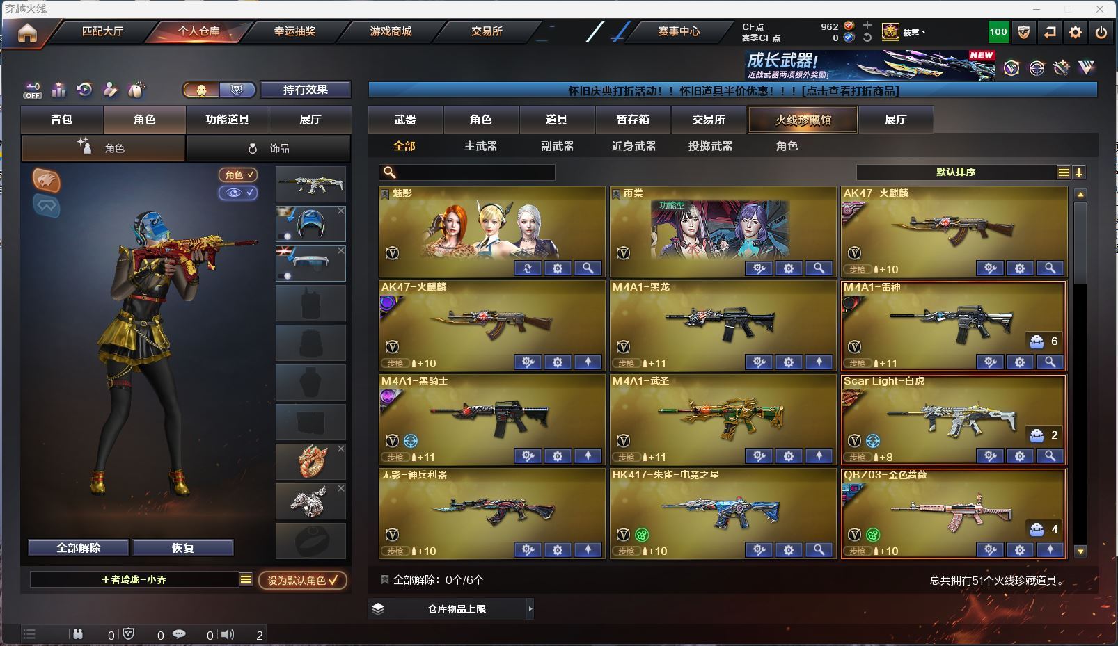 四川一区 vip6 51V 【M200幻神】【M200竞技荣光】【王者风神】【白虎+电玩粉兔皮肤+大汉风骨皮肤】【qbz03金色蔷薇+荣耀世冠白鲨皮肤】【荣耀世冠雷神】 【王者冰魄 王者之光 王者之决】【火麒麟+巅峰荣耀皮肤】【雷神+荣耀世冠AG皮肤】【毁灭+毁灭音效卡+CFS2018皮肤】【黑龙 黑骑士 武圣 无影神兵利器 朱雀电竞之星 9A91烈火 斩神 白虎电玩蓝兔 极光 源毁灭V 炼狱 2烈龙】——【沙鹰修罗 武圣 荣耀世冠柯尔特】——【屠龙 龙啸 麒麟刺 屠龙电竞之星 王者之击】——【竞技荣光投掷武器套装*4】——【热门武器/小人枪】【M4A1赤狱骑士 AK47竞魂无影 AWM昌龙 火麒麟灵狐 水枪不败狙神 星神长生圣莲】——【角色】【4防(王者葵貂蝉 王者零华冠丽服 王者玲珑小乔)】【雨棠 魅影】【截图展示段位不代表实际段位,如赛季更新等不可抗拒因素发生变化、时限道具不保证所剩时间、标题未写送cf点默认不送】更多武器角色道具详情看图 ⭐️买号《无忧》 售后放心无忧⭐️】