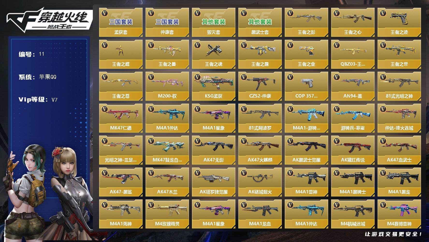 可二次苹果QQ 大师-7英雄角色数-238英雄武器数【29王者】【王者系列】:王者之影,王者之心,王者之迹,王者之蝶,王者之兽,王者之魂,王者之霆,王者之业,QBZ03-王者蔷薇,王者之誉,王者之尊【三国/其他套装】:黑武士套,毁灭套,仲康套,孟获套【万化皮肤】:M4A1-仲达-烽火连城,81式-光明之神-三足金乌,MK47鼓龙白昼,M4A1-游骑兵-寒霜,AK47-游骑兵-寒霜【热门武器】:M200-权,KSG-孟获,CZS2-仲康,COP 357-安琪拉,AN94-盖,81式-光明之神,MK47-仁德,M4A1-仲达,M4A1-星象,81式-阿波罗【角色】:关小雨*2,春节兰-X,零-新生,步练师,刀锋-枪战王者【英雄武器】:AK47-无影,AK47-火麒麟,AK47-黑武士觉醒,AK47-猩红传说,AK47-血武士,AK47-黑鲨,AK47-木兰,AK47-塔罗牌觉醒,AK47-谜城烟火,M4A1-雷神*2,M4A1-黑骑士,M4A1-黑龙,M4A1-死神,M4A1-玫瑰精灵,M4A1-星象,M4A1-龙血,M4A1-仲达,M4A1-机械迷城,M4A1-赛博雷神,M4A1-海骑士,M4A1-冰锋觉醒,M4A1-破空冰刃,M4A1-堕天神,M4A1-心动次元,M4A1-运输船,M4A1-猎神,M4A1-夏清,M4A1-太白诗仙,M4A1-铁胆虎魄,QBZ95-天使,SCAR-幽暗骑士,SCAR Light-白虎,SCAR-心动PICK,剑齿虎,AN94-超新星,剑齿虎-炫彩,AN94-赳赳秦师,AN94-精卫填海,AN94-盖,AUG-机械纪元,FAMAS-湮灭,9A91-天神,9A91-魔蜥觉醒,M14EBR-天神,M14EBR-拂影,M14EBR-葫芦山庄,AK12-天启,QBZ03-湮灭,QBZ03-金色蔷薇,QBZ03-死神,QBZ03-玉面羞花,HK416-极光,HK417-炎龙铠甲*2,81式-光明之神,QBZ19-天使,G36-机械纪元,G36-竞技战魂,G36-李星云,MK47-仁德,G3A3-五色琉璃觉醒,G3A3-衍神兵,FN F2000-十绝阵觉醒,QBZ97-浩瀚征途,QBZ191-封神榜,QBZ191-帝皇铠甲,AK103-湮灭,SBR-湮灭,AWM-天龙,AWM-裁决,AWM-天使,AWM-指南针觉醒,AWM-指南针,AWM-大湾溢彩,巴雷特-毁灭,巴雷特-极光*4,巴雷特-金色蔷薇,巴雷特-朱雀,M200-权,09式狙-天神,98K-黑骑士,98K-血月,98K-星神,MR1-幽暗骑士,MR1-竞技战魂,TAC-雷暴,GM6-逆骨,VSK-94-九黎兵主觉醒,RPK-盘龙,RPK-美杜莎,加特林-堡垒,刘易斯-血月,QBB95-再战涿鹿,MK5-极光,汤姆逊-烈龙,寒霜烈龙,双持斯泰尔-天使,各种道具详情看截图、低价出售找回包 赔、截图展示段位不代 表实际段位,如赛季更新等不可抗拒因素发生变化、时限道具不保证所剩时间、标题未写送点劵默认不送【卖号买号首选亿梦】