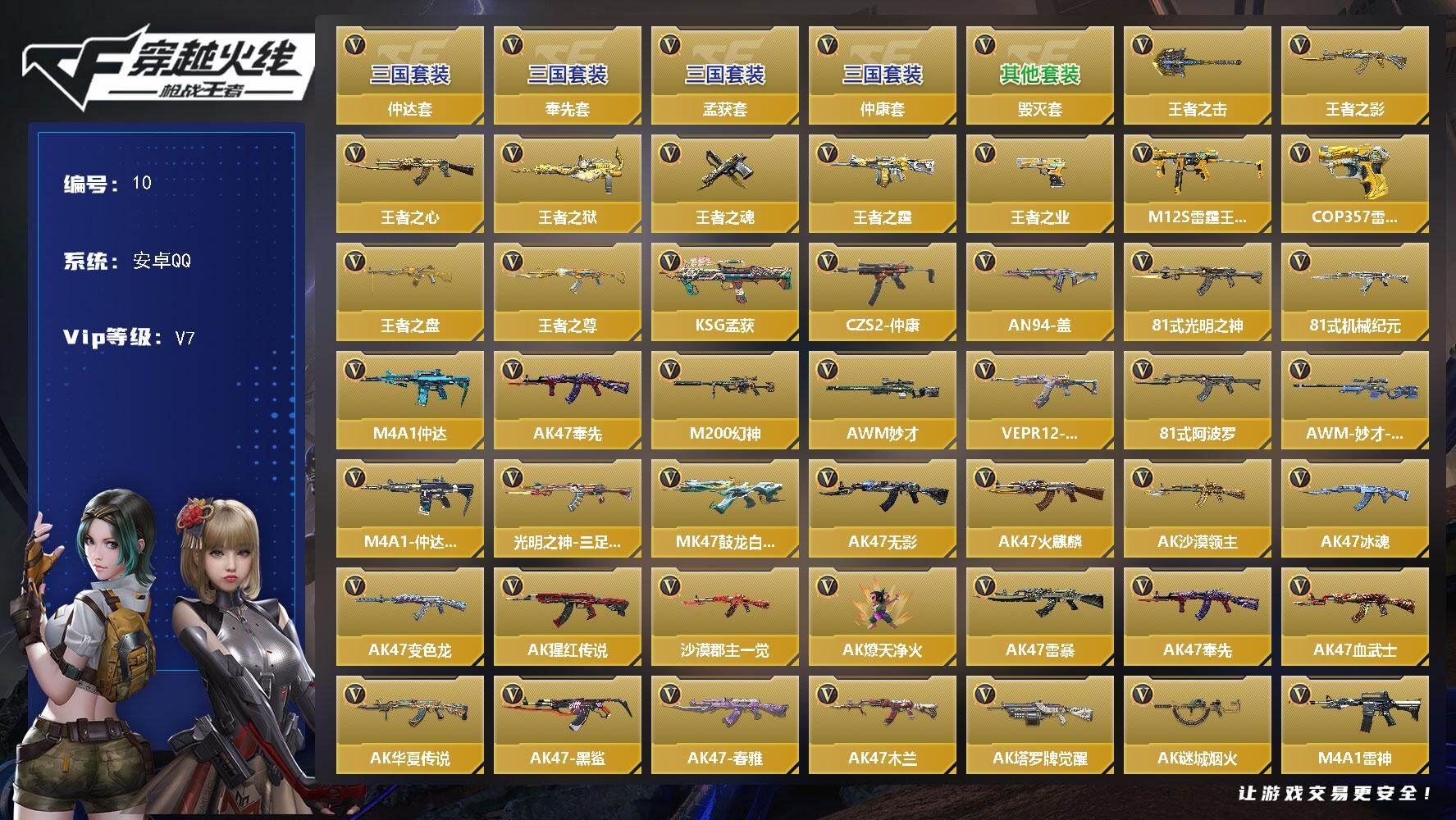 可二次安卓QQ 专家S-10英雄角色数-404英雄武器数【26王者】【王者系列】:王者之击,王者之影,王者之心,王者之狱,王者之魂,王者之霆,王者之业,M12S-雷霆王者,COP 357-雷霆王者,王者之盘,王者之尊【三国/其他套装】:毁灭套,仲达套,奉先套,孟获套,仲康套【万化皮肤】:AWM-妙才-过载,M4A1-仲达-过载,MK47鼓龙白昼,81式-光明之神-三足金乌【热门武器】:KSG-孟获,CZS2-仲康,AN94-盖,81式-光明之神,81式-机械纪元,M4A1-仲达,AK47-奉先,M200-幻神,AWM-妙才,VEPR12-宙斯,81式-阿波罗【角色】:萝拉,关小雨,职场灵狐-赛事经理,甄梦,炽天使-X,零-新生,步练师,刀锋-枪战王者,魅影【英雄武器】:AK47-无影*2,AK47-火麒麟*2,AK47-沙漠领主*2,AK47-冰魂,AK47-变色龙,AK47-猩红传说,AK47-沙漠郡主-一觉,AK47-燎天净火,AK47-雷暴,AK47-奉先,AK47-血武士,AK47-华夏传说,AK47-黑鲨,AK47-春雅,AK47-木兰*3,AK47-塔罗牌觉醒,AK47-谜城烟火*2,M4A1-雷神*2,M4A1-黑骑士,M4A1-死神*2,M4A1-玫瑰精灵,M4A1-卧龙觉醒,M4A1-樱龙·二觉,M4A1-仲达,M4A1-赛博雷神,M4A1-海骑士,M4A1-冰锋觉醒,M4A1-堕天神,M4A1-心动次元,M4A1-运输船*2,M4A1-猎神,M4A1-夏清,M4A1-千变*2,M4A1-太白诗仙,SCAR-幽暗骑士,SCAR Light-白虎,SCAR-探星者*3,SCAR-印刷术,SCAR-心动PICK,AN94-卷帘大将军,AN94-赳赳秦师,AN94-盖,AUG-机械纪元,FAMAS-湮灭,9A91-天神,9A91-魔蜥觉醒,M14EBR-暗夜觉醒,M14EBR-拂影,AK12-天启,QBZ03-金色蔷薇,QBZ03-死神,QBZ03-玉面羞花,HK416-极光,HK417-炎龙铠甲*2,81式-机械纪元,81式-光明之神,QBZ19-天使,G36-李星云,MK47-云舞,SKS-美杜莎,G3A3-衍神兵,FN F2000-十绝阵觉醒,QBZ191-金甲虎啸觉醒,QBZ191-封神榜,QBZ191-帝皇铠甲,AK103-湮灭,SBR-湮灭,AWM-天龙*2,AWM-妙才,AWM-竞界荣光,AWM-裁决,AWM-天使,AWM-指南针觉醒,AWM-指南针,AWM-大湾溢彩,巴雷特-毁灭*6,巴雷特-极光*6,巴雷特-雷神,巴雷特-枪娘,巴雷特-冬灭觉醒*2,暗杀星,M200-幻神,M200-心动次元觉醒,09式狙-天神*3,98K-黑骑士*2,98K-血月,98K-星神,TAC-晴舞,TAC-雷暴,VSK-94-九黎兵主觉醒,VSK-94-金蚀,加特林-堡垒*4,加特林-炼狱,加特林-堡垒觉醒,加特林-星际战舰,KAC-变色龙,刘易斯-天使,MG36-魔礼青,QBB95-极光,QBB95-再战涿鹿,MK5-机械纪元,MK5-极光,MK5-魔鲲,汤姆逊-烈龙*5,寒霜烈龙,双持斯泰尔-天使*3,斯泰尔-恶魔,QCW05-变形金刚·大黄蜂,A180-地狱凤凰,CBJ-MS-毒蜂,CZS2-善财童子,CZS2-心动次元,CZS2-血月,CZS2-仲康,PP19野牛-造纸术,DDM4-PDW-星际宇航觉醒,VEPR12-宙斯,打击者-天神,地狱火*4,地狱烈炎,AA12-竞界荣光,AA12-火药觉醒,亡命之徒-鬼魅双生,KSG-天蓬元帅,KSG-火力竞放,KSG-极光*2,KSG-孟获,KSG-钟馗觉醒,各种道具详情看截图、低价出售找回包 赔、截图展示段位不代 表实际段位,如赛季更新等不可抗拒因素发生变化、时限道具不保证所剩时间、标题未写送点劵默认不送【卖号买号首选亿梦】