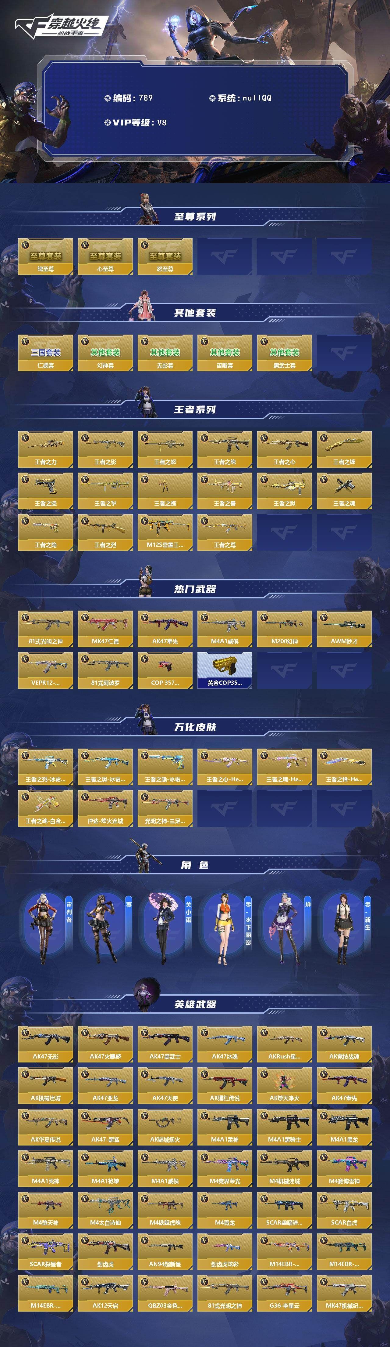 可二次QQ 【枪战王者iOS】枪皇-8英雄角色数-239英雄武器数【王者系列】:王者之力,王者之影,王者之怒,王者之魄,王者之心*2,王者之锋,王者之迹,王者之掣,王者之蝶,王者之兽,王者之狱,王者之魂,王者之隐*2,王者之烈,M12S-雷霆王者,王者之尊【热门武器】:81式-光明之神,MK47-仁德,AK47-奉先,M4A1-威侯,M200-幻神,AWM-妙才,VEPR12-宙斯*2,81式-阿波罗,COP 357-堕天神*2,黄金COP 357*2【角色】:审判者,葵,关小雨*2,零-水下丽影,蝉,零-新生【英雄武器】:AK47-无影*2,AK47-火麒麟,AK47-黑武士,AK47-冰魂,AK47-Rush-星速,AK47-竞技战魂,AK47-机械迷城,AK47-亚龙,AK47-天使,AK47-猩红传说,AK47-燎天净火,AK47-奉先,AK47-华夏传说,AK47-黑鲨,AK47-谜城烟火,M4A1-雷神*2,M4A1-黑骑士*2,M4A1-黑龙,M4A1-死神*3,M4A1-枪娘,M4A1-威侯,M4A1-竞界荣光,M4A1-机械迷城,M4A1-赛博雷神,M4A1-堕天神,M4A1-太白诗仙,M4A1-铁胆虎魄,M4A1-青龙,SCAR-幽暗骑士,SCAR Light-白虎,SCAR-探星者,剑齿虎,AN94-超新星,剑齿虎-炫彩,M14EBR-拂影,M14EBR-玄武,M14EBR-葫芦山庄,AK12-天启*2,QBZ03-金色蔷薇,81式-光明之神,G36-李星云,MK47-机械纪元,MK47-云舞,MK47-仁德,G3A3-衍神兵,QBZ97-岚舞,AK103-湮灭,AWM-天龙*2,AWM-妙才,AWM-裁决,巴雷特-毁灭*4,巴雷特-极光*5,暗杀神,M200-幻神,M200-心动次元觉醒,09式狙-天神,98K-血月,98K-星神,MR1-龙吟惊沧海,TAC-晴舞,RPK-赤炎盘龙,加特林-堡垒,加特林-炼狱,刘易斯-血月,QBB95-极光,MK5-机械纪元,MK5-极光,汤姆逊-烈龙*3,寒霜烈龙,王者之烈,双持斯泰尔-天使*3,QCW05-未来战士,QCW05-变形金刚·大黄蜂,CZS2-心动次元,M12S-雷霆,VEPR12-宙斯*2,地狱火*2,嗜血金鲨,地狱烈炎,KSG-火力竞放,M1887-幽冥玄喵觉醒,Origin12-机变奇蛇觉醒,USP-机械迷城,USP-仁德,沙鹰-修罗*4,沙鹰-无影,沙鹰-宇航兔兔,左轮-黑武士,改装GLOCK-黑龙,GLOCK18-宙斯,COP 357-堕天神*2,双管猎枪-威侯,柯尔特-仲达,MK23-幻神,白骨利刃,墨刃-幻神,雌雄双股剑,炽芒蝶刃,清刚-觉醒,龙啸*3,战斧-无影,龙啸-堕天神,手斧-机械迷城,屠龙*10,尼泊尔-机械纪元,麒麟刺,星芒,黑龙刺,马来剑-毁灭*2,雷霆权杖-宙斯,擎天*2,擎天觉醒,死神手雷*5,火麒麟手雷,王者之心手雷,黑武士手雷,王者之兽手雷*3,高爆手雷-无限,高爆手雷-幻灵,死神闪光弹*4,黑武士闪光弹*2,王者之影闪光弹,王者之翼闪光弹,闪光弹-游骑兵*2,王者之心闪光弹*2,黑骑士闪光弹,王者之势闪光弹,火麒麟闪光弹,王者之兽闪光弹*2,闪光弹-雷霆王者,死神烟雾弹*3,黑武士烟雾弹,王者之影烟雾弹,烟雾弹-游骑兵*2,王者之翼烟雾弹,王者之心烟雾弹*2,王者之势烟雾弹,火麒麟烟雾弹*2,烟雾弹-雷暴,王者之兽烟雾弹*2,烟雾弹-雷霆王者,烟雾弹-遁天梭-重山盾,烟雾弹-幻灵,燃烧弹-游骑兵*7【至尊系列】:魄至尊,心至尊,怒至尊【万化皮肤】:王者之隐-冰霜奇迹,王者之锋-HeartShot,王者之心-HeartShot,王者之魄-HeartShot,81式-光明之神-三足金乌,M4A1-仲达-烽火连城,王者之戮-冰霜奇迹,王者之魂-白金血钻,王者之翼-冰霜奇迹【三国/其他套装】:黑武士套,无影套,幻神套,宙斯套,仁德套 各种道具详情看截图、低价出售找回包 赔、截图展示段位不代 表实际段位,如赛季更新等不可抗拒因素发生变化、时限道具不保证所剩时间、标题未写送点劵默认不送【卖号买号首选亿梦】