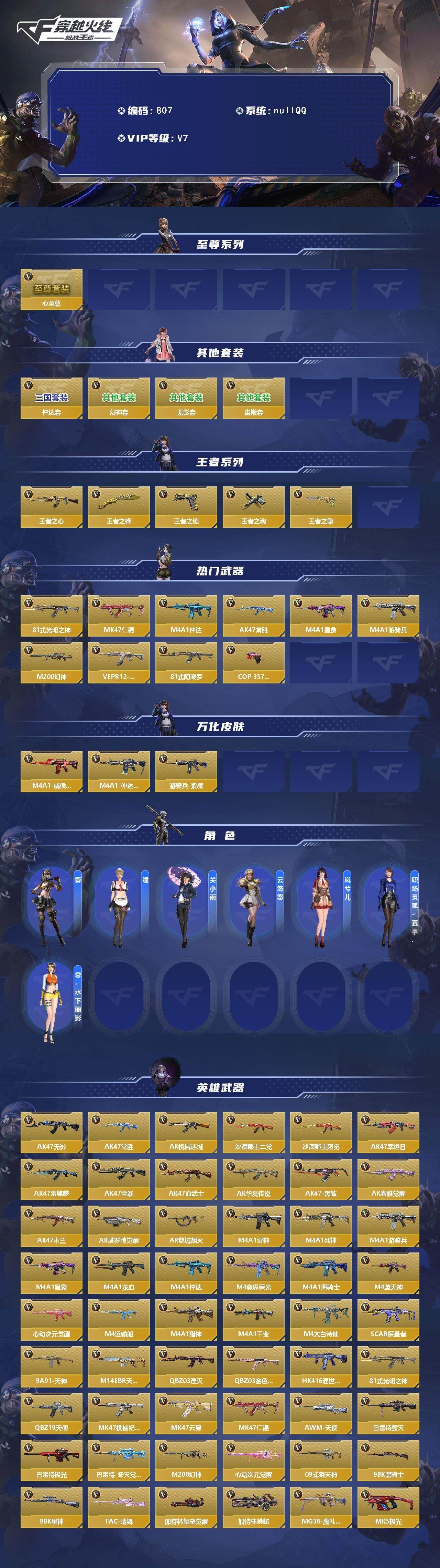 可二次苹果qq,专家S-7英雄角色数-240英雄武器数【王者系列】:王者之心,王者之锋,王者之迹,王者之魂,王者之隐【热门武器】:81式-光明之神,MK47-仁德,M4A1-仲达,AK47-常胜,M4A1-星象,M4A1-游骑兵,M200-幻神,VEPR12-宙斯,81式-阿波罗,COP 357-堕天神【角色】:葵,瞳,关小雨,云悠悠,岚兮儿,职场灵狐-赛事经理,零-水下丽影【至尊系列】:心至尊【三国/其他套装】:无影套,宙斯套,仲达套,幻神套【万化皮肤】:M4A1-威侯-屈魔,M4A1-游骑兵-紫魇,M4A1-仲达-过载【英雄武器】:AK47-无影,AK47-常胜,AK47-机械迷城,AK47-沙漠郡主-二觉,AK47-沙漠郡主-超觉,AK47-幸运日,AK47-雷麒麟*2,AK47-雷暴,AK47-血武士*2,AK47-华夏传说,AK47-黑鲨,AK47-春雅觉醒,AK47-木兰*2,AK47-塔罗牌觉醒,AK47-谜城烟火,M4A1-雷神*2,M4A1-死神,M4A1-游骑兵,M4A1-星象,M4A1-龙血,M4A1-仲达,M4A1-竞界荣光,M4A1-海骑士,M4A1-堕天神,M4A1-心动次元觉醒,M4A1-运输船*2,M4A1-猎神,M4A1-千变,M4A1-太白诗仙,SCAR-探星者*2,9A91-天神,M14EBR-天神,QBZ03-湮灭,QBZ03-金色蔷薇*3,HK416-混世行者,81式-光明之神,QBZ19-天使,MK47-机械纪元,MK47-云舞*2,MK47-仁德,AWM-天使,巴雷特-毁灭*6,巴雷特-极光,巴雷特-冬灭觉醒,M200-幻神,M200-心动次元觉醒,09式狙-天神*2,98K-黑骑士,98K-星神,TAC-晴舞,加特林-堡垒觉醒,加特林-蟒蛇,MG36-魔礼青,MK5-极光*2,汤姆逊-烈龙,双持斯泰尔-天使,QCW05-变形金刚·大黄蜂,CZS2-心动次元觉醒,CZS2-血月,M12S-雷霆,PP19野牛-造纸术觉醒,VEPR12-宙斯,地狱火*2,地狱烈炎,毁灭征服者-超越Max,AA12-火药*2,KSG-火力竞放,KSG-火力竞放觉醒,USP-神罚*3,USP-雷暴*2,沙鹰-修罗,沙鹰-波塞冬,沙鹰-冰锋觉醒,左轮-竞界荣光,蟒蛇-火力竞放觉醒,改装GLOCK-黑龙,GLOCK18-宙斯,GLOCK18-猎神,COP 357-堕天神,QSZ92-华夏传说,柯尔特-仲达,柯尔特-伏刹山海觉醒,CZ75-穷奇,MK23-幻神,蝴蝶刀-极光,白骨利刃,墨刃-幻神,蝴蝶刀-天神,龙啸,血阳*4,秋逸觉醒,屠龙*3,血月,尼泊尔-机械纪元,尼泊尔-竞界荣光*2,穷奇铁扇,龙鳞-觉醒,麒麟刺-堕天神,马来剑-毁灭*4,唐刀-华夏传说,雷霆权杖-宙斯,唐刀-大唐荣耀*2,丛林匕首-火力竞放觉醒,丛林匕首-庆龙觉醒,迷你究极泰坦,死神手雷,火麒麟手雷,王者之心手雷*5,黑骑士手雷,机械纪元手雷,黑武士手雷,高爆手雷-雷暴,王者之圣手雷,王者之兽手雷,高爆手雷-无限*2,死神闪光弹,黑武士闪光弹,王者之影闪光弹,幻兽闪光弹,王者之心闪光弹*5,黑骑士闪光弹,火麒麟闪光弹,闪光弹-雷暴,王者之圣闪光弹,王者之兽闪光弹,死神烟雾弹,黑武士烟雾弹,王者之影烟雾弹,幻兽烟雾弹,王者之心烟雾弹*5,黑骑士烟雾弹,火麒麟烟雾弹,烟雾弹-雷暴,王者之圣烟雾弹,王者之兽烟雾弹,燃烧弹-游骑兵*6,各种道具详情看截图、低价出售找回包 赔、截图展示段位不代 表实际段位,如赛季更新等不可抗拒因素发生变化、时限道具不保证所剩时间、标题未写送点劵默认不送【卖号买号首选亿梦】