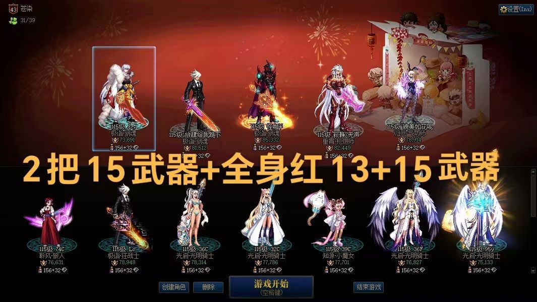 跨2 k661 26新春30套,收集箱满。26双尊双15剑帝,武器强化15,耳环增幅红15,5件13,5件12,7777技攻,黑牙黄金乡毕业,秘宝左槽,模拟152亿,镜花水月。26双尊红12-13龙透正义审判,7777技攻。26双尊红12龙透大枪,7777机会,混4件11。25双尊红11-13刃影。红11旅人、奶枪、蓝拳(差2件)