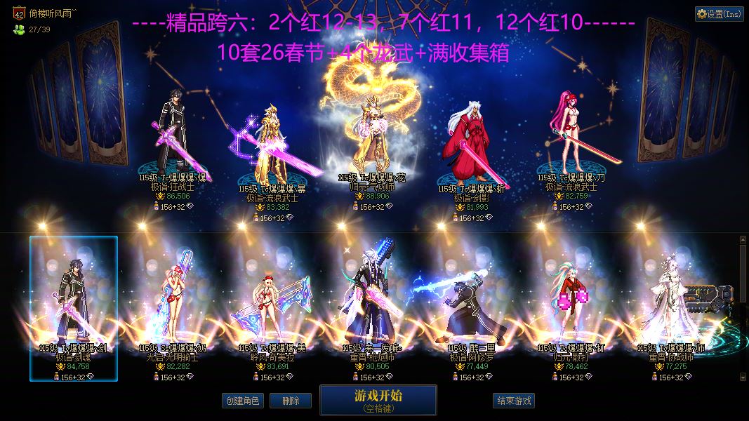 g21771辽宁一 (新春充值拉满 已买10套2026春节)完美红13龙透双尊剑神(灭龙剑 四太初毕业),完美红12龙透双尊魔神(武器耳环红13+3.4技工),完美红12龙透剑帝,完美红12龙透刃影(武器红13 特殊红13),完美红12龙透散打,红11 12修罗,完美红11龙透奶妈(耳环红12),完美红11 12龙袍奶爸,完美红11 12旅人,完美红11 12龙袍女鬼,完美红11 12龙透弹药,红11 12龙透散打,完美红11 12修罗,完美红11小魔女,完美红11缪斯,892分!