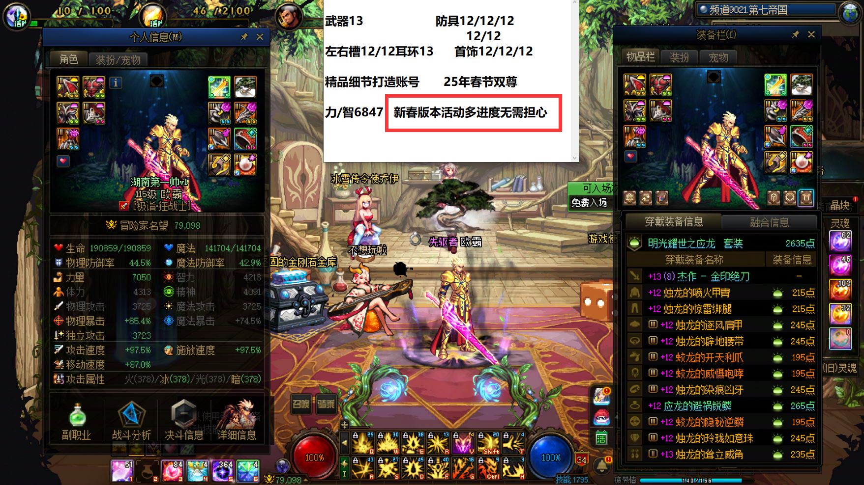 度湖南一区【25年3个双尊】【2个增幅12+1个增幅11+3个10】新春版本活动超多!进度无需担心【强者无需多言】25年双尊武器耳环增幅13其余完美增幅12细节打造齐全英雄王魔神+25年双尊武器耳环13全身12细节打造齐全女气功+25年双尊武器腰带耳环12其余11修罗!后面三个增幅10小号!都是好职业!要C有C要奶有奶!现在入手1月8号直接开荒野猪!真正的好玩不累大佬账号!喜欢千万别错过!