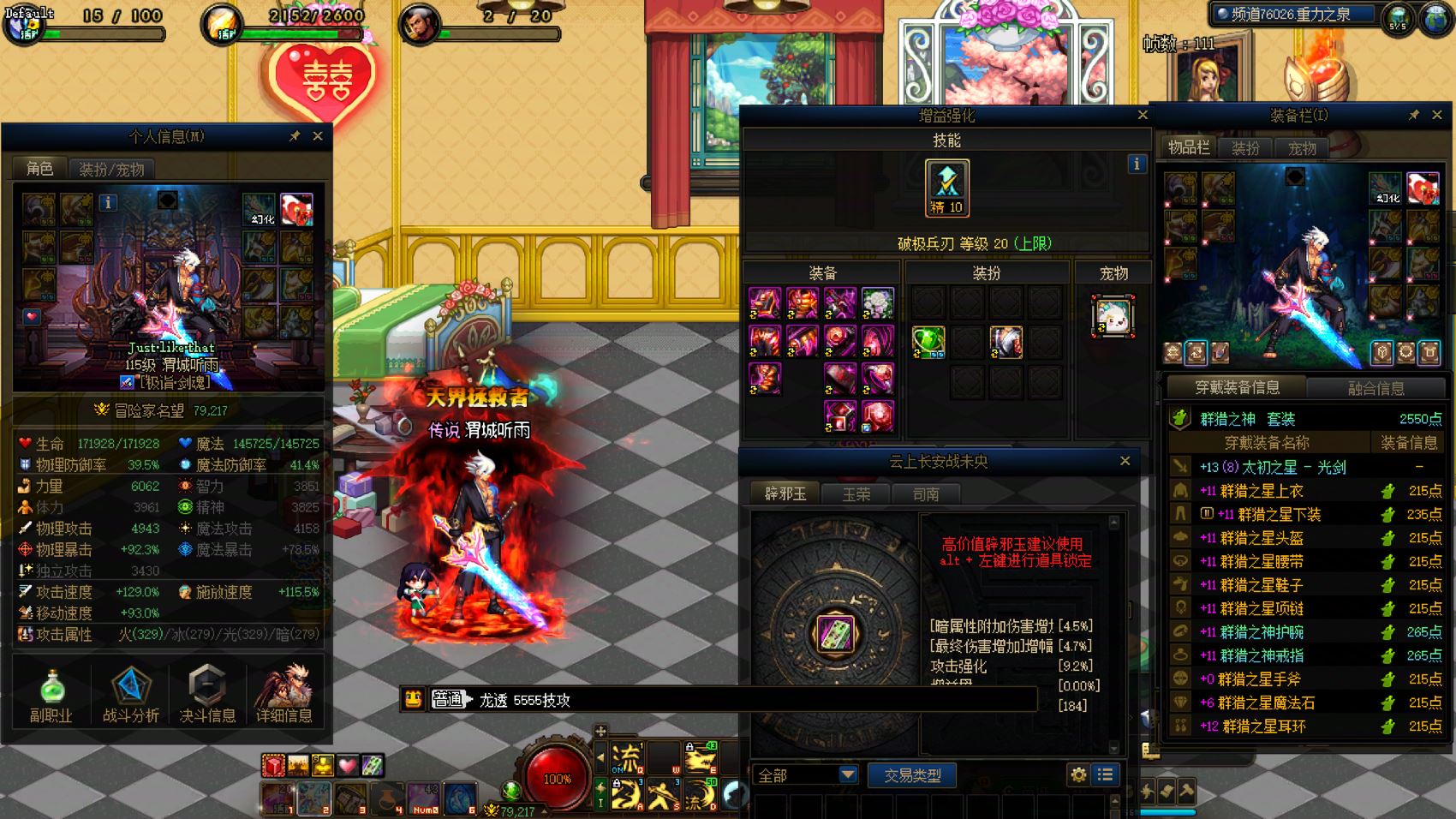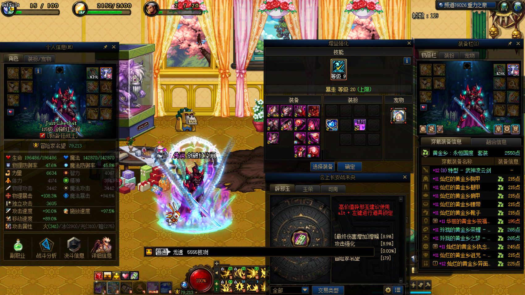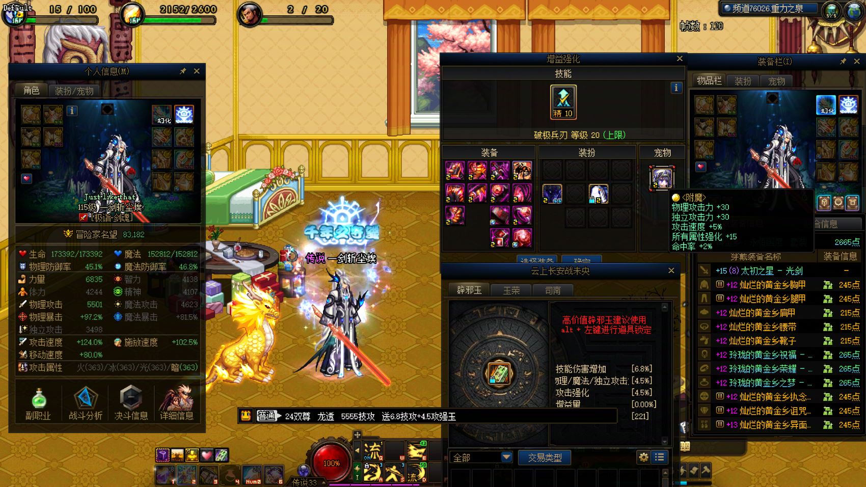 跨2 课 1个12、5个11,7套龙袍。24双尊红12-13龙透剑魂,武器强化15,5555技攻,送6.8技攻+4.5攻强玉,四太初毕业。红11阿修罗、魔神、剑魂、奶妈、剑魂(缺2件)