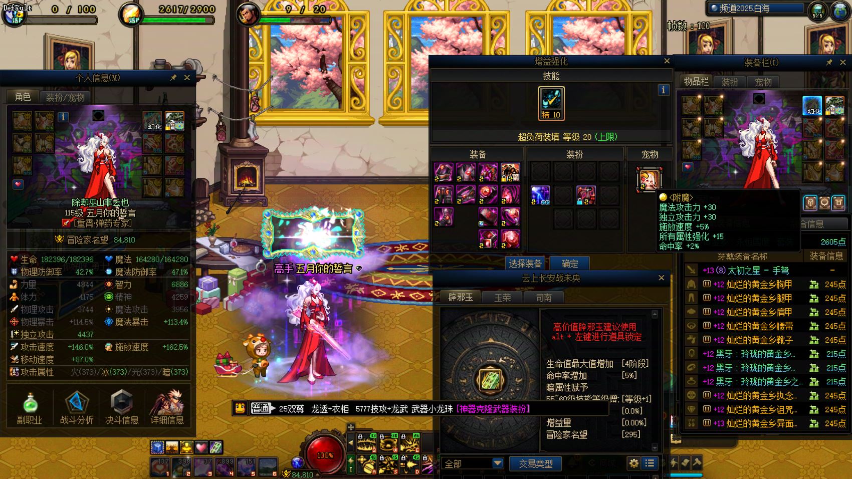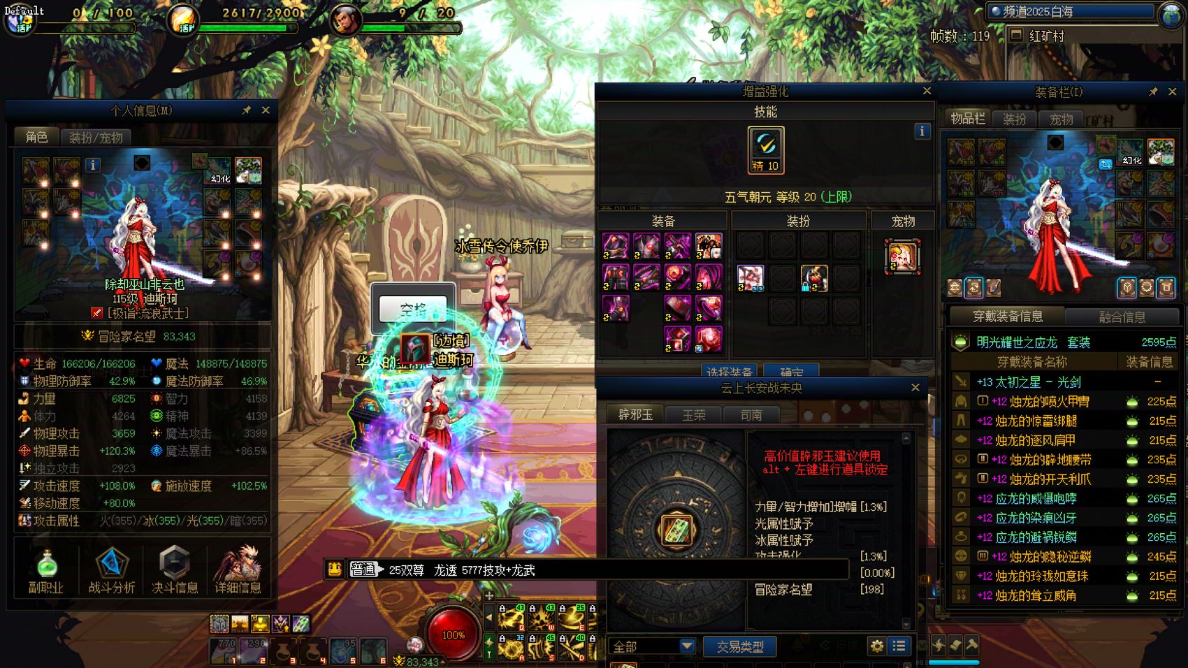 跨6 课 16套国庆,2个龙武。25双尊红12-13龙透衣柜女弹药,5777技攻+龙武,4太初毕业,三件太初黄金乡黑牙升级完毕,武器小龙珠附魔,一等一幻神职业。25双尊红12龙透剑帝,5777技攻+龙武。外加几个战败,具体看截图,细节看