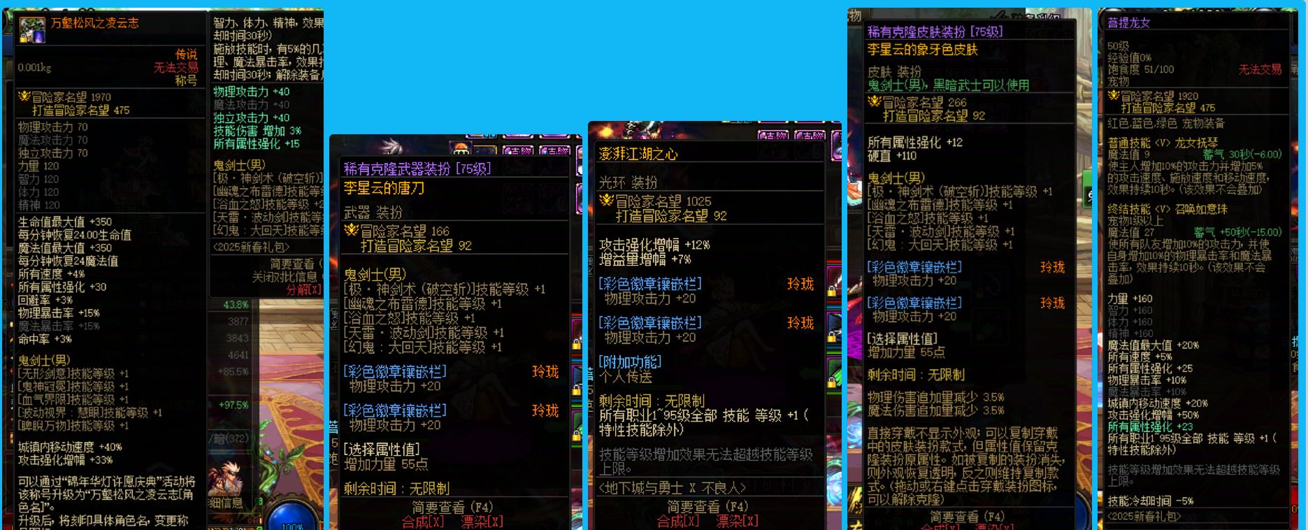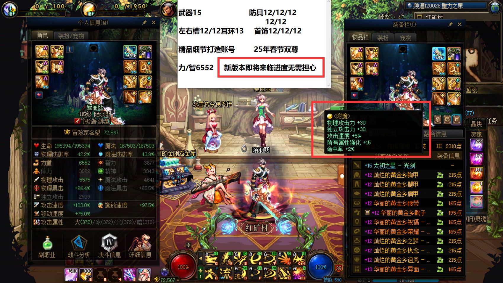 27462重庆一区【25年双尊】【强化15武器】圆梦首选!【1个增幅12+4个增幅10差1件】新春版本活动超多!进度无需担心!25年双尊武器15耳环13其余完美增幅12细节打造齐全剑魂+全身增幅10左曹0奶妈+24年双尊武器耳环13其余11-10鬼泣+全身增幅10阿修罗+全身10魔神+24年双尊细节打造齐全两件13刃影!回归首选账号!好玩不累!现在入手1月八号正好开荒野猪!