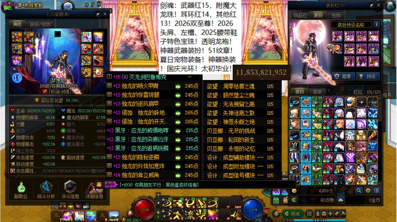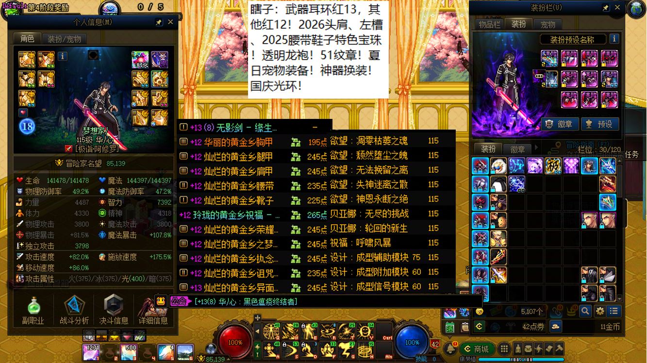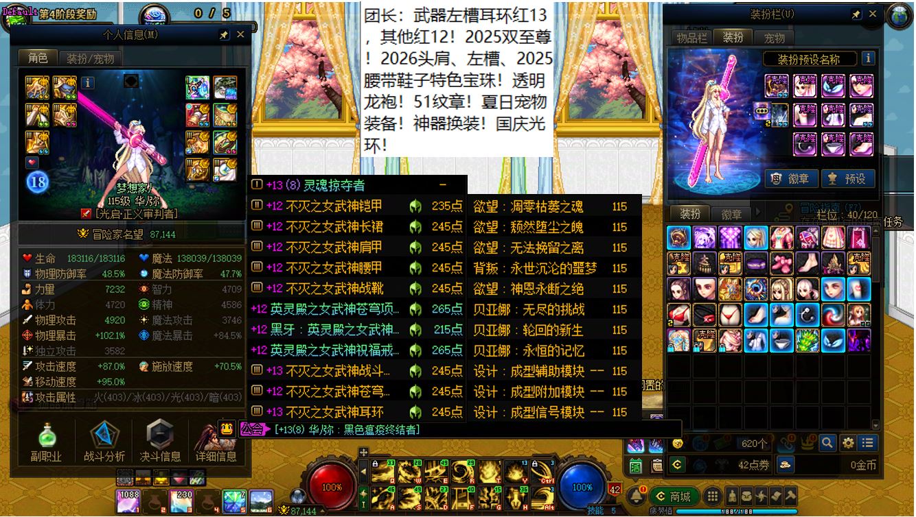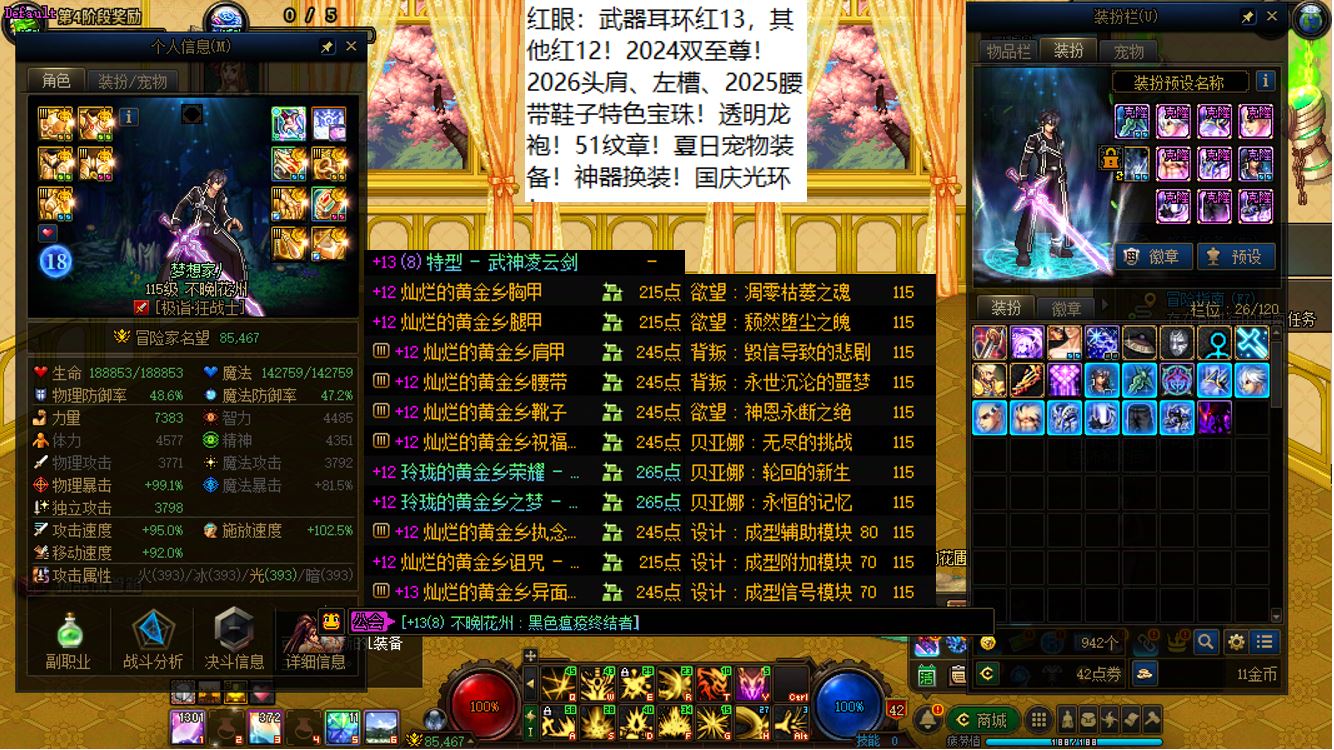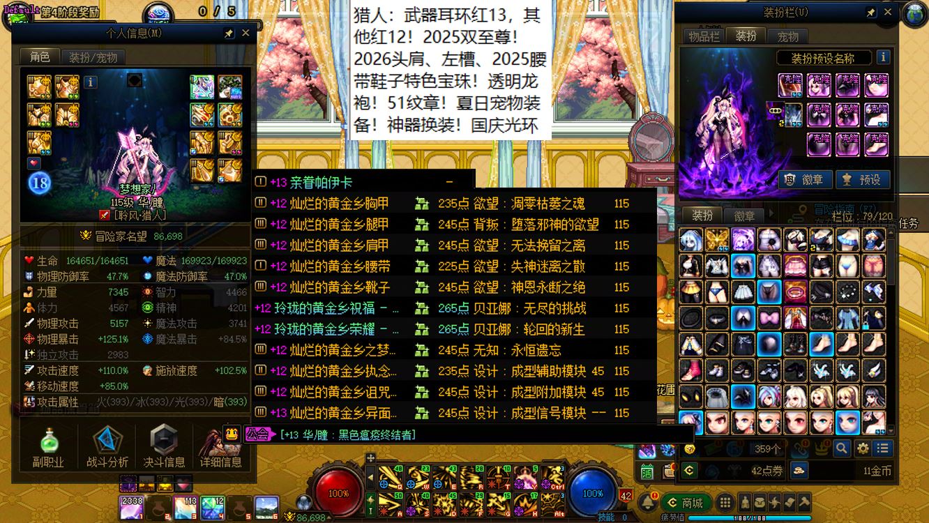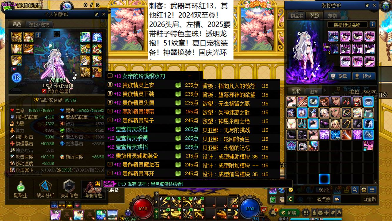 跨二湖南5区,【已买40套2026年套+40套2025年套+40套2024年套】,【全部都是最顶级的国服特色附魔和最新称号】,【四把金色武器角色都是2026双至尊】,【全部都是透明龙袍和最新最新进度】,【红15武器红14耳环全身红13,大龙珠+神武+月兔】剑神+【红15武器耳环等半身红13,神武】旅人+【红15武器红14耳环全身红13,神武】四姨+【15武器特殊部位护肩4件红13】女气功,【纵有狂风拔地起,我亦乘风破万里】,带15个红12-13打造角色【武器耳环红13妖护使+武器耳环红13刺客+武器耳环红13猎人+武器耳环红13女机械+武器耳环红13天帝+武器耳环红13男漫游+武器耳环红13奶爸+武器耳环红13元素+武器耳环红13魔神+武器耳环红13鬼泣+全身红12奶妈+耳环红13全身红12奶弓+武器红13奶枪】!序号250205