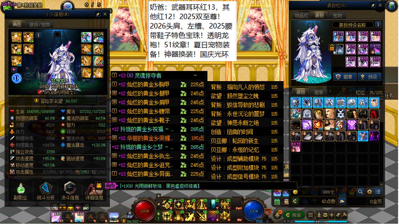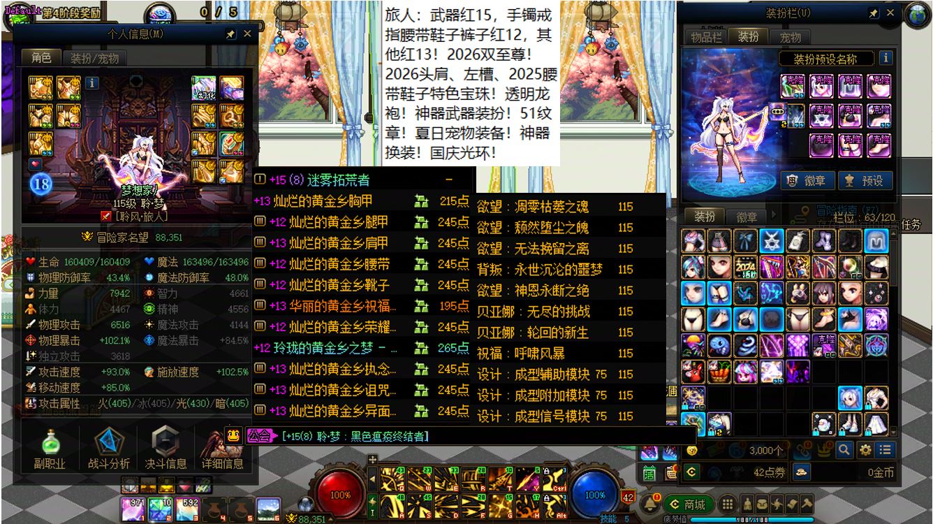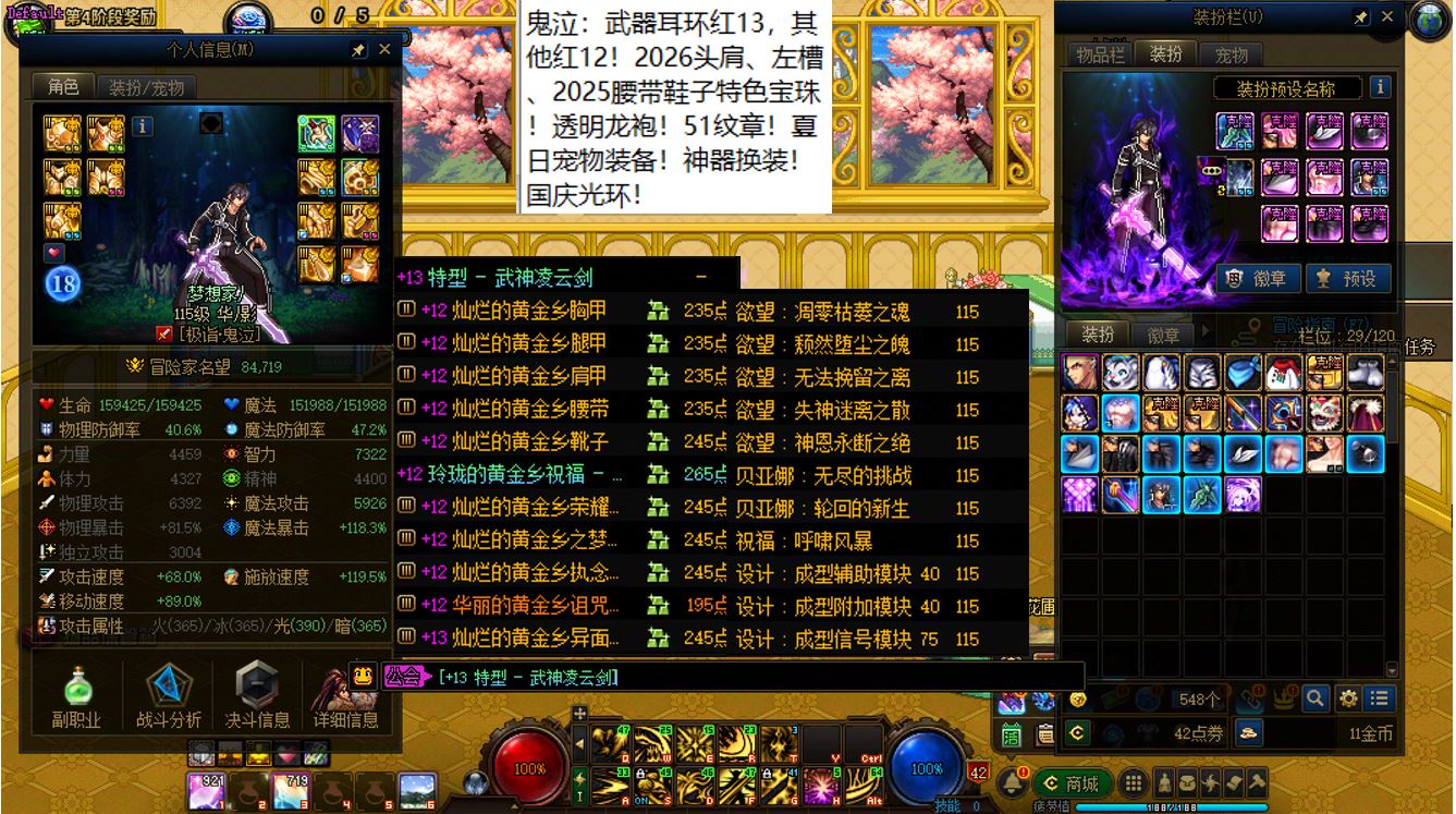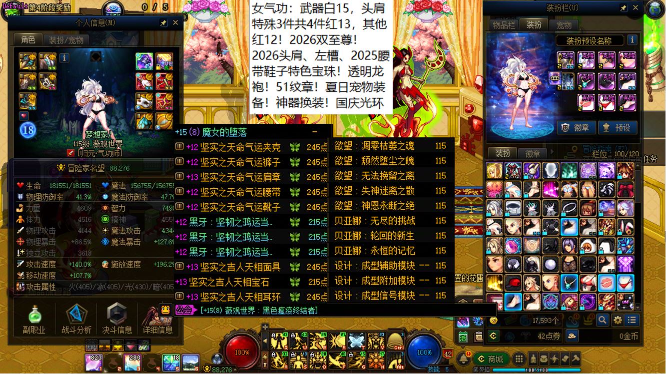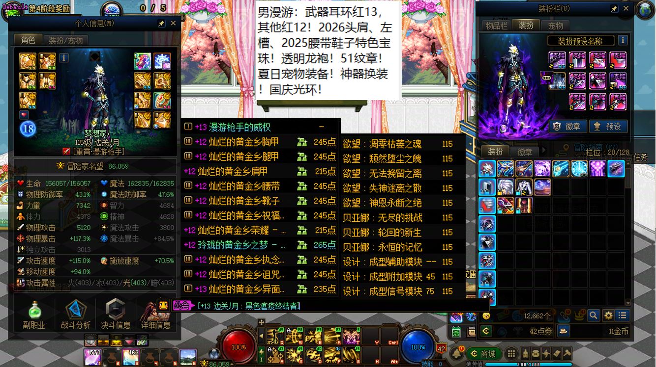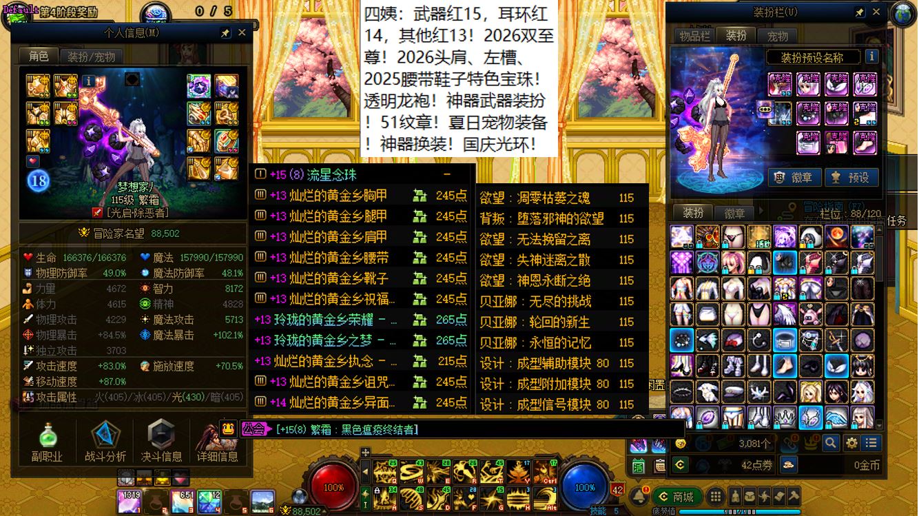 跨二湖南5区,【已买40套2026年套+40套2025年套+40套2024年套】,【全部都是最顶级的国服特色附魔和最新称号】,【四把金色武器角色都是2026双至尊】,【全部都是透明龙袍和最新最新进度】,【红15武器红14耳环全身红13,大龙珠+神武+月兔】剑神+【红15武器耳环等半身红13,神武】旅人+【红15武器红14耳环全身红13,神武】四姨+【15武器特殊部位护肩4件红13】女气功,【纵有狂风拔地起,我亦乘风破万里】,带15个红12-13打造角色【武器耳环红13妖护使+武器耳环红13刺客+武器耳环红13猎人+武器耳环红13女机械+武器耳环红13天帝+武器耳环红13男漫游+武器耳环红13奶爸+武器耳环红13元素+武器耳环红13魔神+武器耳环红13鬼泣+全身红12奶妈+耳环红13全身红12奶弓+武器红13奶枪】!序号250205