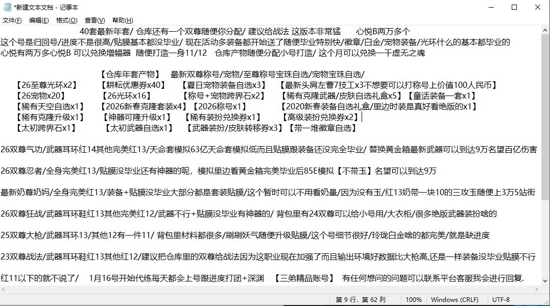 26年最新40套礼包拉满/4个双尊仓库还有双尊可以给任意角色使用/三个增幅13连体几个红12/仓库还有一堆产物没用/【26双尊武器耳环红14其他红13女气功】【26双尊完美红13忍者武器龙珠附魔】【全身完美红13奶妈】【26双尊武器耳环鞋红13其他红12狂战】【25双尊武器耳环13其他红12缺1大枪】【武器耳环鞋红13其他红12战法】【高配红11魔道】送一堆有时装的小号/少妇一手回归号/装备没毕业不用看名望模拟啥的/ 细节都有/收集箱/勋章/心悦勇士B2万多个随便你给魔道打造增幅12/精品小连体好玩不累/战令已买/