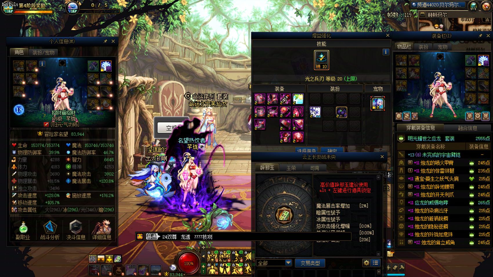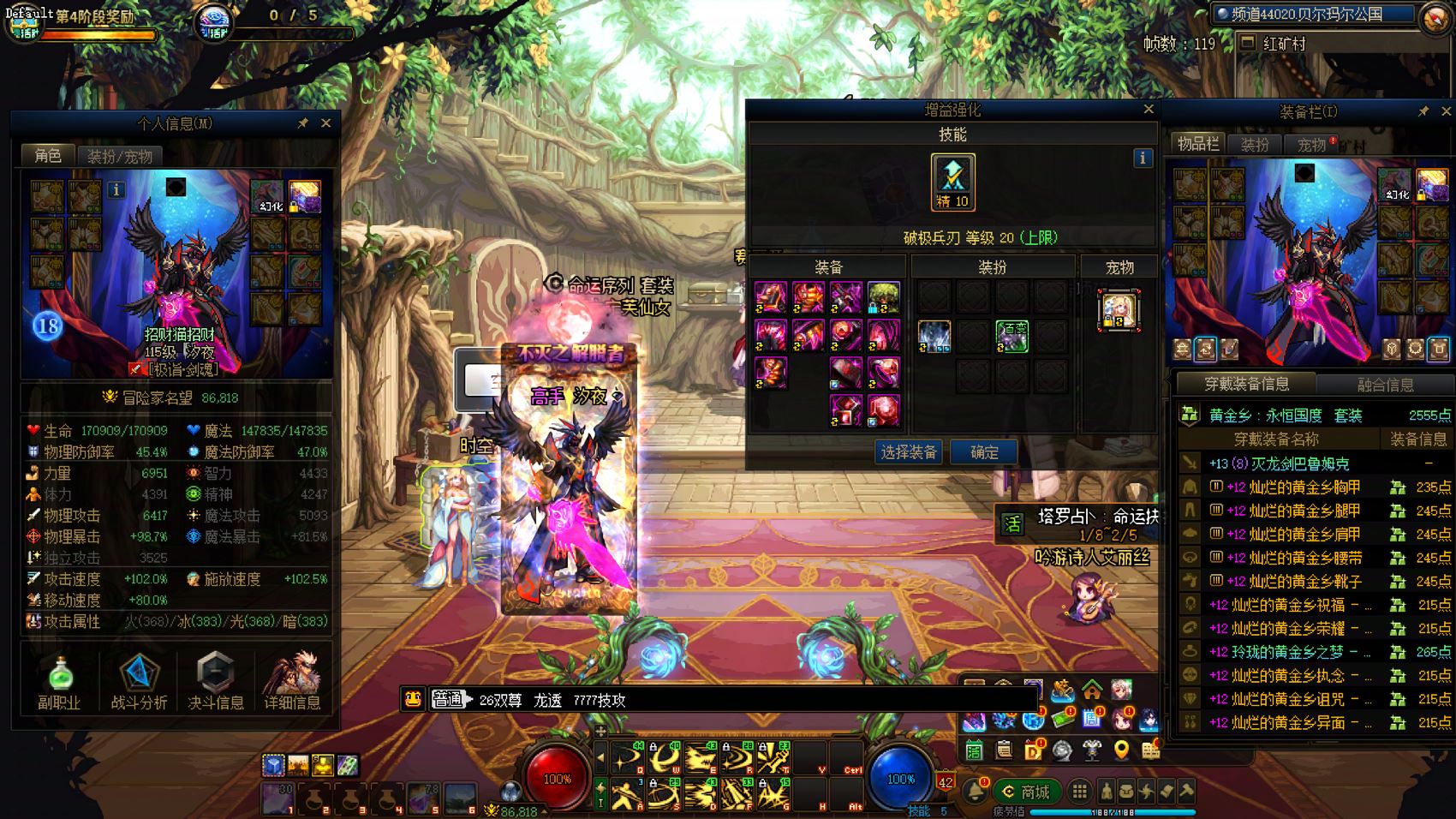 跨5 课 26-25新春各10套,1.5个12、4个11、7个10,9套龙袍。26双尊红12龙透剑魂,7777技攻,模拟57亿。25双尊红11-12龙透女漫游,武器强化15,5577技攻。红11打造分别是气功、魔神、鬼泣、剑帝。红10打造分别是奶妈、奶爸、阿修罗(1件6)、女漫游、剑帝、刃影、武神。