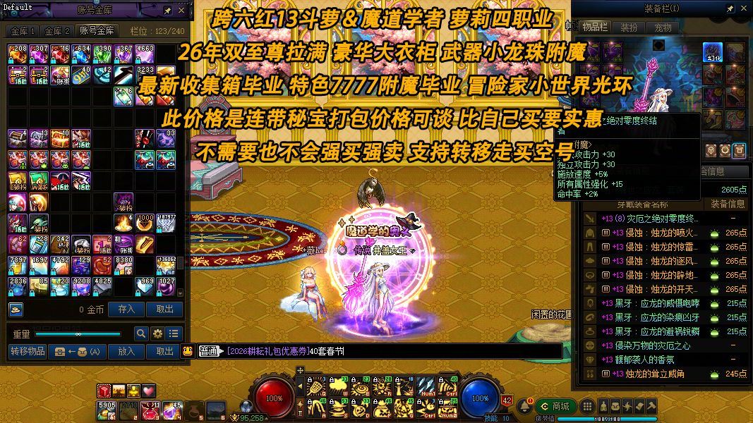 【跨六红13斗萝&魔道学者】【26年双至尊拉满 大衣柜】萝莉四职业 冒险家小世界光环 首列多角色龙武已全部毕业 武器小龙珠附魔 最新收集箱毕业 特色7777附魔毕业 龙武毕业等 豪华经典衣柜 高颜值女角色连体(此价格是连带秘宝打包价格可谈 比自己买要实惠 不需要也不会强买强卖 支持转移走买空号)【斗萝】【魔道】【暗帝】【刃影】【奶萝】【旅人】【召唤】等热门职业【春节礼包已全部拉满】【取景地 DNF中央公园】【超高信誉分】