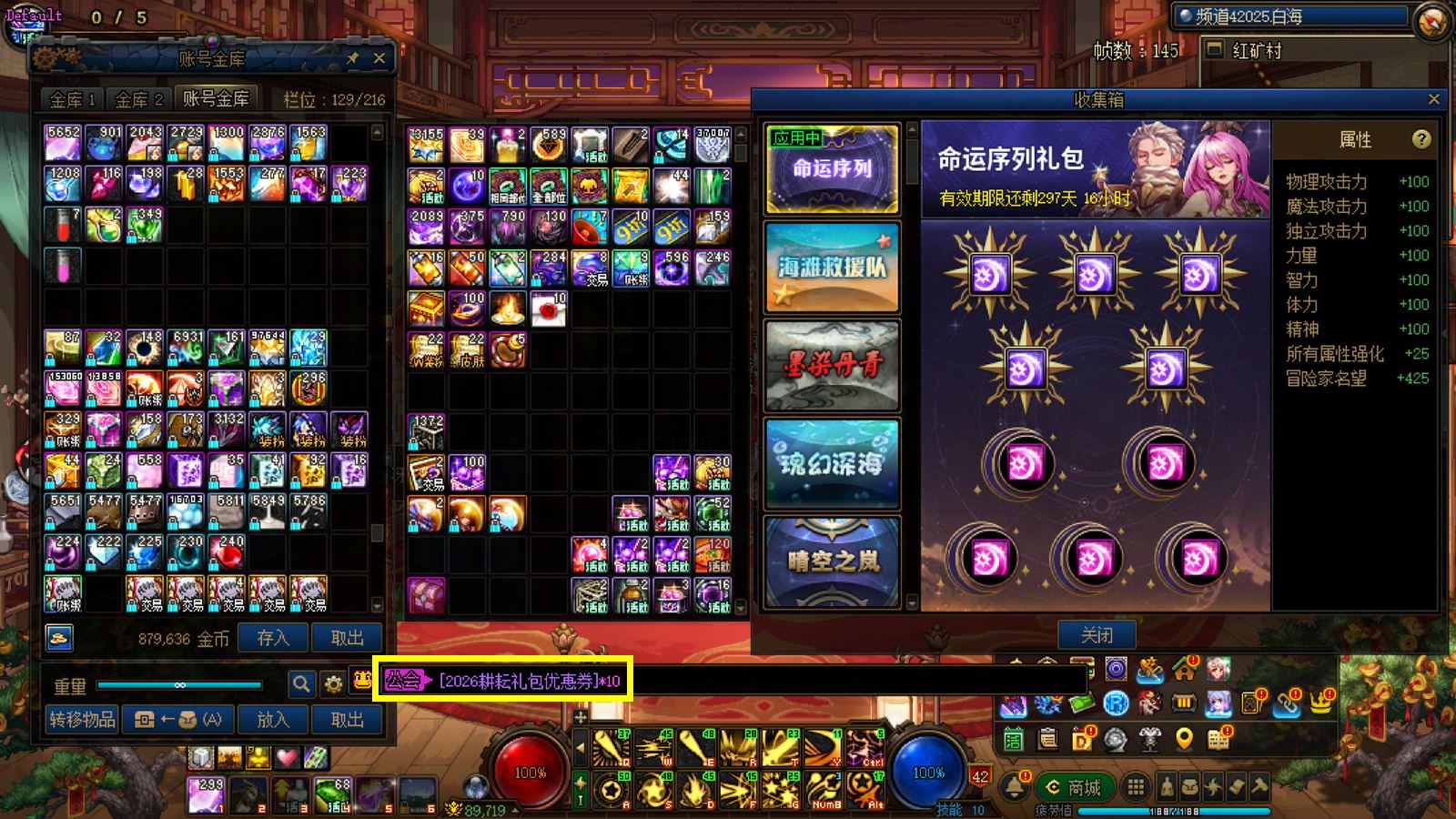 2289山东2区(已买10套26年最新年套,完美收集箱神器换装,跨六在售极品连体,2个红13-14+10个红11,十个战法九个豪剩下一个是神豪,上手即玩不用担心冲完年套找回)(野猪满勤进度,迷雾等级28级)(武器可以追一手15成功直接价值翻倍)(可以二次实名,买到就是一手账号)8.9W名望全身完美红12-13武器红14龙透双至尊战法+8.7W名望全身完美红12武器耳环左曹红13龙透双至尊气功+10个红11