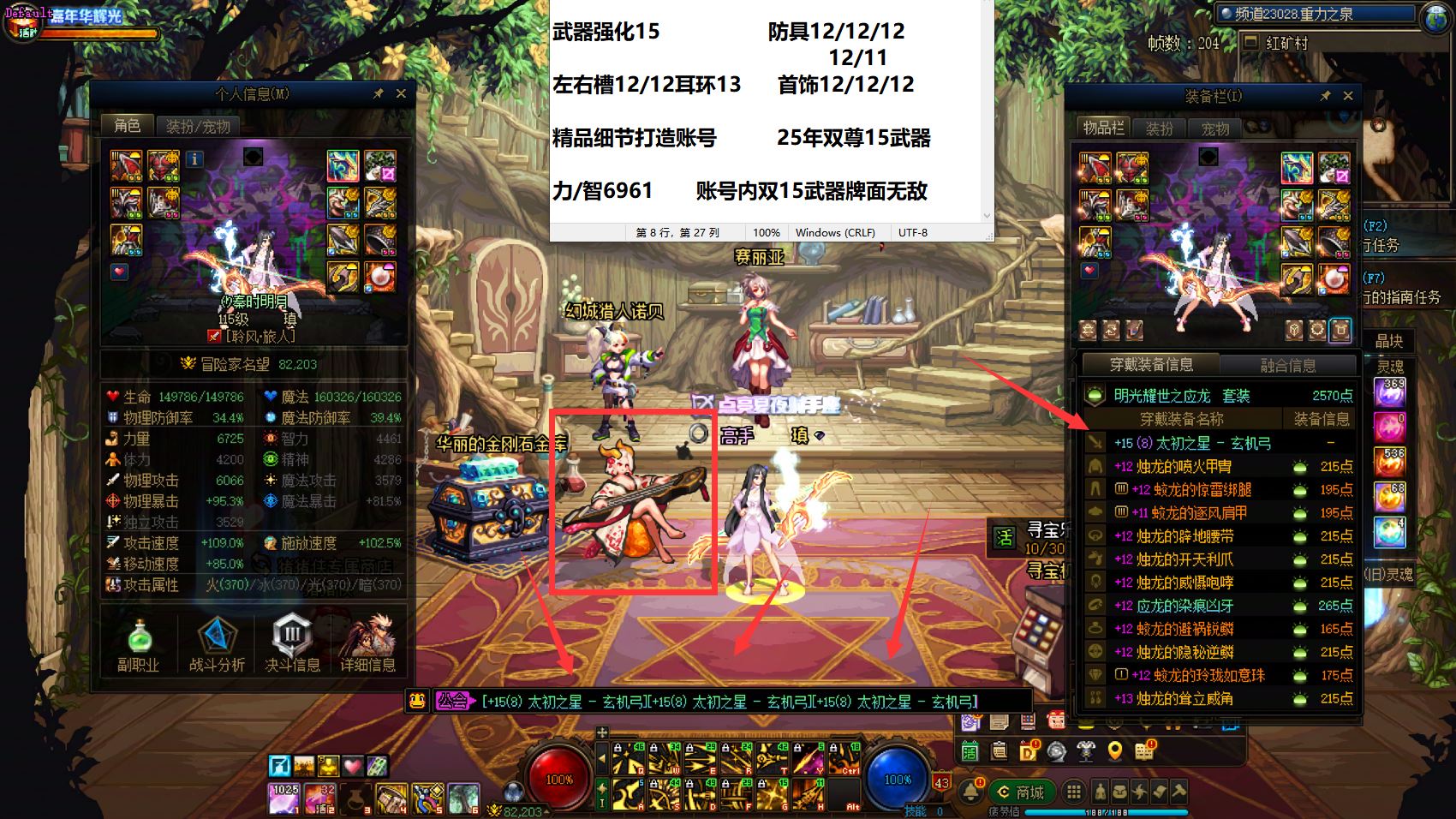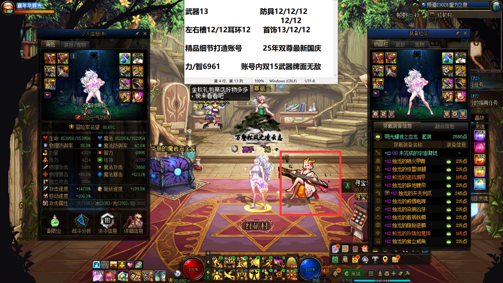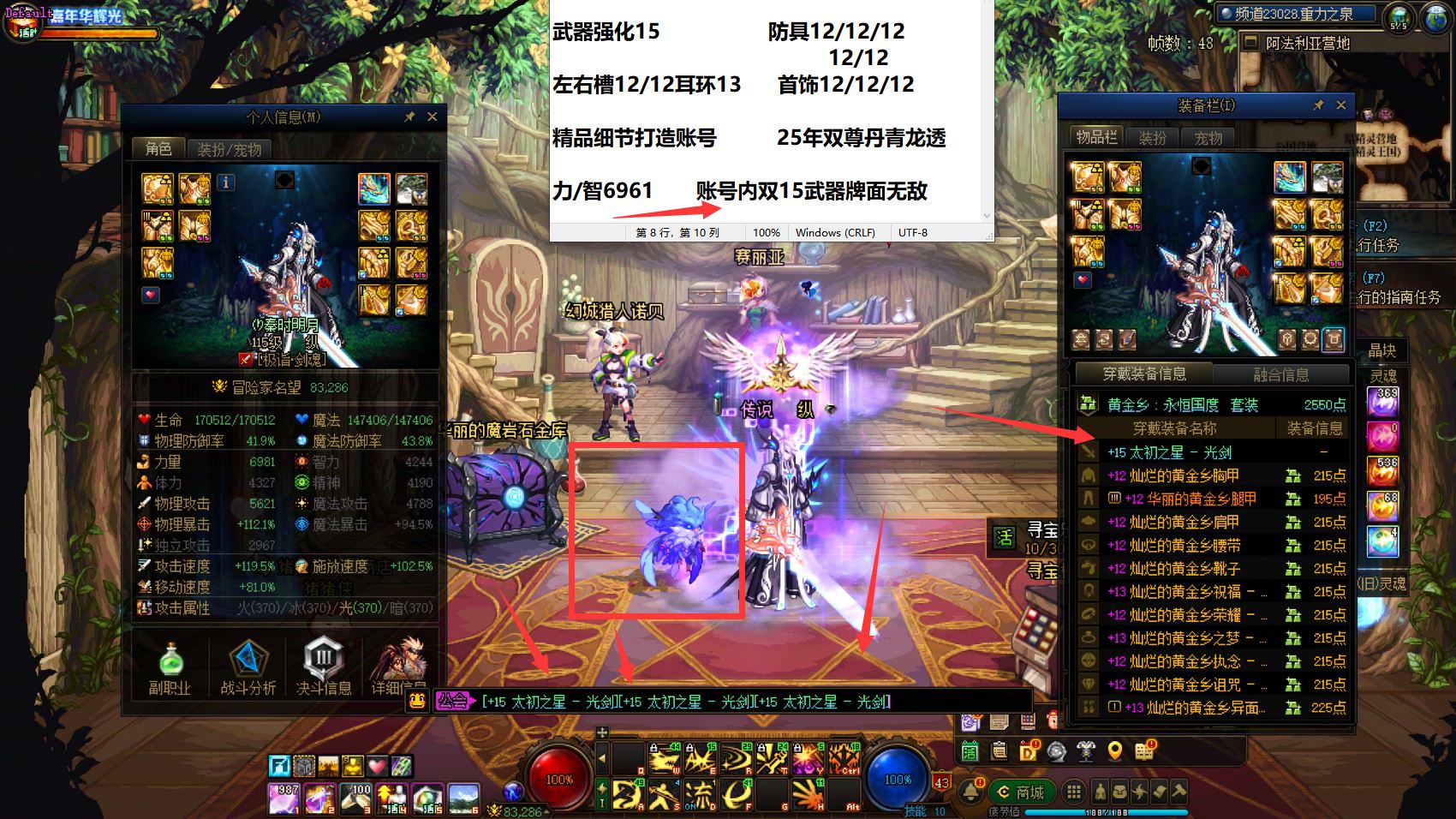 30635-东北一区【25年3个双尊+国庆10套】【双15武器+增幅15耳环】25年双尊武器15全身完美增幅12两件增幅13龙透细节打造齐全丹青剑魂+25年双尊武器15耳环13全身完美增幅12头肩增幅11旅人+25年双尊武器戒指13其余完美增幅12女气功+全身完美增幅12两件增幅13奶妈+24年双尊耳环13全身增幅12-11桐人魔神+全身增幅11耳环13修罗+耳环增幅15女格斗(可等转职书)!超值牌面账号!账号整体基本打造完美!拿到手就是大佬!无需再次投资!喜欢千万别错过!区好+号好+职业好!!