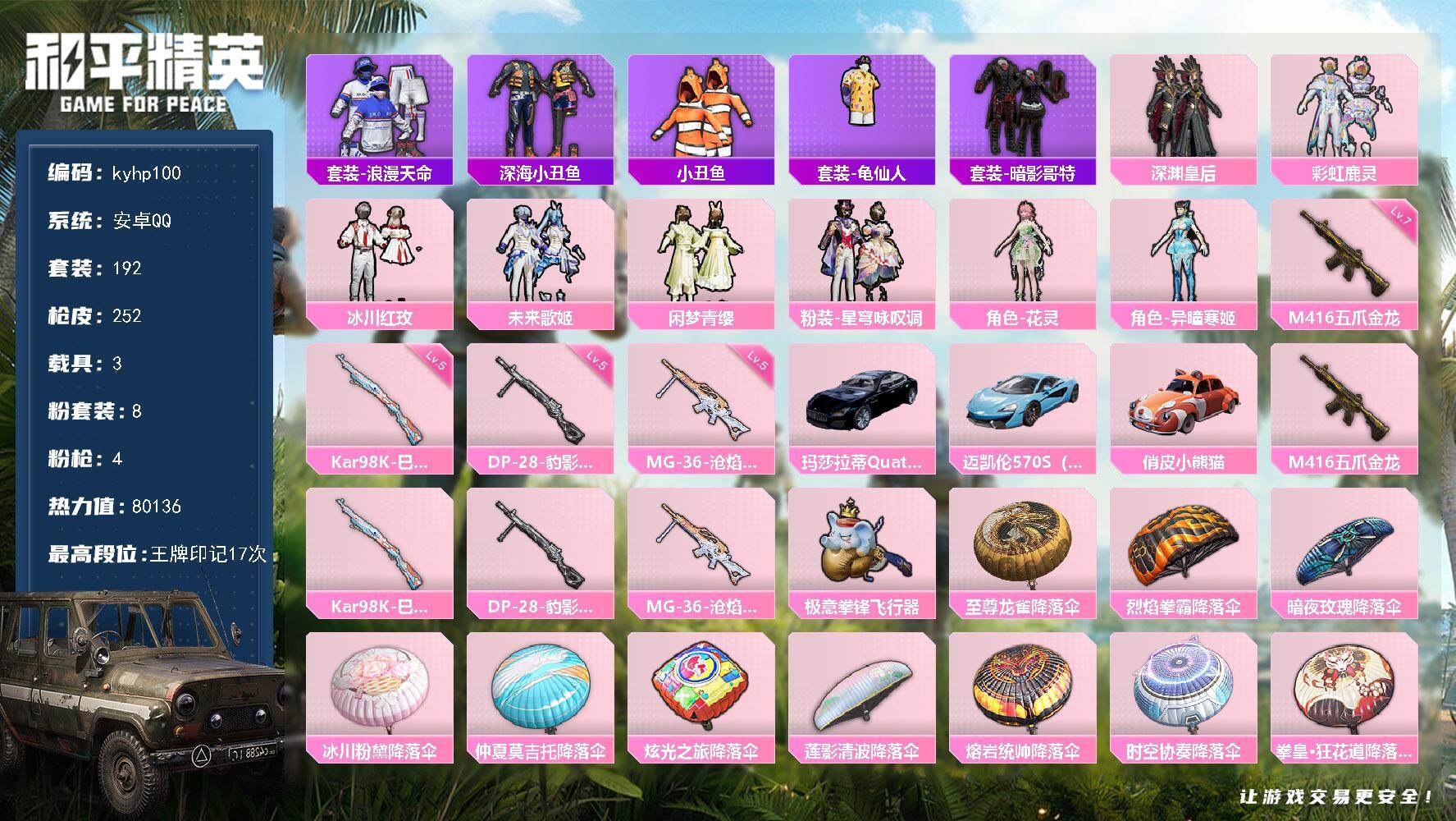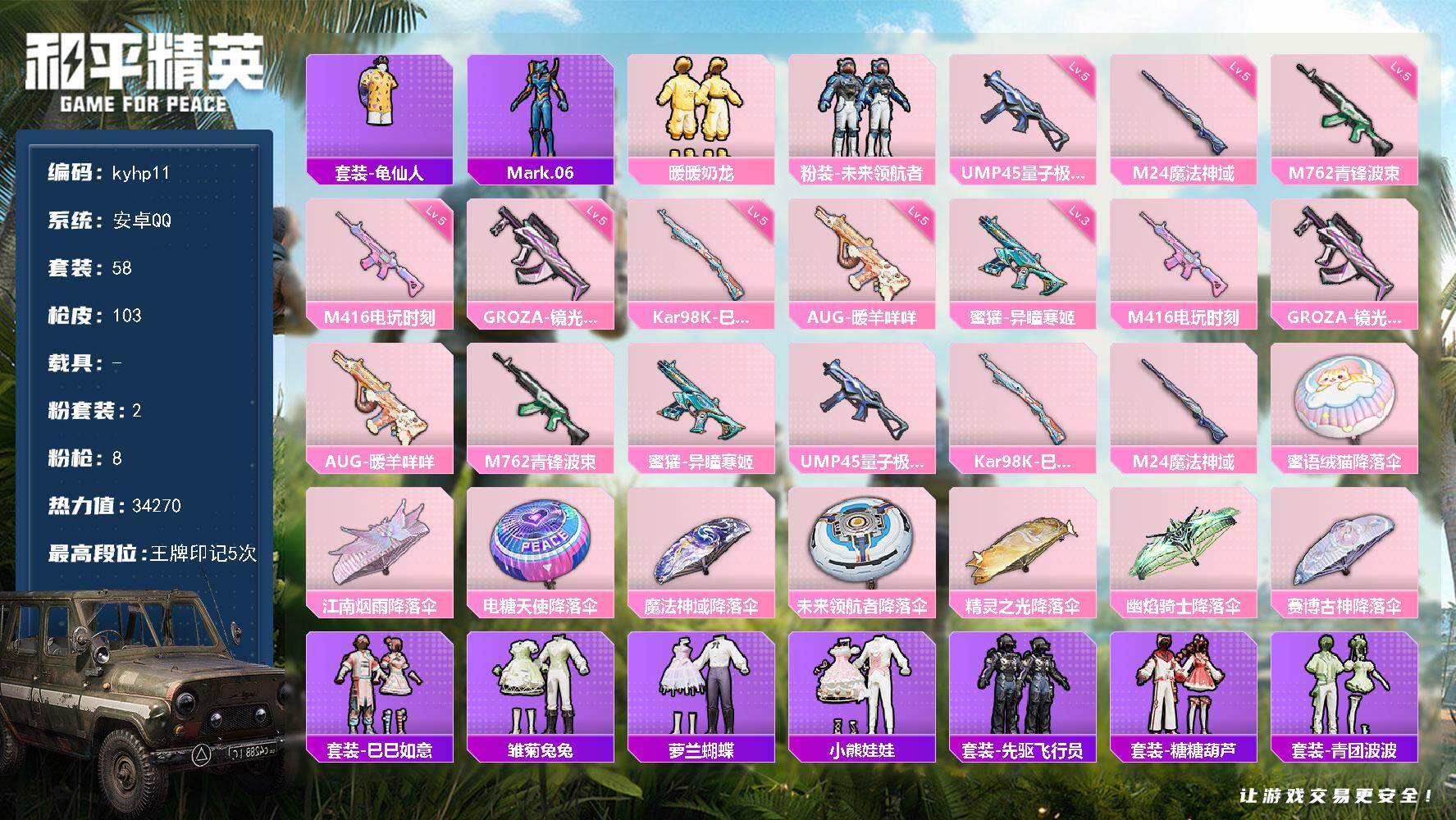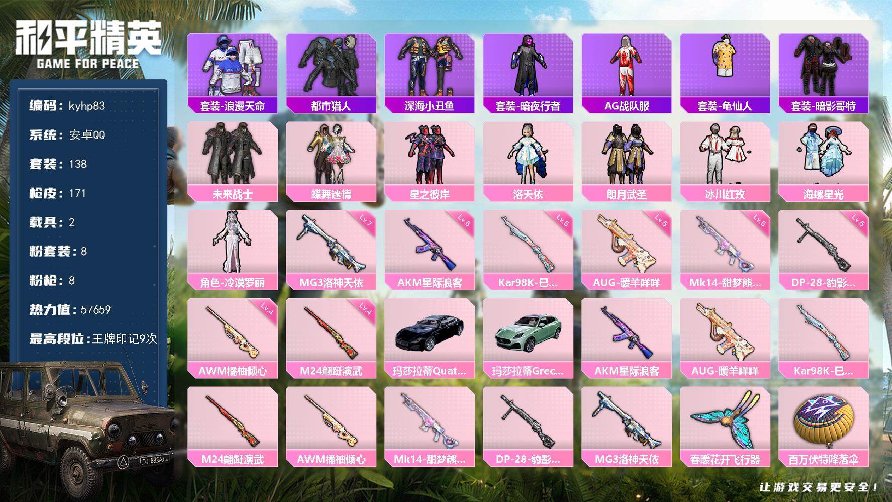 安卓 手Q4粉装-7特效枪-0载具-2粉色飞行器-58169热力值-9王牌印记-130套装-192枪皮
