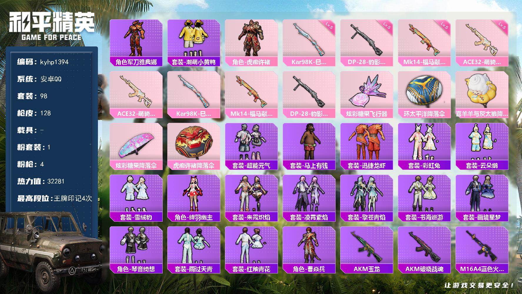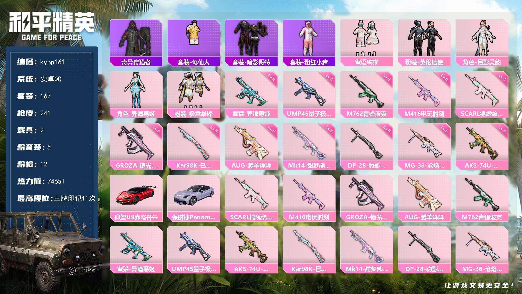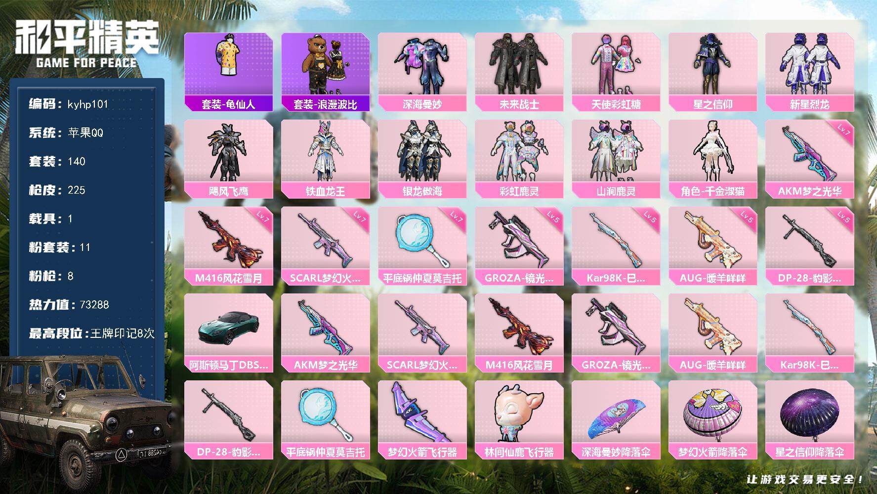 安卓 手Q4粉装-7特效枪-0载具-2粉色飞行器-58169热力值-9王牌印记-130套装-192枪皮
