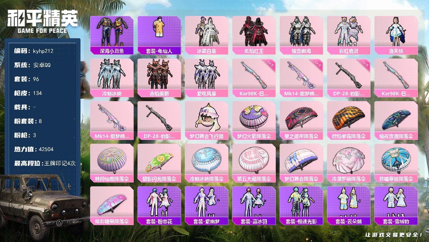 安卓 手Q3粉装-11特效枪-0载具-1粉色飞行器-45361热力值-9王牌印记-96套装-183枪皮
