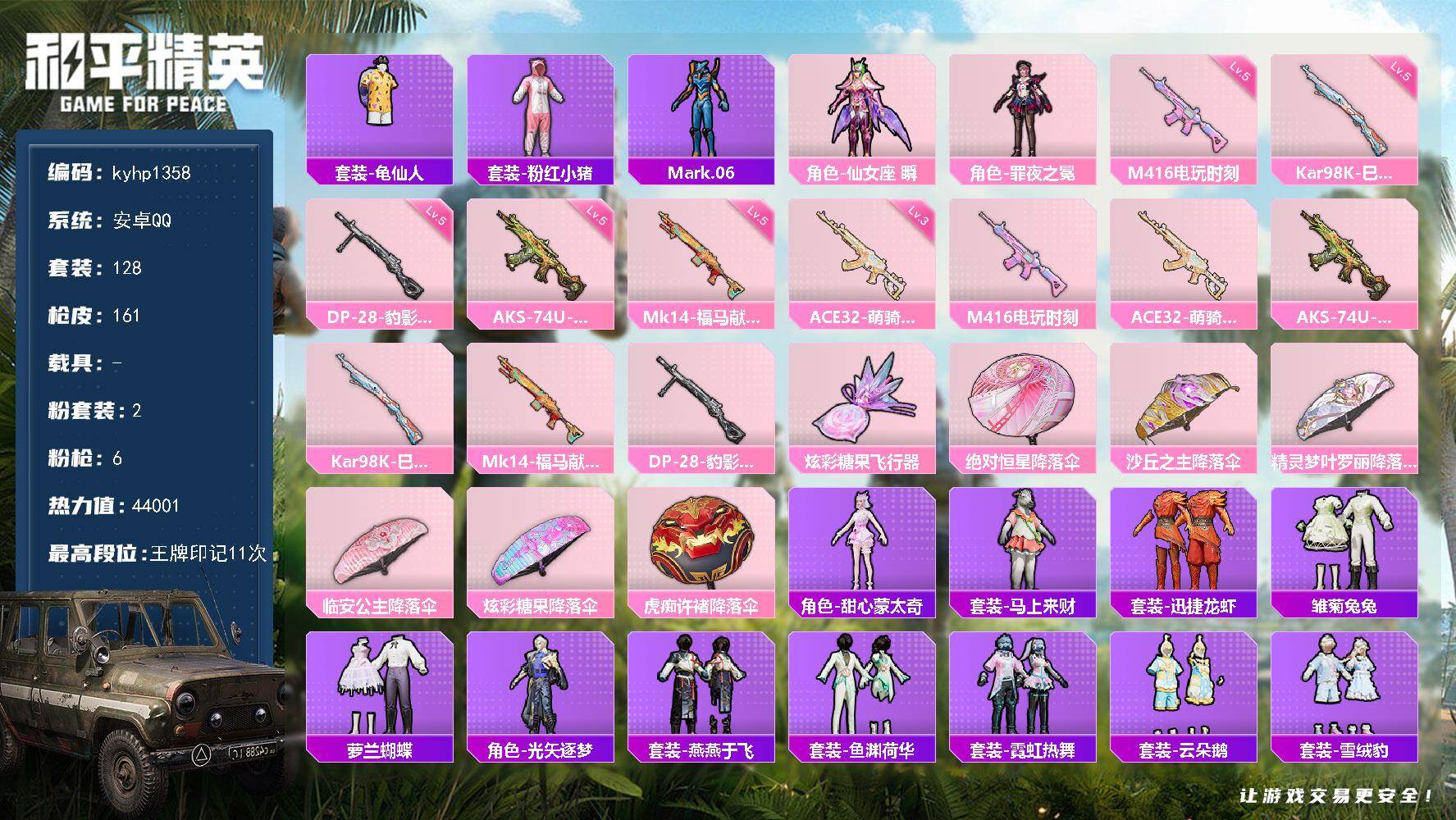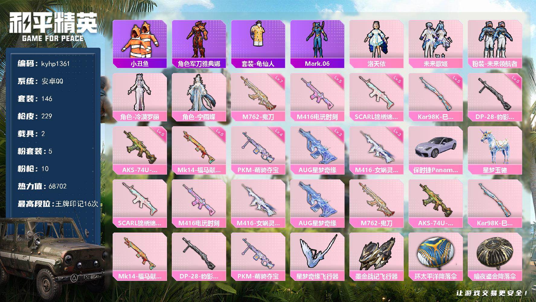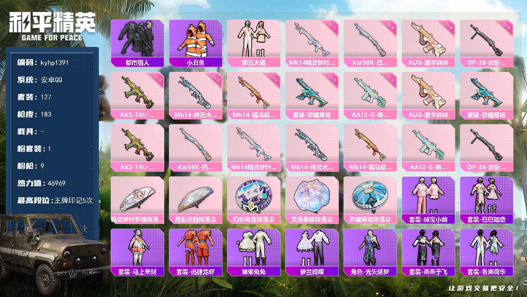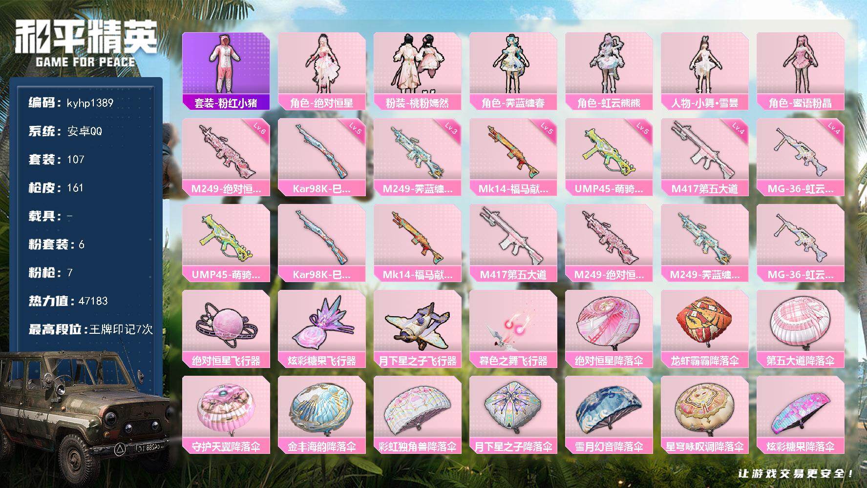 【粉色枪皮等级】:M416-五爪金龙(五级),Kar98K-未来歌姬(二级),Kar98K-巳巳如意(四级),Mk14-精灵梦叶罗丽(六级),Mk14-福马献瑞(四级),DP-28-豹影疾电(三级)