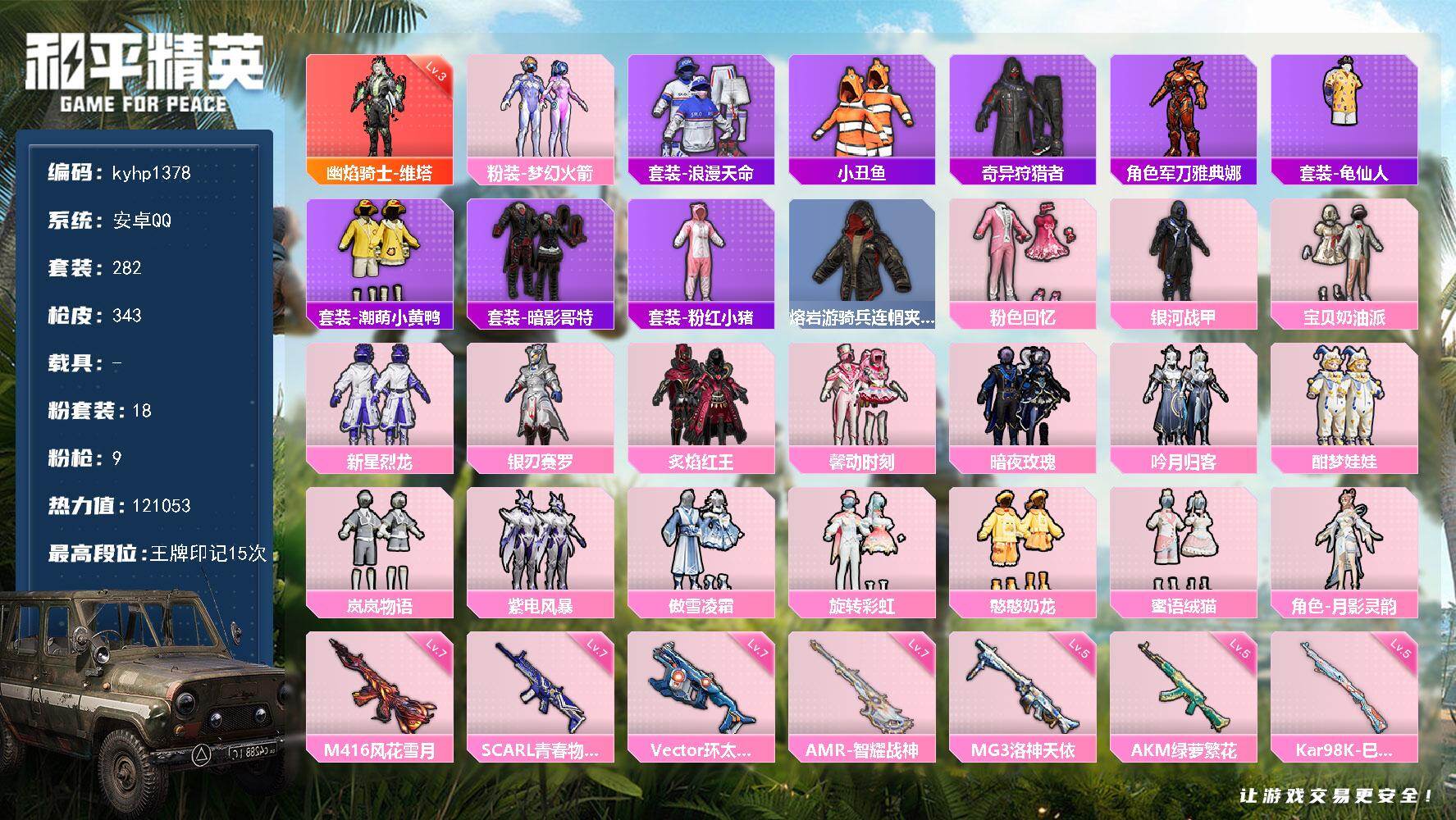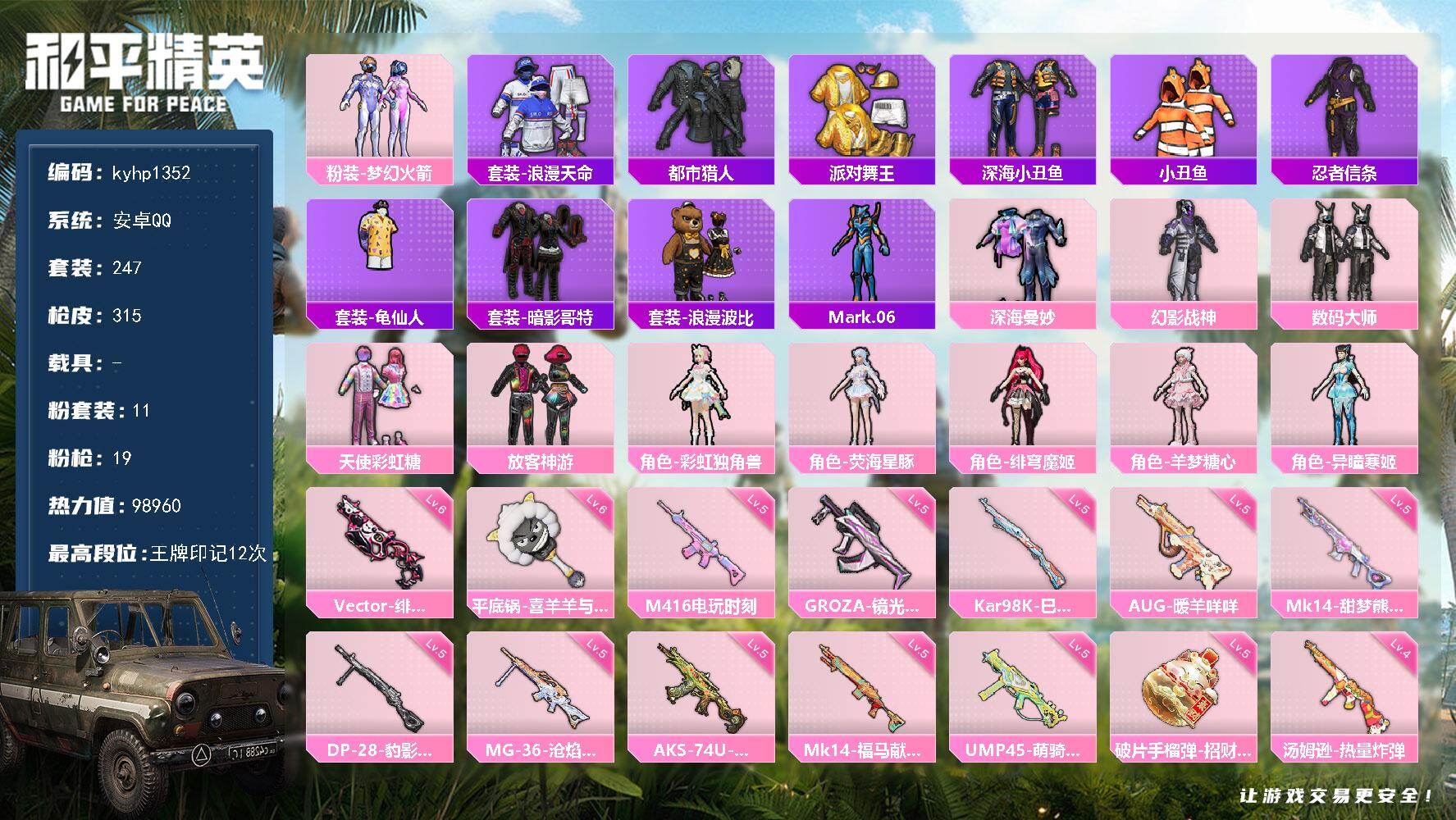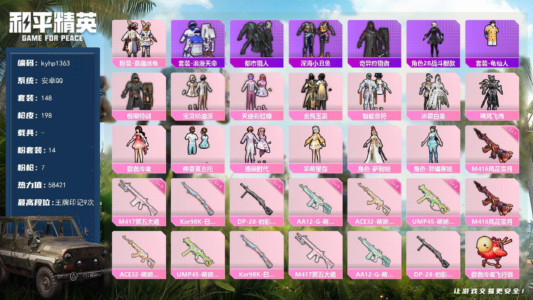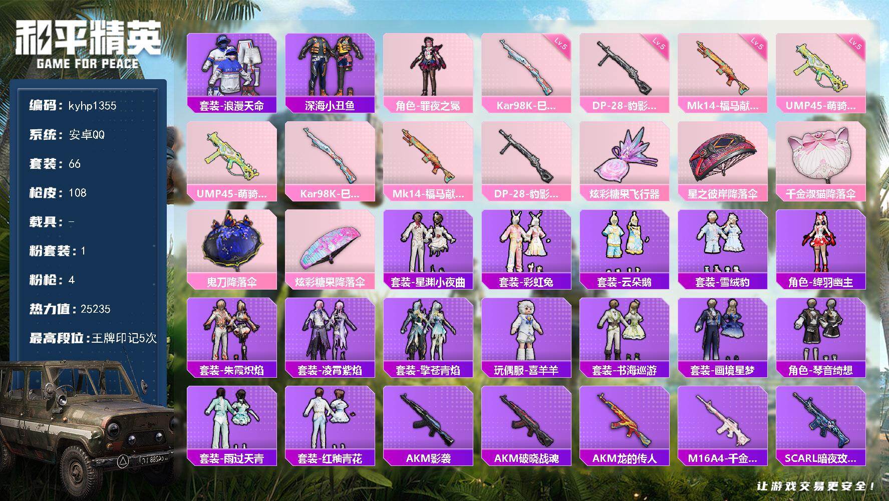 【粉色枪皮等级】:M416-五爪金龙(五级),Kar98K-未来歌姬(二级),Kar98K-巳巳如意(四级),Mk14-精灵梦叶罗丽(六级),Mk14-福马献瑞(四级),DP-28-豹影疾电(三级)
