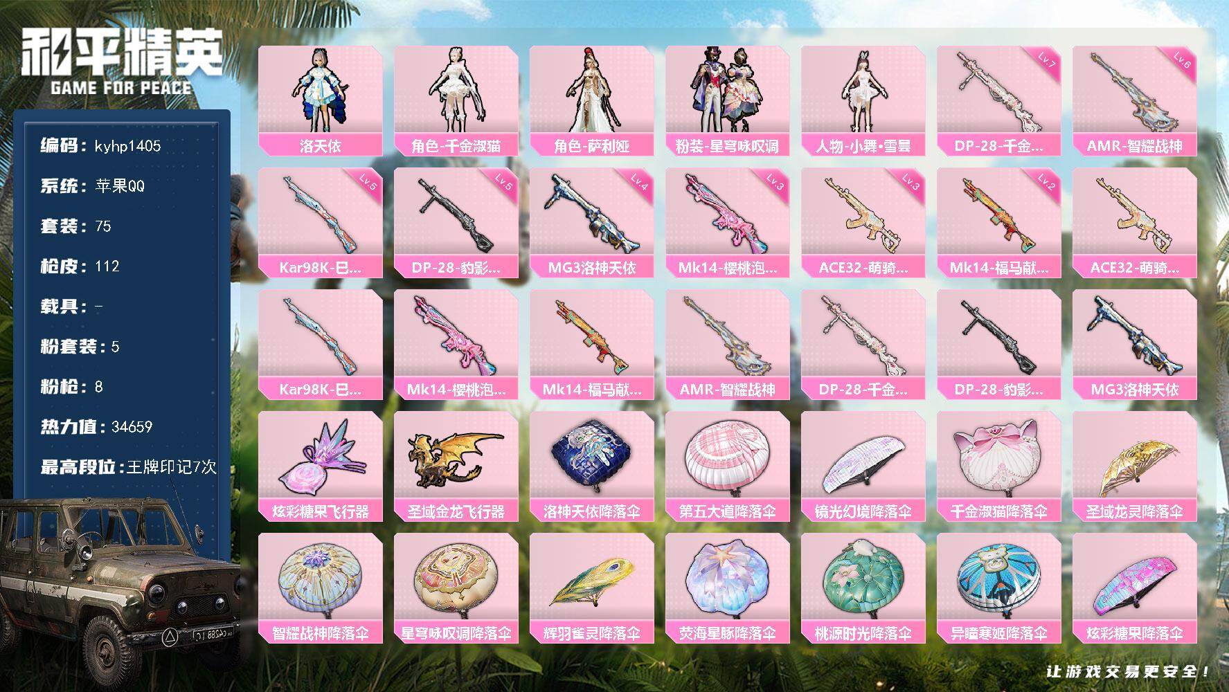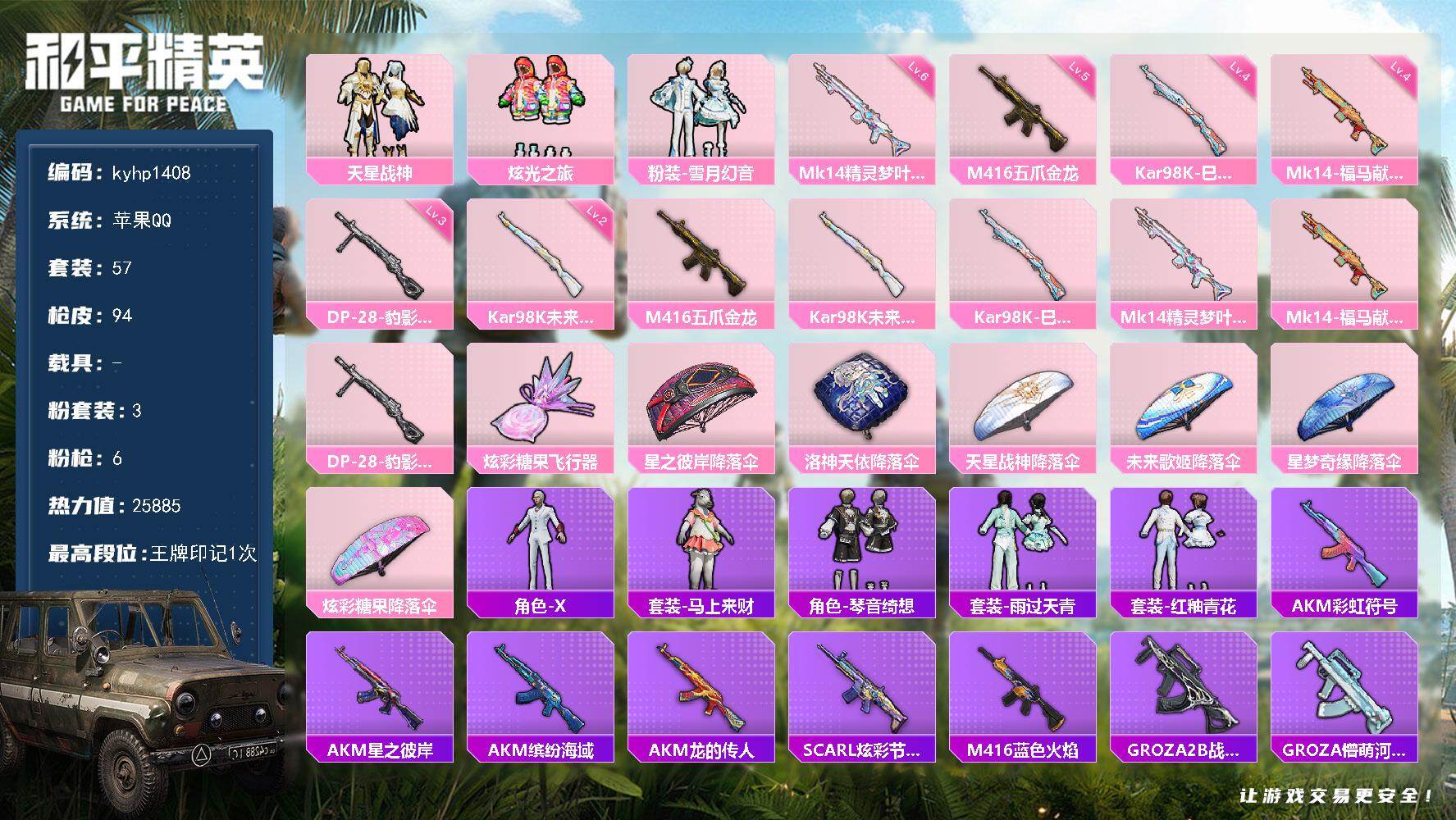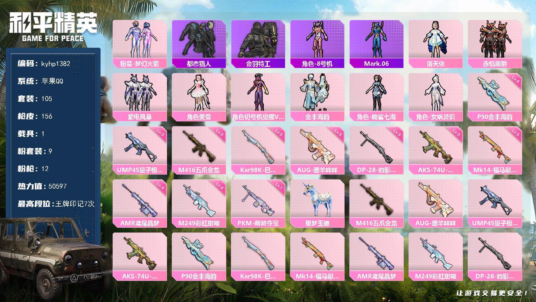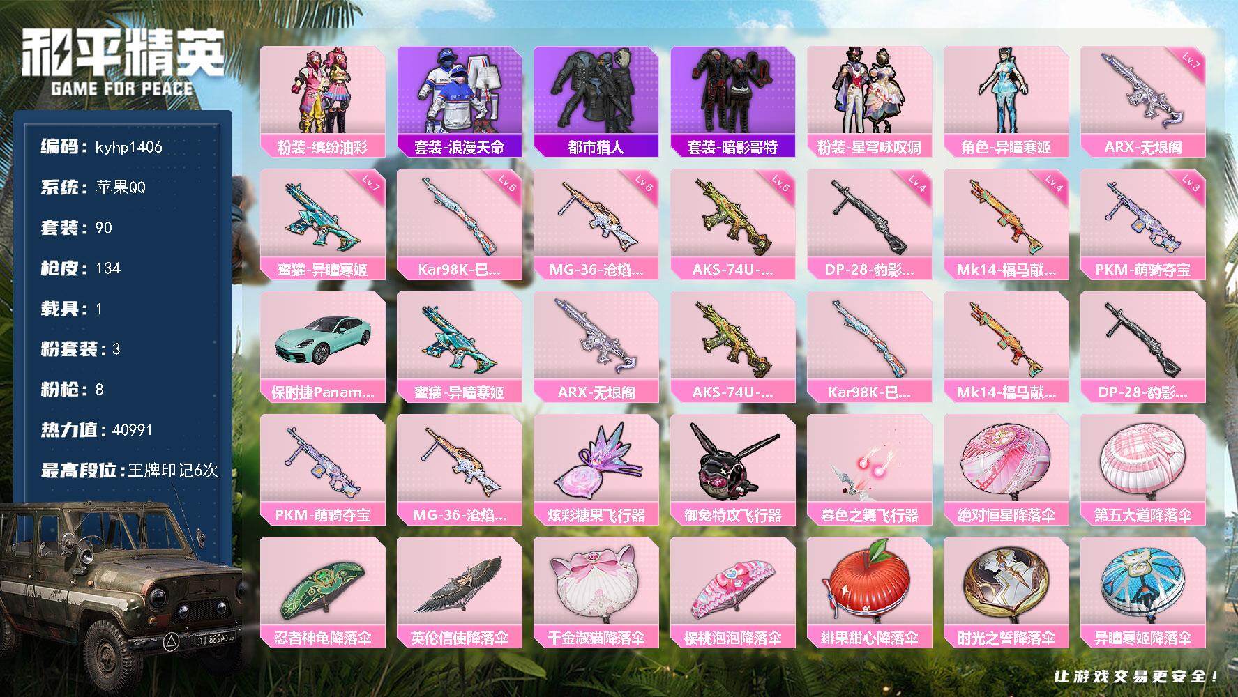 苹果 手Q3粉装-6特效枪-0载具-1粉色飞行器-25885热力值-1王牌印记-57套装-94枪皮