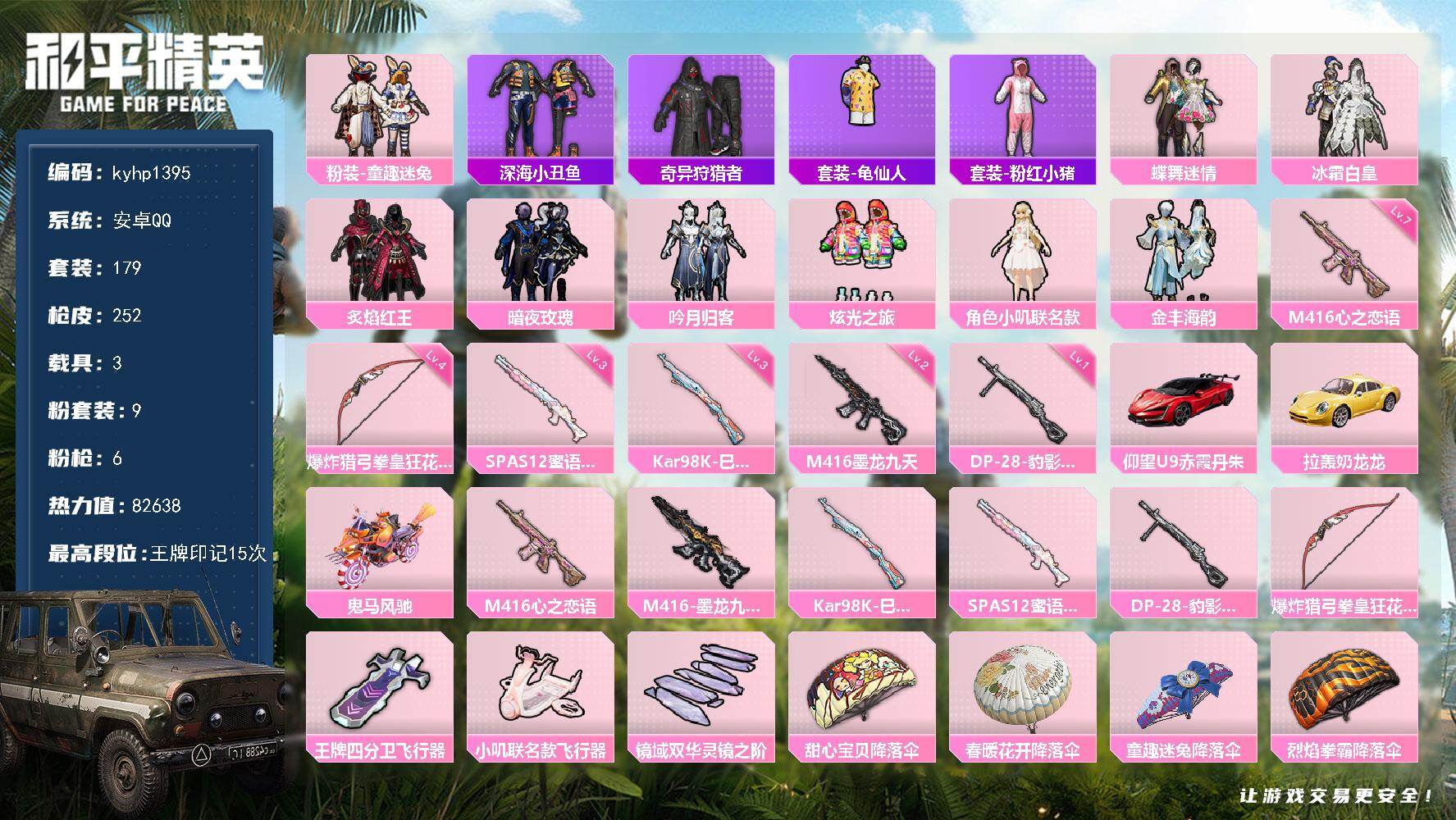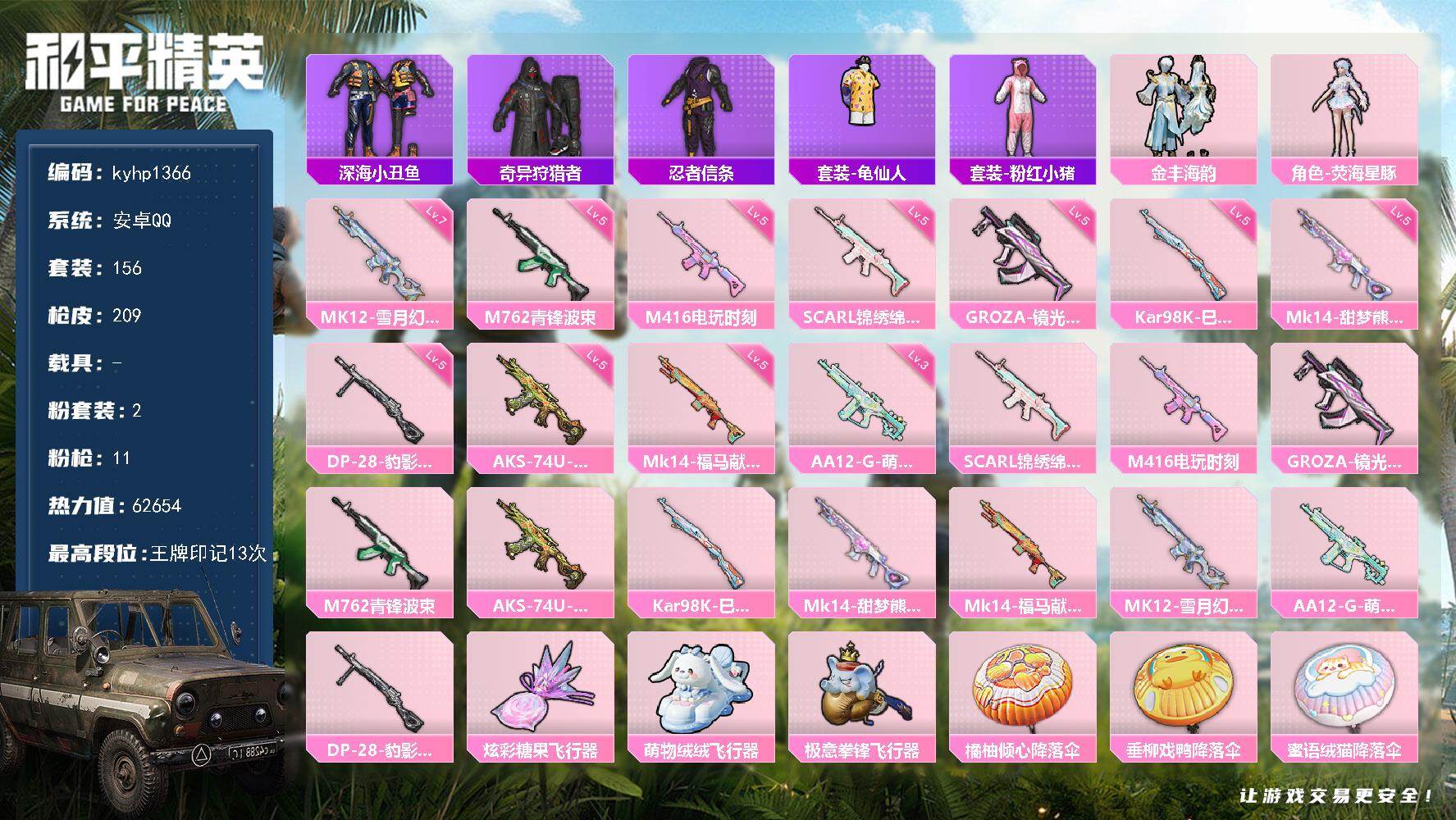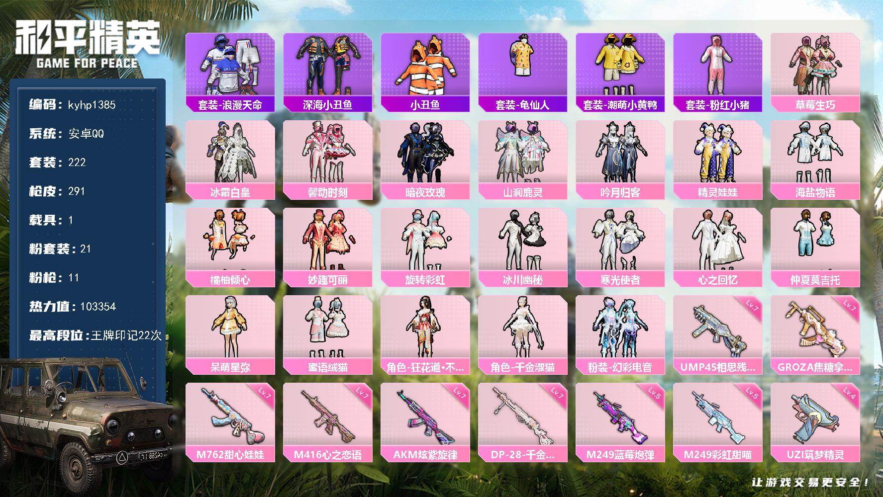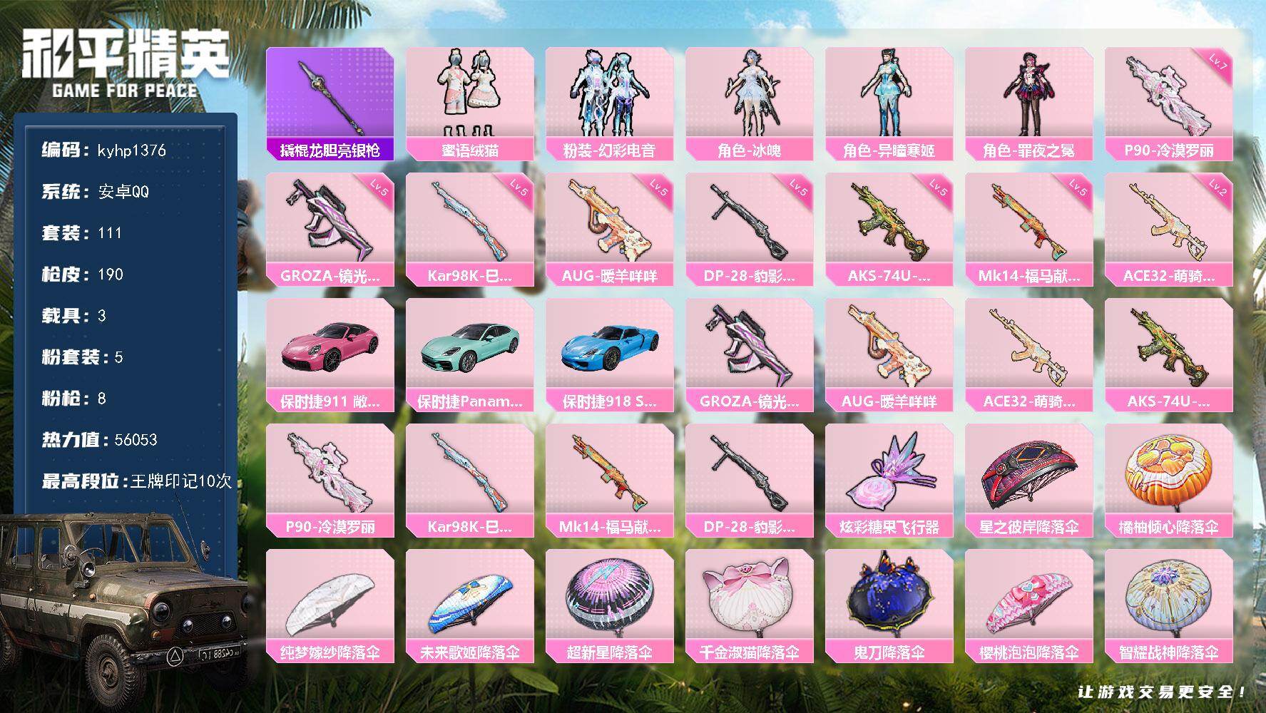 苹果 手Q3粉装-6特效枪-0载具-1粉色飞行器-25885热力值-1王牌印记-57套装-94枪皮