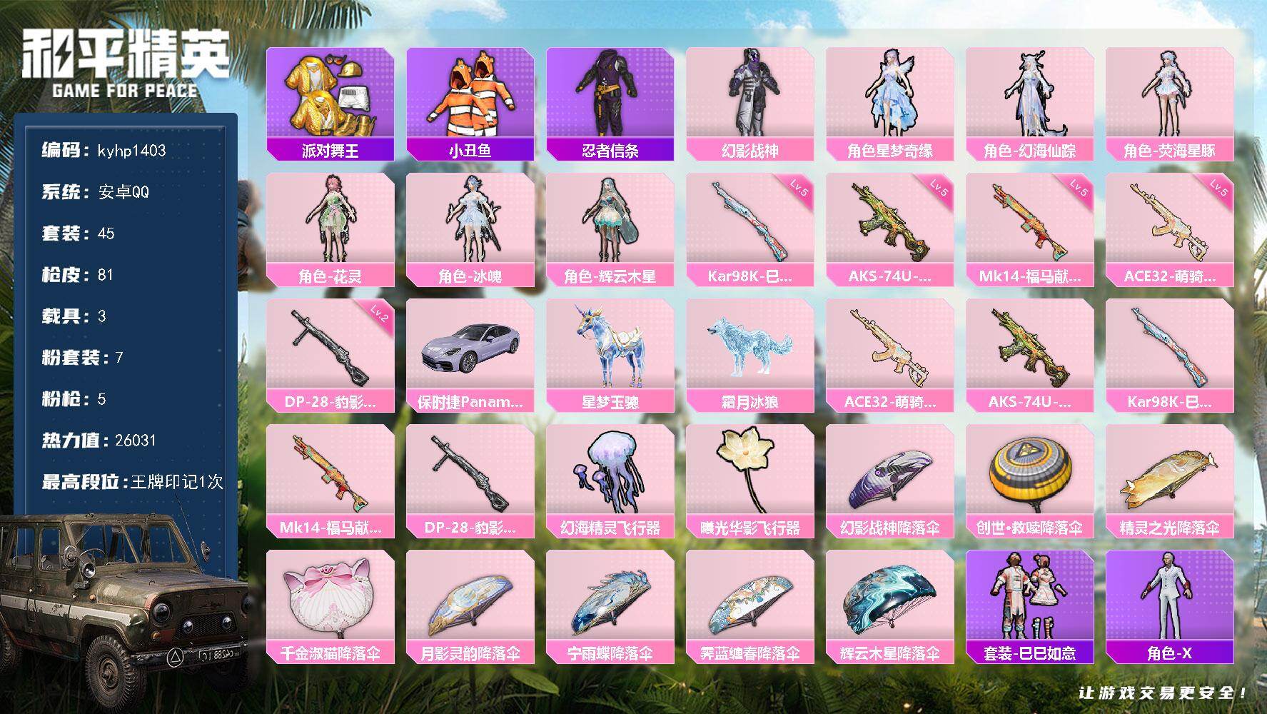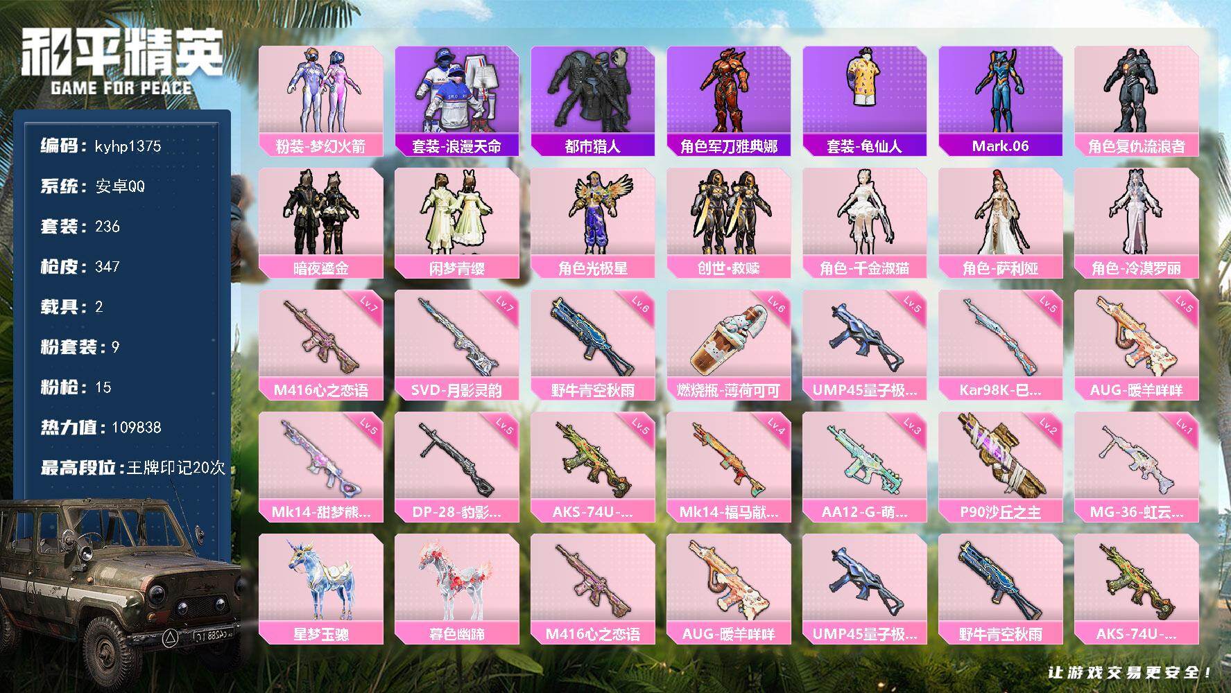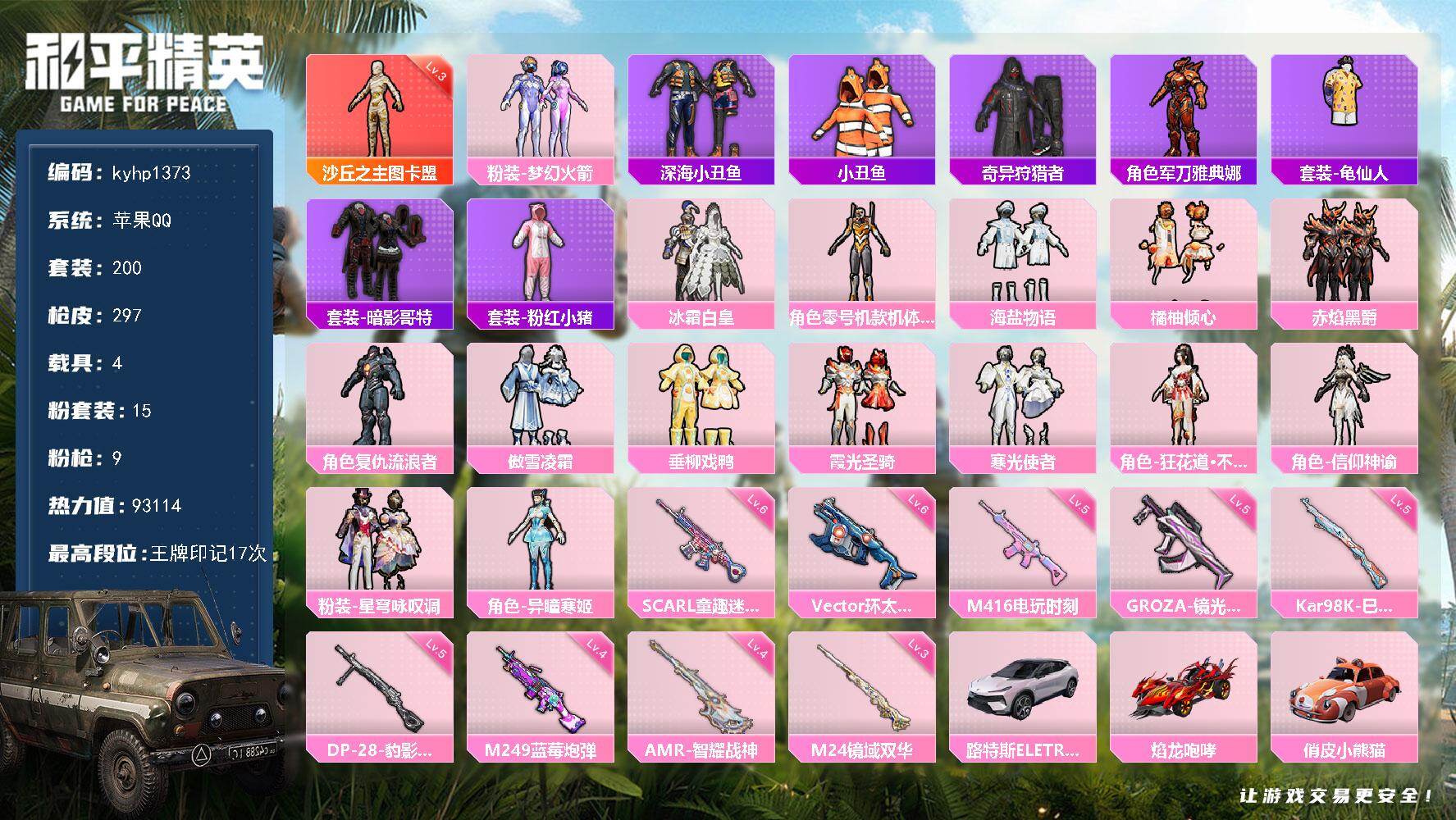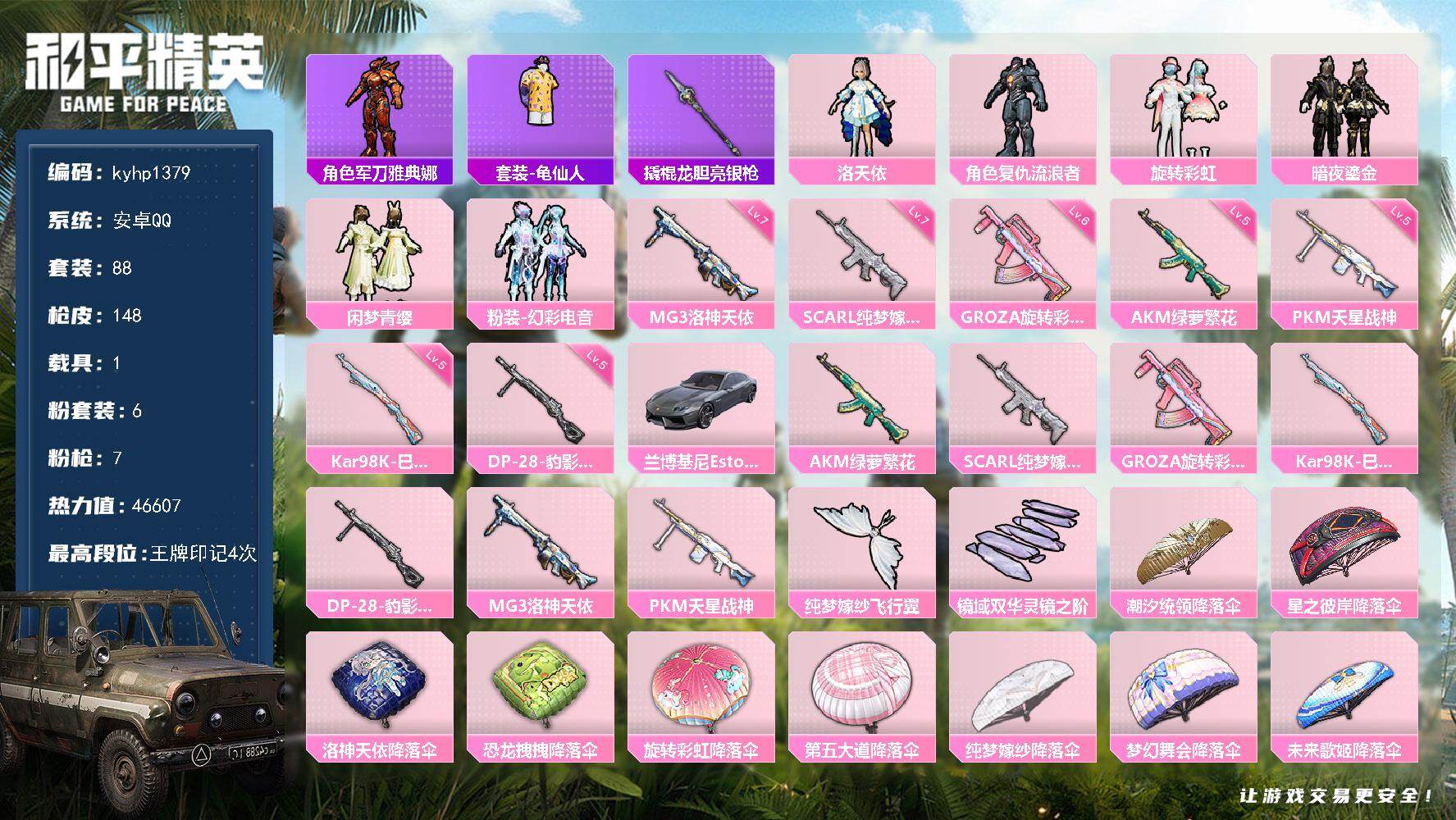 苹果 手Q3粉装-6特效枪-0载具-1粉色飞行器-25885热力值-1王牌印记-57套装-94枪皮
