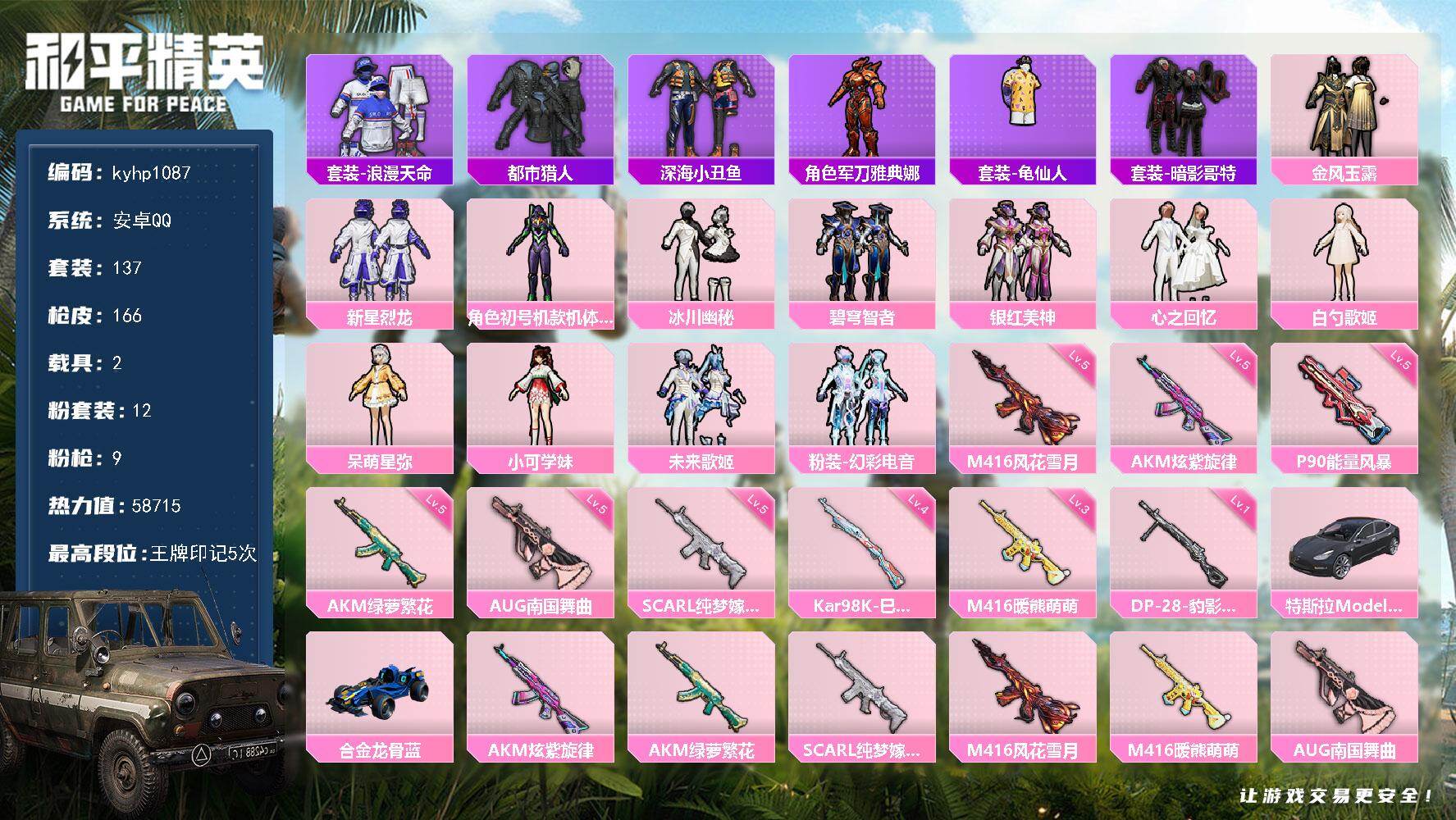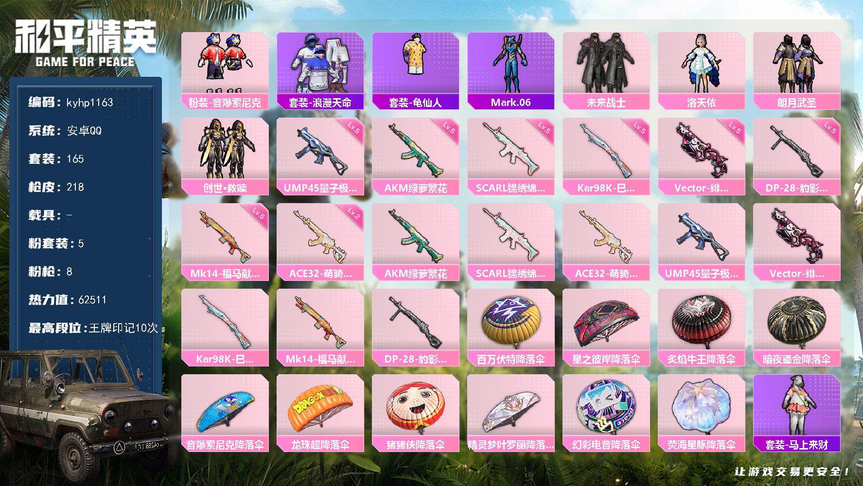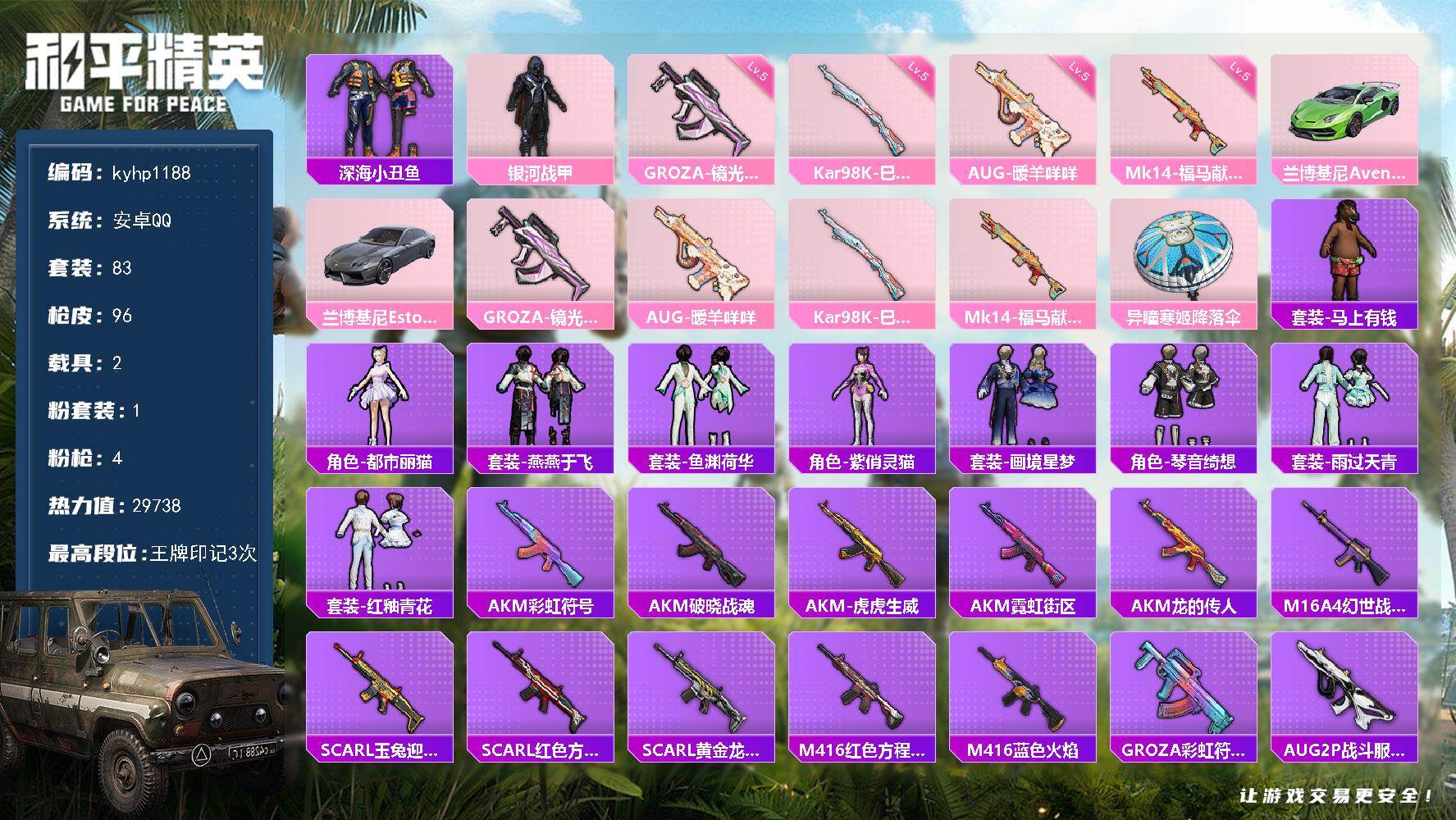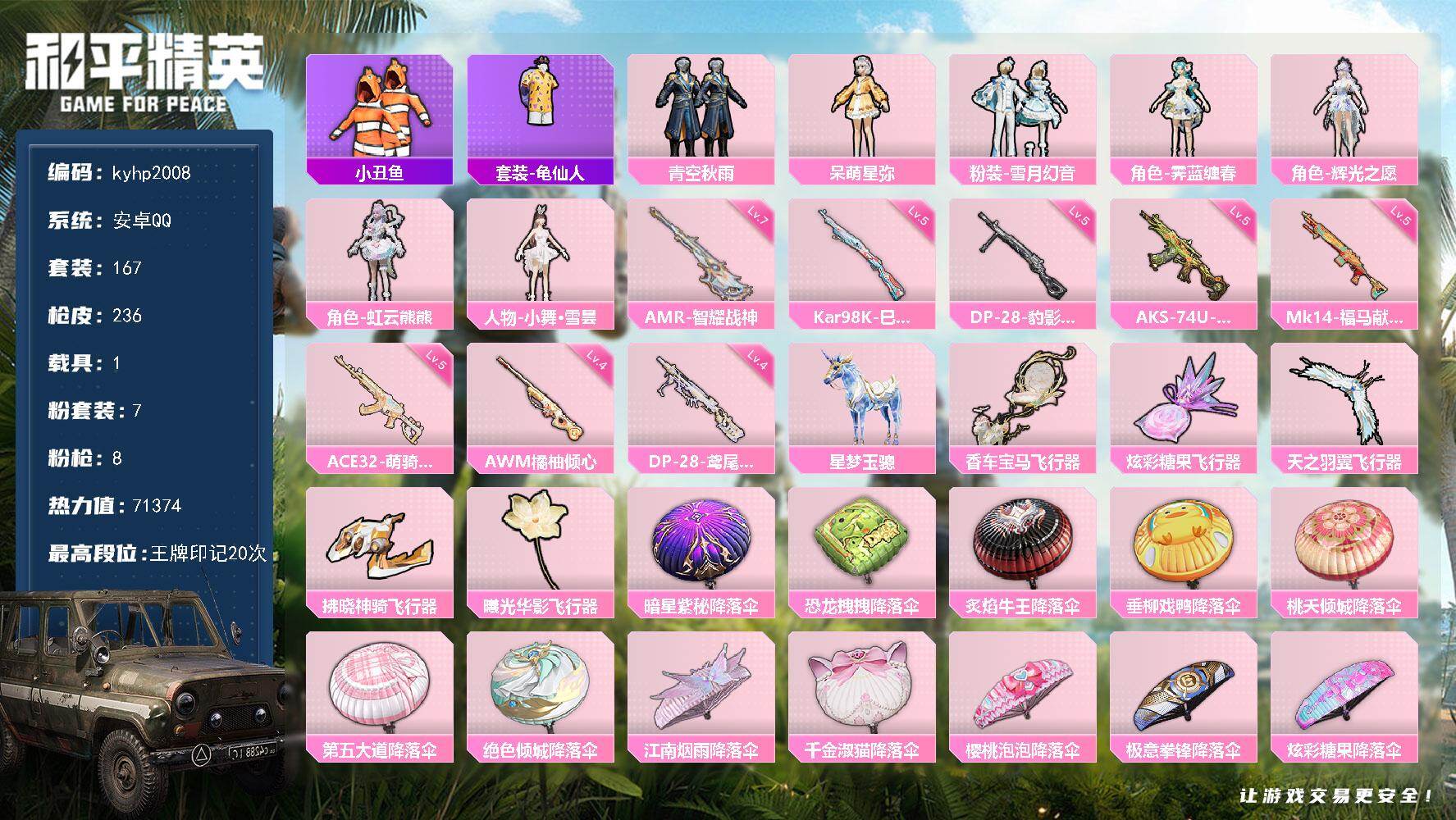 安卓 手Q1粉装-4特效枪-2载具-0粉色飞行器-29738热力值-3王牌印记-83套装-96枪皮