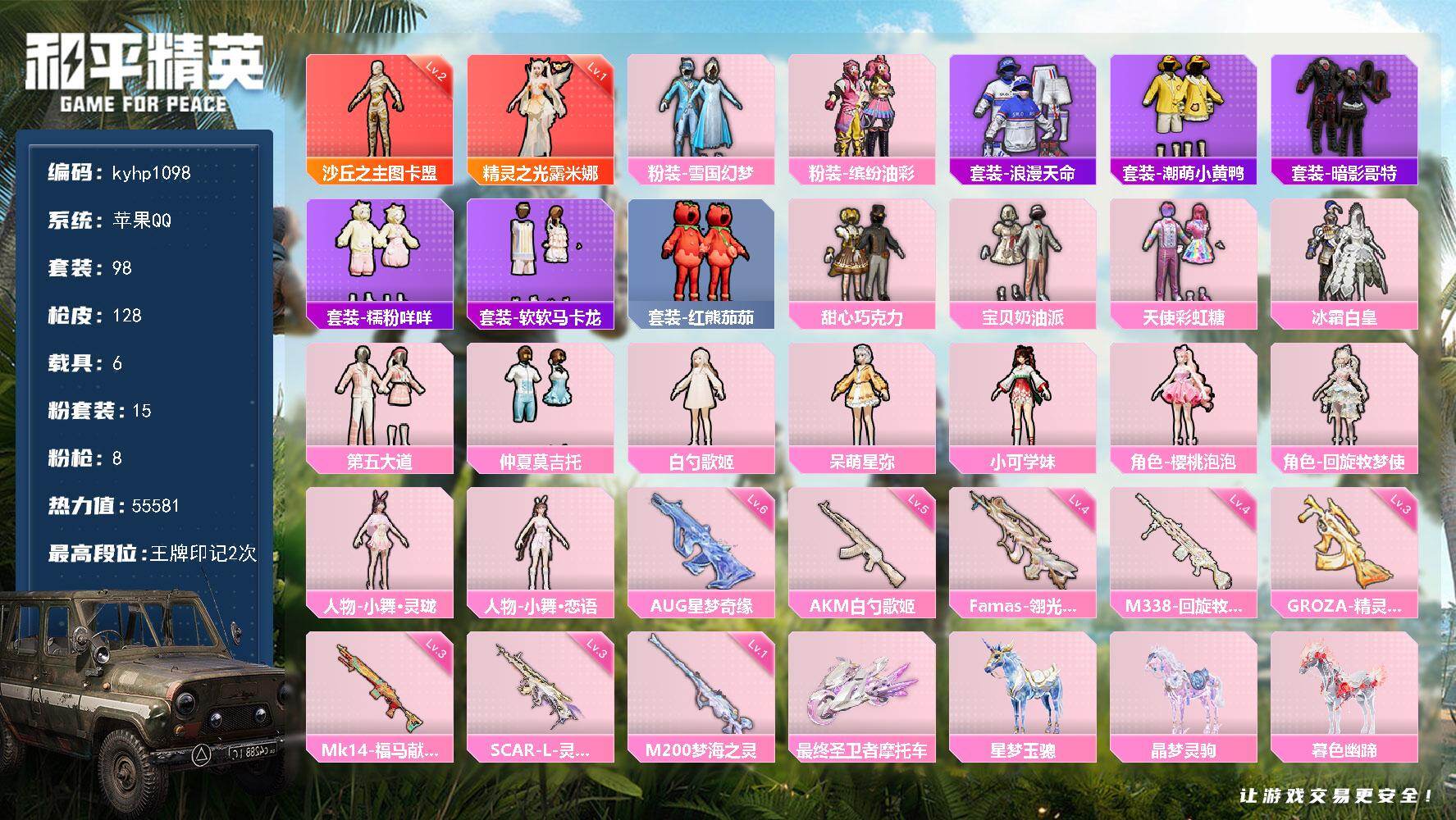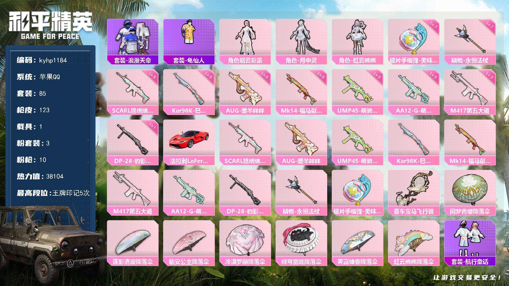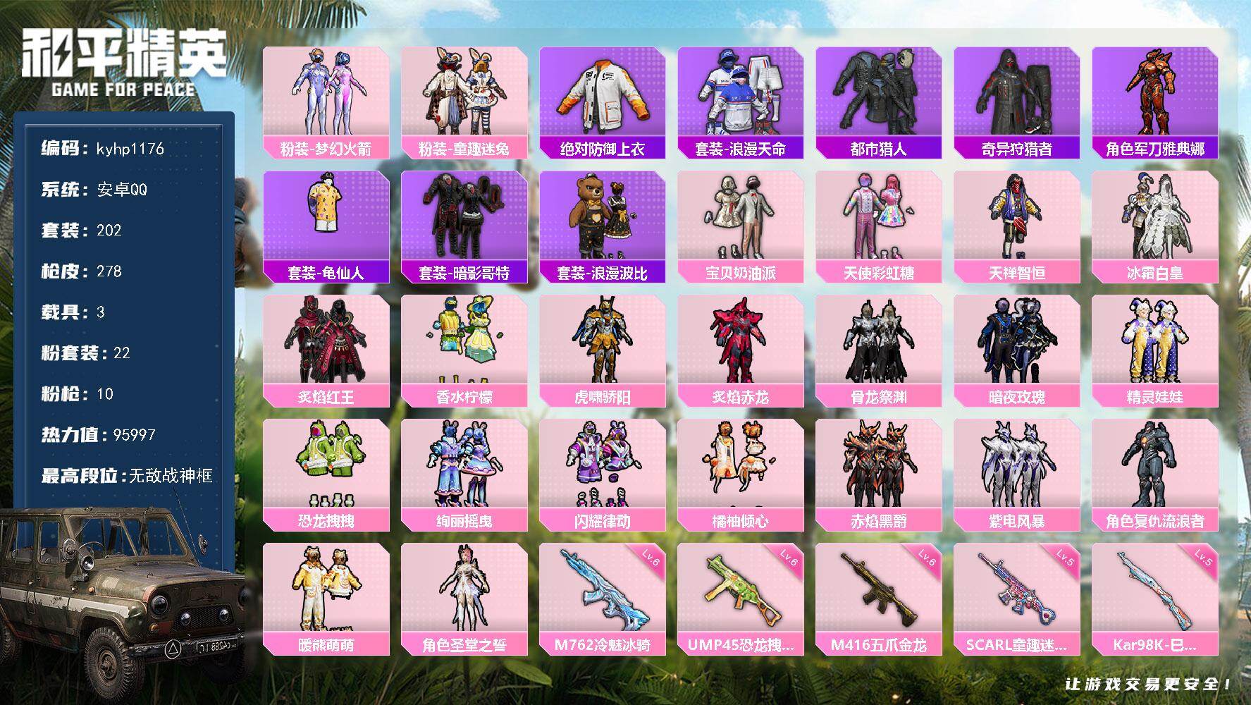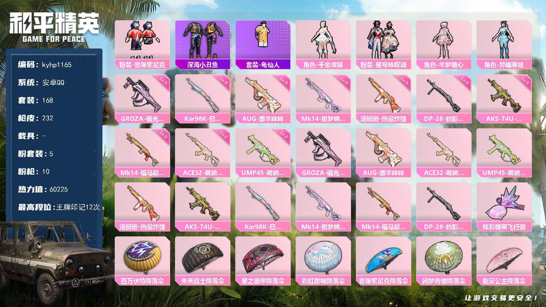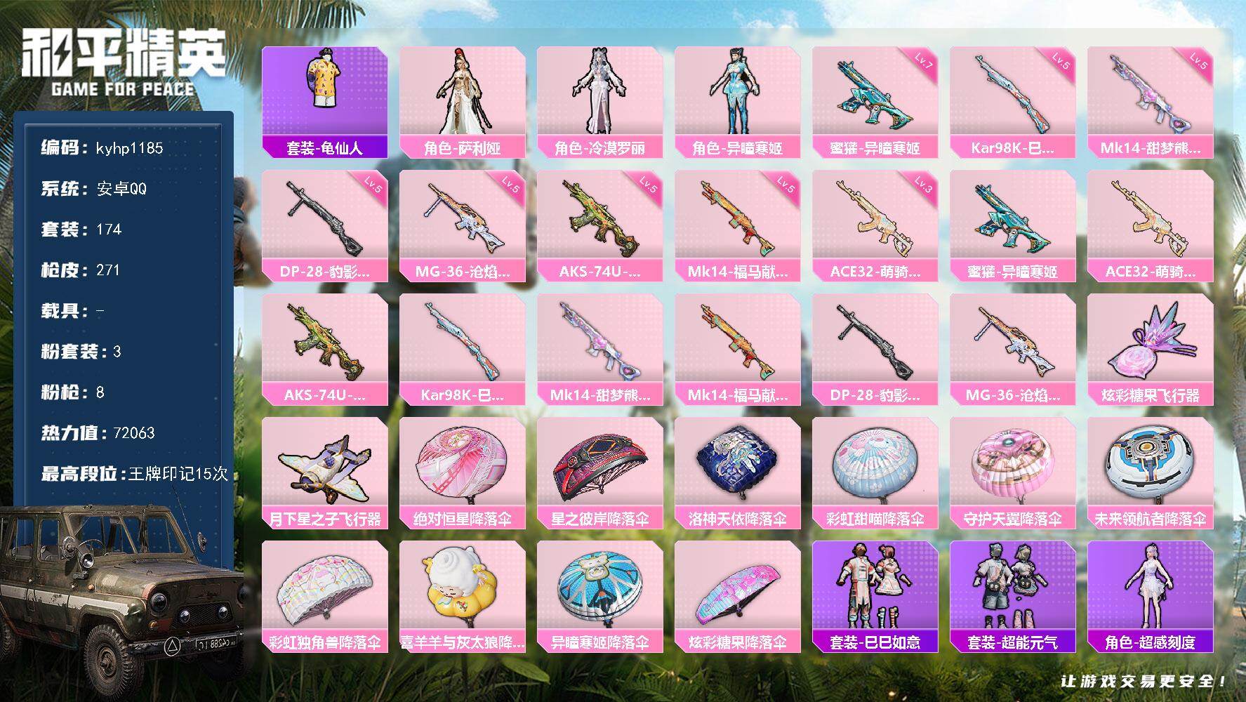 安卓 手Q1粉装-4特效枪-2载具-0粉色飞行器-29738热力值-3王牌印记-83套装-96枪皮