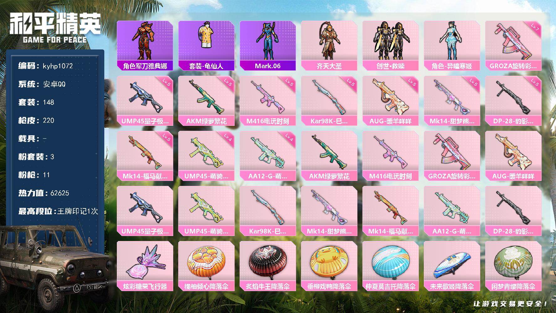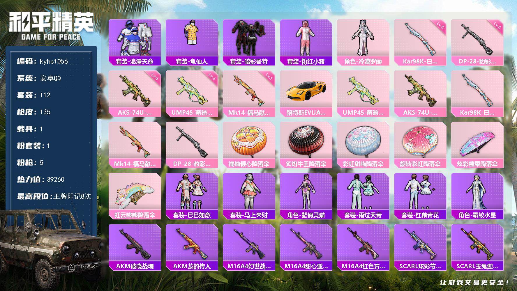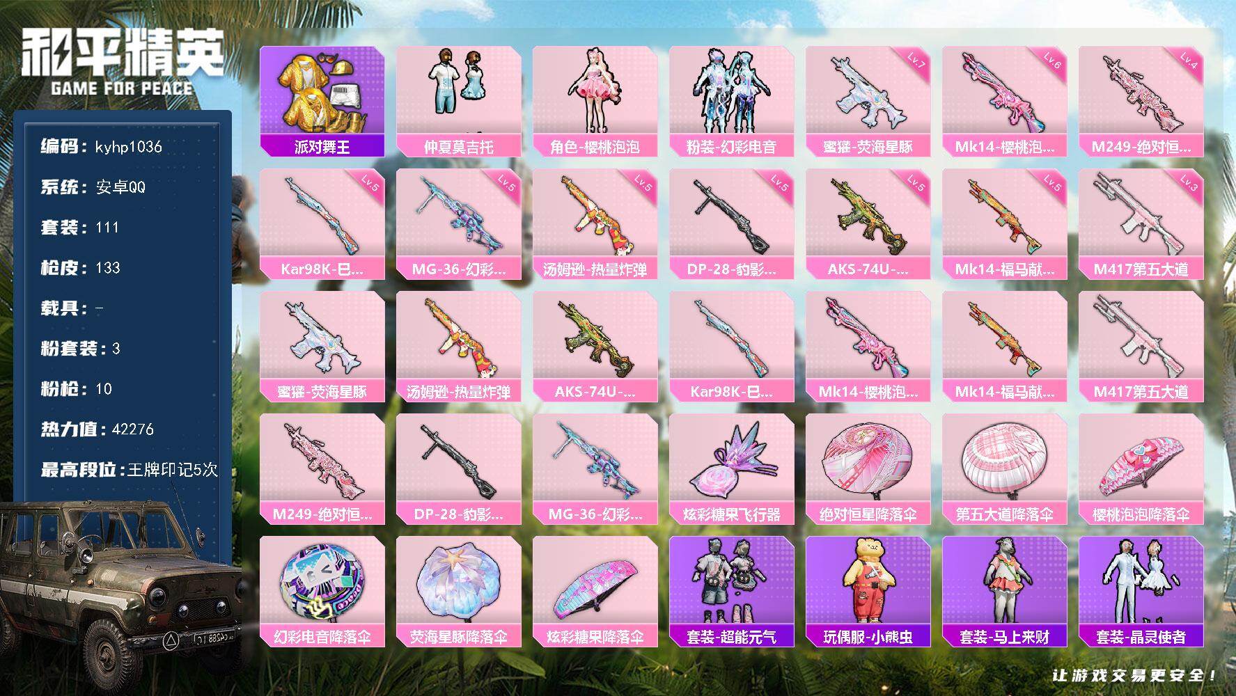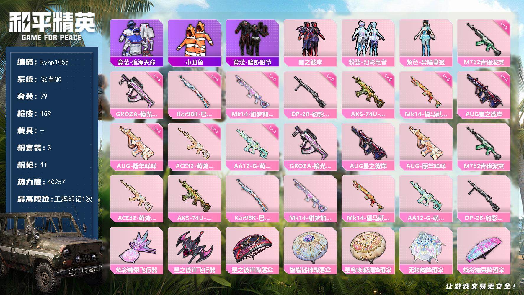 安卓 手Q1粉装-7特效枪-0载具-1粉色飞行器-30419热力值-5王牌印记-83套装-123枪皮