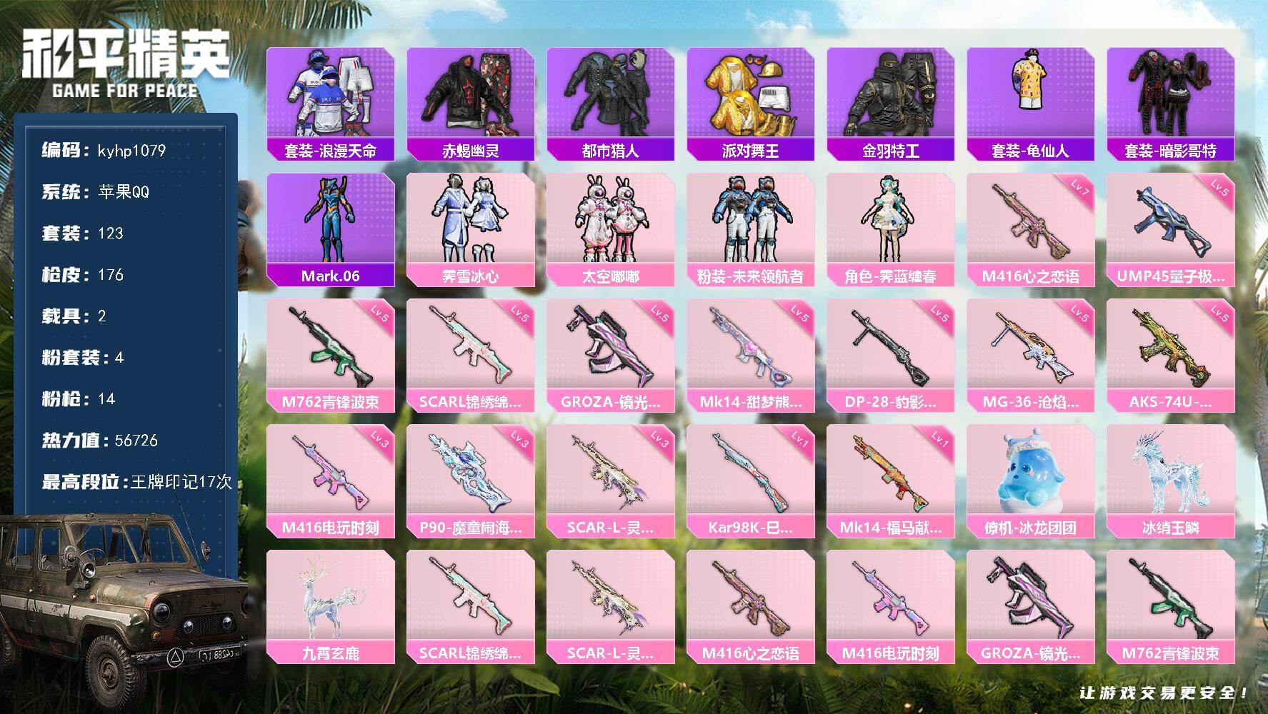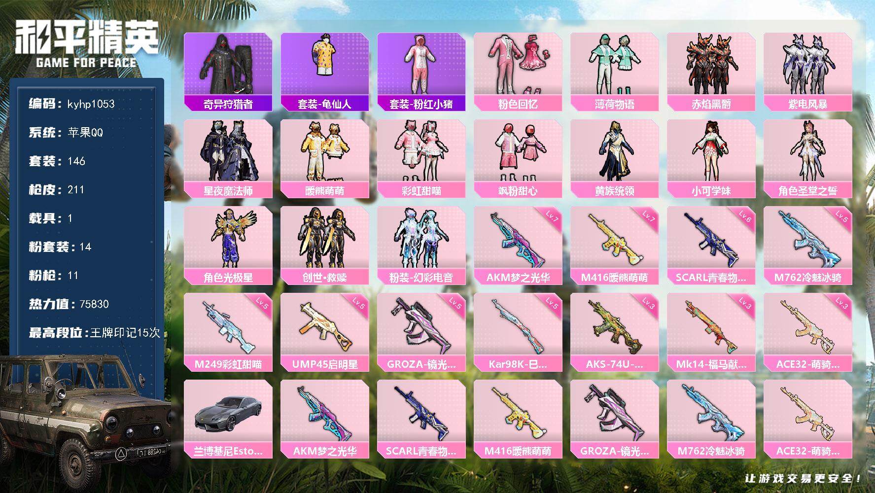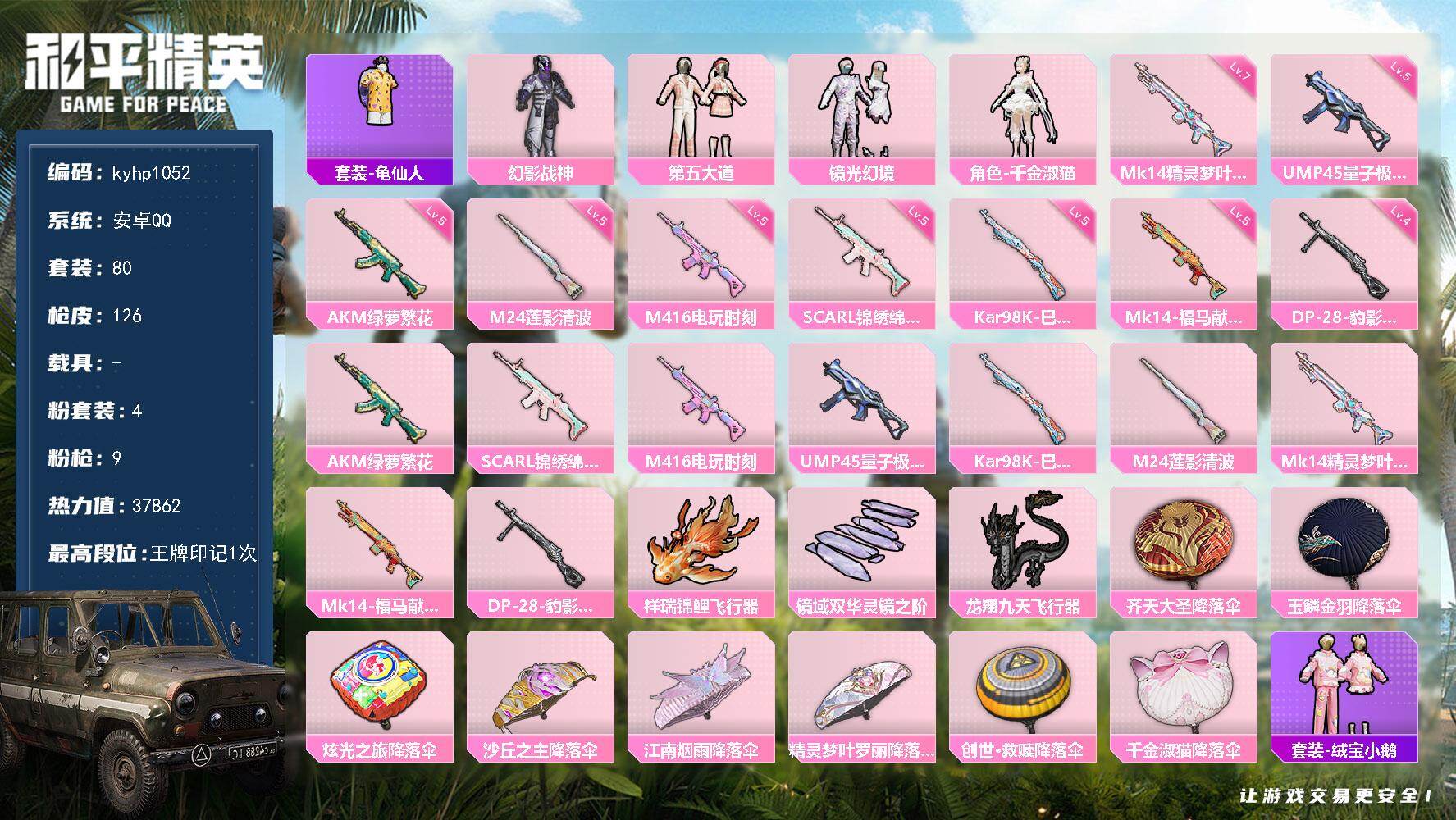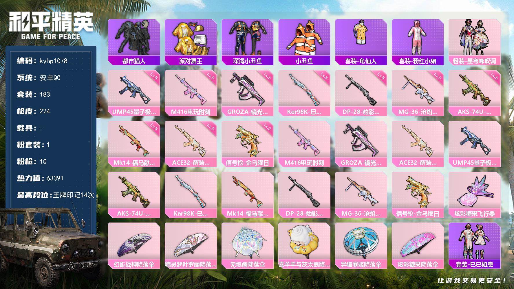 安卓 手Q1粉装-7特效枪-0载具-1粉色飞行器-30419热力值-5王牌印记-83套装-123枪皮
