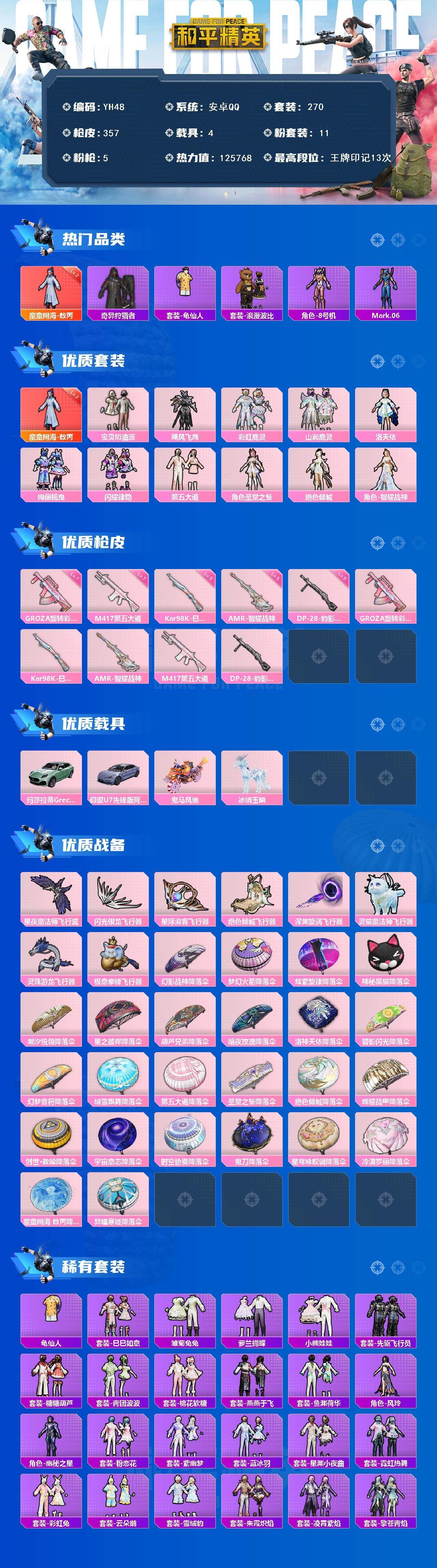 R56 可二次安卓 手Q-1神装-11粉装-5特效枪-4载具-9粉色飞行器-125768热力值-13王牌印记-270套装-357枪皮【红色神装等级】:魔童闹海-敖丙(二级)【红色角色神装】:魔童闹海-敖丙【热门品类】:套装-奇异狩猎者,套装-龟仙人,套装-浪漫波比,角色-8号机,角色-Mark.06【粉色套装】:粉装-宝贝奶油派,粉装-飓风飞鹰,粉装-彩虹鹿灵,粉装-山涧鹿灵,角色-洛天依,粉装-绚丽摇曳,粉装-闪耀律动,粉装-第五大道,角色-圣堂之誓,角色-绝色倾城,角色-智耀战神【粉色枪皮等级】:GROZA-旋转彩虹(七级),Kar98K-巳巳如意(五级),AMR-智耀战神(五级),M417-第五大道(七级),DP-28-豹影疾电(五级)【粉色载具】:玛莎拉蒂Grecale(薄荷绿),仰望U7(阿盖尔紫),鬼马风驰,冰绡玉鳞【粉色枪皮】:GROZA-旋转彩虹,Kar98K-巳巳如意,AMR-智耀战神,M417-第五大道,DP-28-豹影疾电【粉色飞行器】:星夜魔法师飞行翼,闪光银龙飞行器,星际浪客飞行器,绝色倾城飞行器,深渊漩涡飞行器,灵猫魔法师飞行器,灵珠游龙飞行器,极意拳锋飞行器【粉色降落伞】:幻影战神降落伞,梦幻火箭降落伞,炫紫旋律降落伞,神秘黑猫降落伞,潮汐统领降落伞,星之彼岸降落伞,葫芦兄弟降落伞,暗夜玫瑰降落伞,洛神天依降落伞,碧影闪光降落伞,幻梦音符降落伞,绒雪飘舞降落伞,第五大道降落伞,圣堂之誓降落伞,绝色倾城降落伞,辉耀战甲降落伞,创世·救赎降落伞,宇宙意志降落伞,时空协奏降落伞,鬼刀降落伞,星穹咏叹调降落伞,冷漠罗丽降落伞,魔童闹海 敖丙降落伞,异瞳寒姬降落伞,炫彩糖果降落伞,各种道具详情看截图、低价出售找回包 赔、截图展示段位不代 表实际段位,如赛季更新等不可抗拒因素发生变化、时限道具不保证所剩时间、标题未写送点劵默认不送【卖号买号首选亿梦】