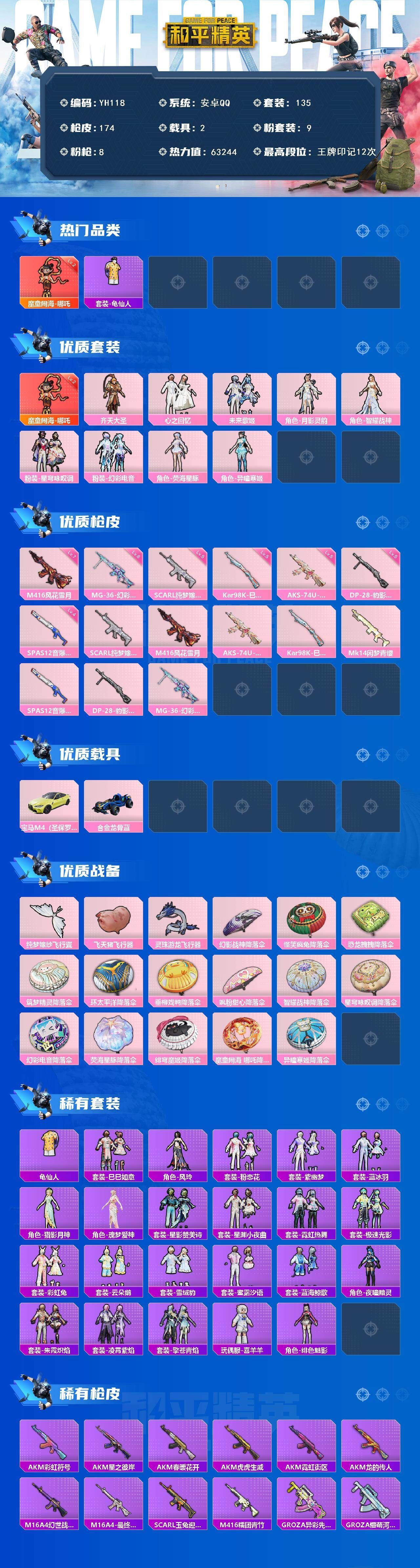 可二次安卓 手Q-1神装-9粉装-8特效枪-2载具-3粉色飞行器-63244热力值-12王牌印记-135套装-174枪皮【红色神装等级】:魔童闹海-哪吒(二级)【红色角色神装】:魔童闹海-哪吒【热门品类】:套装-龟仙人【粉色套装】:粉装-齐天大圣,粉装-心之回忆,粉装-未来歌姬,角色-月影灵韵,角色-智耀战神,粉装-星穹咏叹调,粉装-幻彩电音,角色-荧海星豚,角色-异瞳寒姬【粉色枪皮等级】:SCAR-L-纯梦嫁纱(五级),M416-风花雪月(七级),AKS-74U-星穹咏叹调(五级),Kar98K-巳巳如意(五级),SPAS-12-音爆索尼克(四级),DP-28-豹影疾电(五级),MG-36-幻彩电音(六级)【粉色载具】:宝马M4(圣保罗黄),合金龙骨(蓝)【粉色枪皮】:SCAR-L-纯梦嫁纱,M416-风花雪月,AKS-74U-星穹咏叹调,Kar98K-巳巳如意,Mk14-闲梦青缨,SPAS-12-音爆索尼克,DP-28-豹影疾电,MG-36-幻彩电音【粉色飞行器】:纯梦嫁纱飞行翼,飞天猪飞行器,灵珠游龙飞行器【粉色降落伞】:幻影战神降落伞,怪笑疯兔降落伞,恐龙拽拽降落伞,筑梦精灵降落伞,环太平洋降落伞,垂柳戏鸭降落伞,飒粉甜心降落伞,智耀战神降落伞,星穹咏叹调降落伞,幻彩电音降落伞,荧海星豚降落伞,绯穹魔姬降落伞,魔童闹海 哪吒降落伞,异瞳寒姬降落伞【稀有套装】:套装-龟仙人,套装-巳巳如意,角色-风玲,套装-粉恋花,套装-紫幽梦,套装-蓝冰羽,角色-猎影月神,角色-瑰梦爱神,套装-星影赞美诗,套装-星渊小夜曲,套装-霓虹热舞,套装-极速光影,套装-彩虹兔,套装-云朵鹅,套装-雪绒豹,套装-蜜露汐语,套装-蓝海鲸歌,角色-夜瞳黯灵,套装-朱霞炽焰,套装-凌霄紫焰,套装-擎苍青焰,玩偶服-喜羊羊,角色-绯色魅影,各种道具详情看截图、低价出售找回包 赔、截图展示段位不代 表实际段位,如赛季更新等不可抗拒因素发生变化、时限道具不保证所剩时间、标题未写送点劵默认不送【卖号买号首选亿梦】