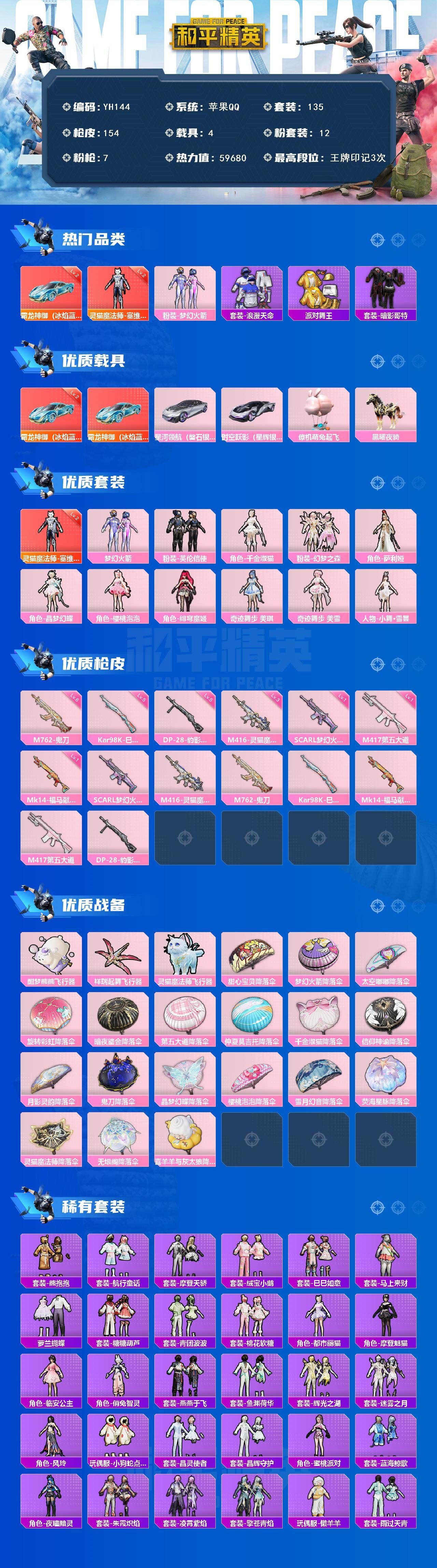 可二次苹果 手Q【送金铲铲2神话】-1神装-12粉装-7特效枪-4载具-4粉色飞行器-59680热力值-3王牌印记-135套装-154枪皮【红色载具】:霜龙神御(冰焰蓝)(二级)【红色神装等级】:灵猫魔法师-塞维尔(二级)【红色角色神装】:灵猫魔法师-塞维尔【热门品类】:粉装-梦幻火箭,套装-浪漫天命,套装-派对舞王,套装-暗影哥特【粉色套装】:粉装-梦幻火箭,粉装-英伦信使,角色-千金淑猫,粉装-幻梦之森,角色-萨利娅,角色-晶梦幻蝶,角色-樱桃泡泡,角色-绯穹魔姬,角色-奇迹舞步 美琪,角色-奇迹舞步 美雪,人物-小舞·雪昙【粉色枪皮等级】:SCAR-L-梦幻火箭(一级),M416-灵猫魔法师(三级),M762-鬼刀(六级),Kar98K-巳巳如意(五级),Mk14-福马献瑞(一级),M417-第五大道(一级),DP-28-豹影疾电(五级)【粉色载具】:霜龙神御(冰焰蓝),星河领航(磐石银),时空跃影(星辉银),僚机-萌兔起飞,黑曜夜骑【粉色枪皮】:SCAR-L-梦幻火箭,M416-灵猫魔法师,M762-鬼刀,Kar98K-巳巳如意,Mk14-福马献瑞,M417-第五大道,DP-28-豹影疾电【粉色飞行器】:酣梦熊熊飞行器,祥瑞起舞飞行器,灵猫魔法师飞行器【粉色降落伞】:甜心宝贝降落伞,梦幻火箭降落伞,太空嘟嘟降落伞,旋转彩虹降落伞,暗夜鎏金降落伞,第五大道降落伞,仲夏莫吉托降落伞,千金淑猫降落伞,信仰神谕降落伞,月影灵韵降落伞,鬼刀降落伞,晶梦幻蝶降落伞,樱桃泡泡降落伞,雪月幻音降落伞,荧海星豚降落伞,灵猫魔法师降落伞,无垠阁降落伞,喜羊羊与灰太狼降落伞,金铲铲:苹果QQ【2神话】【离子火花超级粉丝小小安妮+月华之子海月神小小佛耶戈+以上所有英雄专属攻击特效】【小小霞+专属攻击特效】【幻境竞技场】各种道具详情看截图、低价出售找回包 赔、截图展示段位不代 表实际段位,如赛季更新等不可抗拒因素发生变化、时限道具不保证所剩时间、标题未写送点劵默认不送【卖号买号首选亿梦】