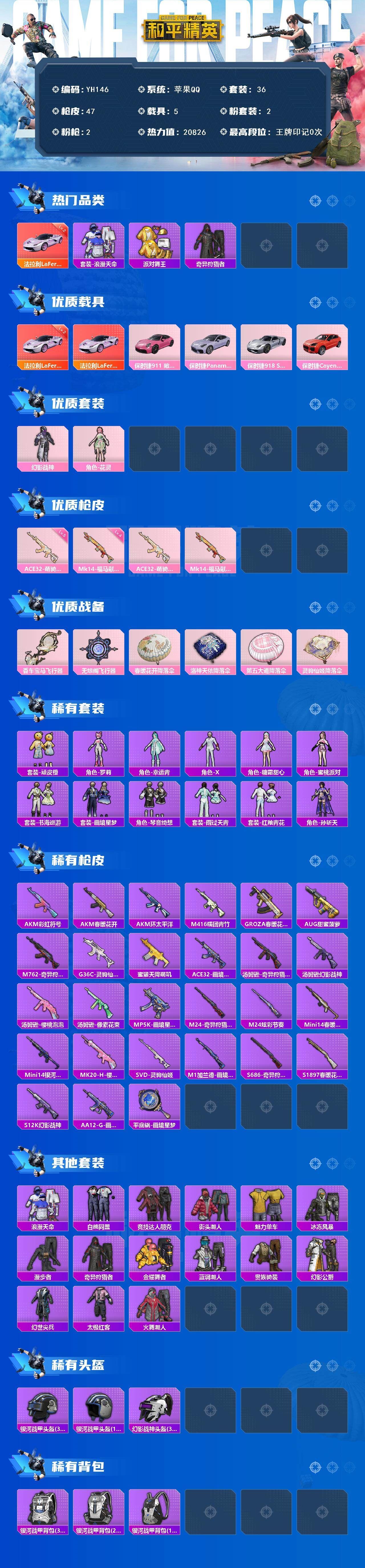 可二次苹果 手Q-2粉装-2特效枪-5载具-3粉色飞行器-20826热力值-2王牌印记-36套装-47枪皮【红色载具】:法拉利LaFerrari(曜夜辉)(二级)【热门品类】:套装-浪漫天命,套装-派对舞王,套装-奇异狩猎者【粉色套装】:粉装-幻影战神,角色-花灵【粉色枪皮等级】:ACE32-萌骑漫游(五级),Mk14-福马献瑞(四级)【粉色载具】:法拉利LaFerrari(曜夜辉),保时捷911 敞篷版(星珀红),保时捷Panamera(星辰紫),保时捷918 Spyder(液态银),保时捷Cayenne(激情红)【粉色枪皮】:ACE32-萌骑漫游,Mk14-福马献瑞【粉色飞行器】:香车宝马飞行器,无垠阁飞行器【粉色降落伞】:春暖花开降落伞,洛神天依降落伞,第五大道降落伞,灵驹仙姬降落伞【稀有套装】:套装-顽皮橙,角色-罗莉,角色-幸运青,角色-X,角色-糖霜甜心,角色-蜜桃派对,套装-书海巡游,套装-画境星梦,套装-琴音绮想,套装-雨过天青,套装-红釉青花,角色-孙斩天,各种道具详情看截图、低价出售找回包 赔、截图展示段位不代 表实际段位,如赛季更新等不可抗拒因素发生变化、时限道具不保证所剩时间、标题未写送点劵默认不送【卖号买号首选亿梦】
