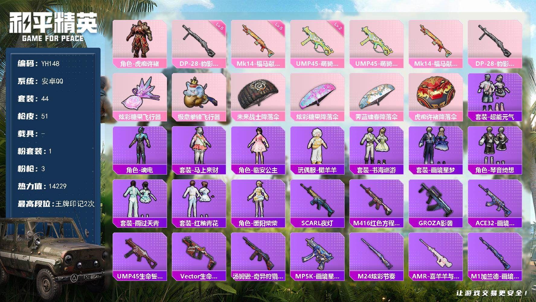 可二次安卓 手Q-1粉装-3特效枪-0载具-2粉色飞行器-14229热力值-2王牌印记-44套装-51枪皮【粉色套装】:角色-虎痴许褚【粉色枪皮等级】:UMP45-萌骑冒险(二级),Mk14-福马献瑞(五级),DP-28-豹影疾电(五级)【粉色枪皮】:UMP45-萌骑冒险,Mk14-福马献瑞,DP-28-豹影疾电【粉色飞行器】:炫彩糖果飞行器,极意拳锋飞行器【粉色降落伞】:未来战士降落伞,炫彩糖果降落伞,霁蓝缠春降落伞,虎痴许褚降落伞【稀有套装】:套装-超能元气,套装-雪国风尚,角色-魂电,套装-马上来财,角色-临安公主,玩偶服-懒羊羊,套装-书海巡游,套装-画境星梦,套装-琴音绮想,套装-雨过天青,套装-红釉青花,角色-暖阳柴柴【稀有枪皮】:SCAR-L-夜灯,M416-红色方程式,GROZA-影袭,ACE32-画境星梦,UMP45-生命誓言,Vector-生命誓言,汤姆逊-奇异狩猎者,MP5K-画境星梦,M24-炫彩节奏,AMR-喜羊羊与灰太狼,M1加兰德-画境星梦,S686-生命誓言,S1897-荧海星豚,AA12-G-画境星梦,爆炸猎弓-喜羊羊与灰太狼,平底锅-画境星梦【其他套装】:套装-幻影武者,套装-旭日情侣,套装-海岛探路者,套装-潮流炫酷,套装-猛禽,套装-玉兔迎春,套装-王牌教练,套装-破晓战魂,套装-破蛋小黄鸡,套装-耀粉歌者,套装-街头潮人,套装-青年教官,套装-青涩时光,套装-魅力单车,套装-黄色运动,套装-黑色伏地魔,套装-龙的传人【稀有头盔】:梦幻火箭头盔(2级)【稀有背包】:金羽特工背包(2级)【营地ID】:1008113493,各种道具详情看截图、低价出售找回包 赔、截图展示段位不代 表实际段位,如赛季更新等不可抗拒因素发生变化、时限道具不保证所剩时间、标题未写送点劵默认不送【卖号买号首选亿梦】