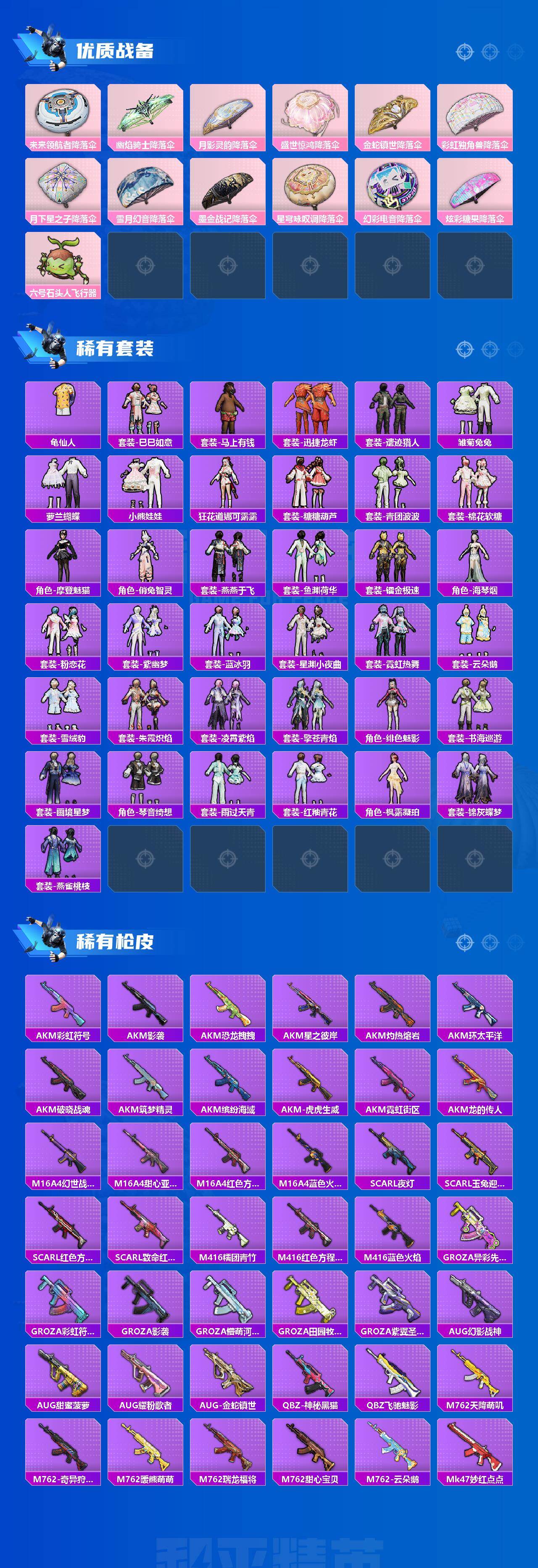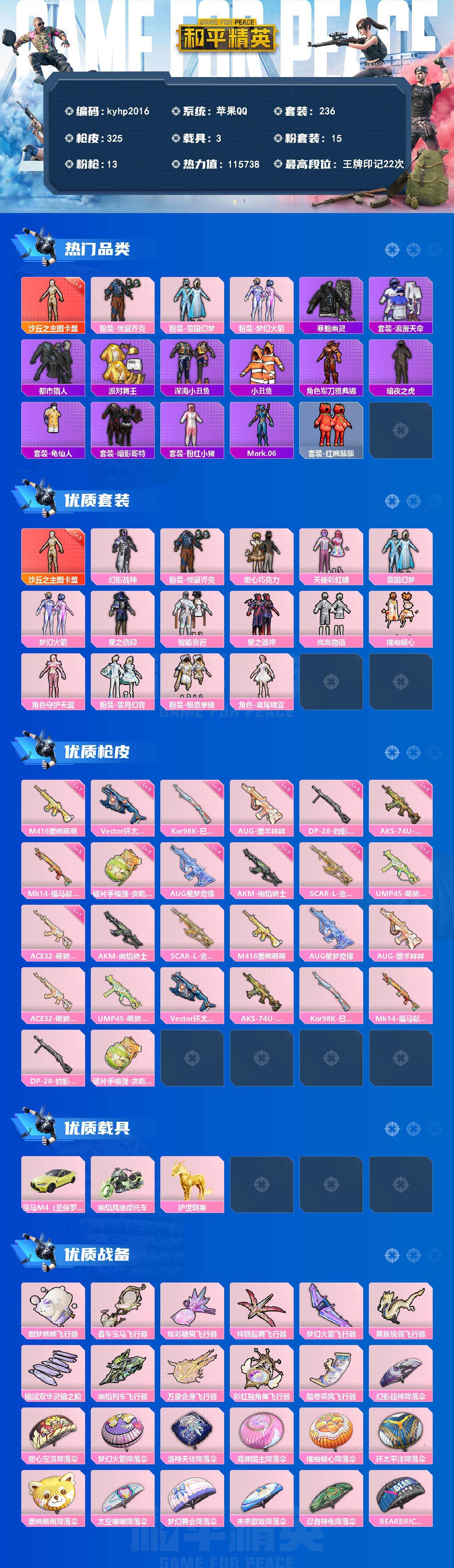 苹果 手Q1神装-15粉装-13特效枪-3载具-12粉色飞行器-115738热力值-22王牌印记-236套装-325枪皮 【红色神装等级】:沙丘之主-图卡盟(五级) 【红色角色神装】:沙丘之主-图卡盟 【热门品类】:粉装-怪诞乔克,粉装-雪国幻梦,粉装-梦幻火箭,套装-寒蝎幽灵,套装-浪漫天命,套装-都市猎人,套装-派对舞王,套装-深海小丑鱼,套装-小丑鱼,角色-军刀雅典娜,套装-暗夜之虎,套装-龟仙人,套装-暗影哥特,套装-粉红小猪,角色-Mark.06,套装-红熊茄茄 【粉色套装】:粉装-幻影战神,粉装-怪诞乔克,粉装-甜心巧克力,粉装-天使彩虹糖,粉装-雪国幻梦,粉装-梦幻火箭,粉装-星之信仰,粉装-智能音符,粉装-星之彼岸,粉装-岚岚物语,粉装-橘柚倾心,角色-守护天翼,粉装-雪月幻音,粉装-极意拳锋,角色-鸢尾珑雾 【粉色枪皮等级】:AKM-幽焰骑士(三级),SCAR-L-金蛇镇世(三级),M416-暖熊萌萌(七级),AUG-星梦奇缘(四级),AUG-暖羊咩咩(五级),ACE32-萌骑漫游(一级),UMP45-萌骑冒险(二级),Vector-环太平洋(五级),AKS-74U-森灵之息(五级),Kar98K-巳巳如意(五级),Mk14-福马献瑞(五级),DP-28-豹影疾电(五级),破片手榴弹-贪吃小熊(五级) 【粉色载具】:宝马M4(圣保罗黄),幽焰风驰摩托车,护世瑞兽 【粉色枪皮】:AKM-幽焰骑士,SCAR-L-金蛇镇世,M416-暖熊萌萌,AUG-星梦奇缘,AUG-暖羊咩咩,ACE32-萌骑漫游,UMP45-萌骑冒险,Vector-环太平洋,AKS-74U-森灵之息,Kar98K-巳巳如意,Mk14-福马献瑞,DP-28-豹影疾电,破片手榴弹-贪吃小熊 【粉色飞行器】:酣梦熊熊飞行器,香车宝马飞行器,炫彩糖果飞行器,祥瑞起舞飞行器,梦幻火箭飞行器,黄族统领飞行器,镜域双华-灵镜之阶,幽焰列车飞行器,万象金身飞行器,彩虹独角兽飞行器,踏卷乘风飞行器 【粉色降落伞】:幻影战神降落伞,甜心宝贝降落伞,梦幻火箭降落伞,洛神天依降落伞,海渊国主降落伞,橘柚倾心降落伞,环太平洋降落伞,暖熊萌萌降落伞,太空嘟嘟降落伞,梦幻舞会降落伞,未来歌姬降落伞,忍者神龟降落伞,BEARBRICK降落伞,未来领航者降落伞,幽焰骑士降落伞,月影灵韵降落伞,盛世惊鸿降落伞,金蛇镇世降落伞,彩虹独角兽降落伞,月下星之子降落伞,雪月幻音降落伞,墨金战记降落伞,星穹咏叹调降落伞,幻彩电音降落伞,炫彩糖果降落伞,六号石头人飞行器 【稀有套装】:套装-龟仙人,套装-巳巳如意,套装-雪国风尚,套装-炫彩糖果,套装-马上有钱,套装-迅捷龙虾,套装-遗迹猎人,套装-雏菊兔兔,套装-萝兰蝴蝶,套装-小熊娃娃,角色-狂花道·娜可露露,套装-糖糖葫芦,套装-青团波波,套装-棉花软糖,角色-摩登魅猫,角色-俏兔智灵,套装-燕燕于飞,套装-鱼渊荷华,套装-镭金极速,角色-海琴烟,套装-粉恋花,套装-紫幽梦,套装-蓝冰羽,套装-星渊小夜曲,套装-霓虹热舞,套装-云朵鹅,套装-雪绒豹,套装-朱霞炽焰,套装-凌霄紫焰,套装-擎苍青焰,角色-绯色魅影,套装-书海巡游,套装-画境星梦,套装-琴音绮想,套装-雨过天青,套装-红釉青花,角色-枫露凝珀,套装-锦灰蝶梦,套装-燕雀桃枝 【稀有枪皮】:AKM-彩虹符号,AKM-影袭,AKM-恐龙拽拽,AKM-星之彼岸,AKM-灼热熔岩,AKM-环太平洋,AKM-破晓战魂,AKM-筑梦精灵,AKM-缤纷海域,AKM-虎虎生威,AKM-霓虹街区,AKM-龙的传人,M16A4-幻世战舞者,M16A4-甜心亚梦,M16A4-红色方程式,M16A4-蓝色火焰,SCAR-L-夜灯,SCAR-L-玉兔迎春,SCAR-L-红色方程式,SCAR-L-致命红樱,M416-糯团青竹,M416-红色方程式,M416-蓝色火焰,GROZA-异彩先驱,GROZA-彩虹符号,GROZA-影袭,GROZA-懵萌河马,GROZA-田园牧歌,GROZA-紫翼圣骑,AUG-幻影战神,AUG-甜蜜菠萝,AUG-耀粉歌者,AUG-金蛇镇世,QBZ-神秘黑猫,QBZ-飞驰魅影,M762-天降萌叽,M762-奇异狩猎者,M762-暖熊萌萌,M762-瑞龙福将,M762-甜心宝贝,M762-云朵鹅,Mk47-妙红点点,Mk47-洛神天依,G36C-懵萌河马,G36C-六号石头人,AC-VAL-天降萌叽,AC-VAL-甜心亚梦,蜜獾-天降萌叽,蜜獾-娇憨猪猪,ACE32-画境星梦,ARX-凌霄紫焰,UZI-啾咪啾咪,UZI-天降萌叽,UZI-娇憨猪猪,UZI-幻影战神,UZI-影袭,UZI-炫彩节奏,UZI-红色方程式,UZI-盛世惊鸿,UZI-月影灵韵,UMP45-夜灯,UMP45-海渊国主,UMP45-生命誓言,UMP45-蓝色火焰,UMP45-金玉无双,Vector-生命誓言,Vector-田园牧歌,Vector-金玉无双,汤姆逊-天降萌叽,汤姆逊-幻影战神,汤姆逊-异彩先驱,汤姆逊-暗夜鎏金,汤姆逊-炫彩节奏,汤姆逊-环太平洋,汤姆逊-耀粉歌者,汤姆逊-像素花束,MP5K-异彩先驱,MP5K-彩虹嘻嘻猴,MP5K-蓝莓炮弹,MP5K-飒粉甜心,MP5K-画境星梦,JS9-凌霄紫焰,MP7-G-锦灰蝶梦,P90-筑梦精灵,P90-飞驰魅影,P90-巳巳如意,Kar98K-幻影战神,Kar98K-彩虹符号,Kar98K-梦幻火箭,Kar98K-洛神天依,Kar98K-炫彩节奏,Kar98K-红伞翩翩,Kar98K-红色方程式,Kar98K-蓝莓炮弹,Kar98K-飞驰魅影,Kar98K-星穹咏叹调,M24-影袭,M24-炫彩节奏,AWM-恐龙拽拽,AWM-绿意幻情,AWM-雷霆特警,SKS-炫彩节奏,SKS-迅猛狂鲨,VSS-星之彼岸,VSS-田园牧歌,Mini14-异彩先驱,Mini14-星夜魔法师,Mini14-海渊国主,Mini14-涂山之恋,Mini14-炫彩节奏,Mini14-穿刺龙虾,Mini14-耀粉歌者,Mini14-金玉无双,Mk14-红伞翩翩,Win94-瑞龙福将,Win94-晶梦幻蝶,SLR-娇憨猪猪,SLR-彩虹符号,莫辛纳甘-懵萌河马,莫辛纳甘-炙焰牛王,AMR-妙红点点,M417-惊鸿侠骨,M417-锦灰蝶梦,M200-惊鸿侠骨,SVD-云朵鹅,M1加兰德-画境星梦,S686-奇异狩猎者,S686-彩虹符号,S686-生命誓言,S686-红色方程式,S686-巳巳如意,S1897-炫彩节奏,S1897-飞驰魅影,S1897-锦灰蝶梦,S12K-玩趣呆呆,S12K-瑞龙福将,S12K-破晓战魂,S12K-音爆索尼克,S1