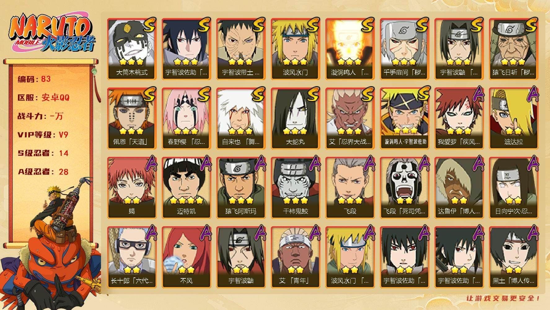 r51122 可二次安卓qq2803区,14S级忍者数-28A级忍者数,V9,654万战力【S级忍者】:猿飞日斩「秽土转生」(3星),千手扉间「秽土转生」(3星),春野樱「忍界大战」(3星),宇智波带土「忍界大战」(3星),艾「忍界大战」(3星),宇智波鼬「须佐能乎」(3星),自来也「舞之豪杰」(3星),大蛇丸(3星),波风水门(3星),漩涡鸣人「九喇嘛连结」(3星),佩恩「天道」(3星),宇智波佐助「永恒万花筒」(3星),大筒木桃式(3星),漩涡鸣人·宇智波佐助(3星)【A级忍者】:艾「青年」(2星),波风水门「青年」(2星),达鲁伊「博人传」(2星),迪达拉(2星),飞段(3星),飞段「死司凭血」(2星),干柿鬼鲛(3星),漩涡博人「桃式显现」(2星),迈特凯(4星),我爱罗「疾风传」(3星),蝎(2星),小南「漂泊浪客」(2星),猿飞阿斯玛(3星),宇智波止水「新春限定」(2星),宇智波鼬(2星),宇智波佐助「须佐能乎」(2星),宇智波佐助「万花筒写轮眼」(2星),照美冥「五代目水影」(2星),日向宁次「忍界大战」(2星),日向雏田「最终章」(2星),长十郎「六代目水影」(2星),李洛克「忍界大战」(2星),黑土「博人传」(2星),秋道丁次「忍界大战」(2星),千代「近松十人卫」(2星),神农「羁绊」(2星),不风(2星),宇智波泉奈(2星),各种道具详情看截图、低价出售找回包 赔、截图展示段位不代 表实际段位,如赛季更新等不可抗拒因素发生变化、时限道具不保证所剩时间、标题未写送点劵默认不送【卖号买号首选亿梦】