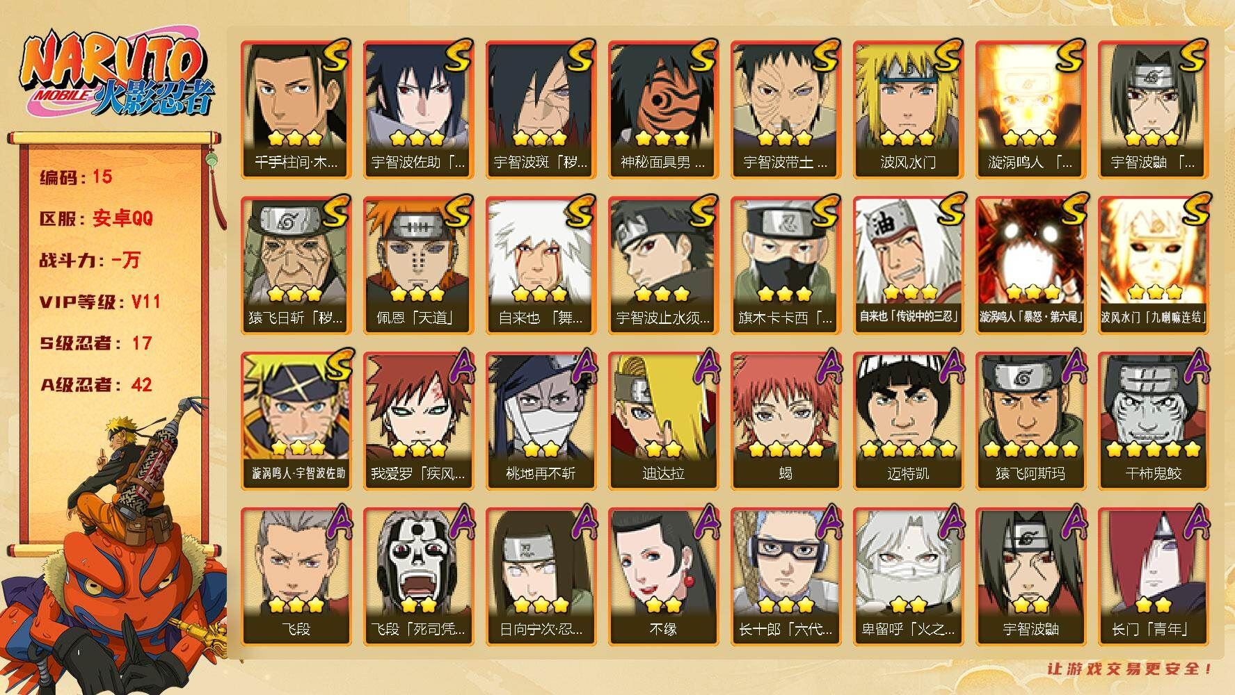可二次安卓qq3197区,v11,1400w战力,17S级忍者数-42A级忍者数【S级忍者】:猿飞日斩「秽土转生」(3星),宇智波斑「秽土转生·解」(3星),宇智波带土「忍界大战」(3星),宇智波鼬「须佐能乎」(3星),宇智波止水「须佐能乎」(3星),旗木卡卡西「须佐能乎」(3星),千手柱间「木叶创立」(3星),自来也「舞之豪杰」(3星),自来也「传说中的三忍」(3星),波风水门(3星),神秘面具男「红夜之刃」(3星),漩涡鸣人「九喇嘛连结」(3星),佩恩「天道」(3星),宇智波佐助「永恒万花筒」(3星),漩涡鸣人「暴怒·第六尾」(3星),波风水门「九喇嘛连结」(3星),漩涡鸣人·宇智波佐助(3星)【A级忍者】:艾「青年」(2星),长门「青年」(2星),迪达拉(2星),迪达拉「秽土转生」(2星),大蛇丸「晓」(2星),奇拉比「忍界大战」(2星),飞段(3星),飞段「死司凭血」(2星),干柿鬼鲛(5星),漩涡鸣人「九尾查克拉」(2星),机械鸣人「初始形态」(2星),迈特凯(5星),旗木卡卡西「幻之真容」(2星),旗木卡卡西「神威对决」(2星),桃地再不斩(2星),桃地再不斩「秽土转生」(2星),我爱罗「疾风传」(3星),蝎(4星),蝎「绯流琥」(2星),小南「漂泊浪客」(2星),小南「神驹佑将」(2星),角都「秽土转生」(2星),猿飞阿斯玛(5星),宇智波鼬(2星),宇智波佐助「须佐能乎」(2星),宇智波佐助「疾风传咒印」(2星),药师兜「侠隐江湖」(2星),照美冥「五代目水影」(2星),日向宁次「忍界大战」(3星),宇智波带土「暴怒」(2星),长十郎「六代目水影」(3星),卑留呼「火之意志继承者」(2星),李洛克「忍界大战」(3星),黑土「博人传」(2星),秋道丁次「忍界大战」(2星),千代「近松十人卫」(2星),神农「羁绊」(2星),土台「忍界大战」(4星),不缘(2星),宇智波泉奈(2星),巳月「仙人模式」(2星),迈特凯「青春爆炸」(2星),各种道具详情看截图、低价出售找回包 赔、截图展示段位不代 表实际段位,如赛季更新等不可抗拒因素发生变化、时限道具不保证所剩时间、标题未写送点劵默认不送【卖号买号首选亿梦】