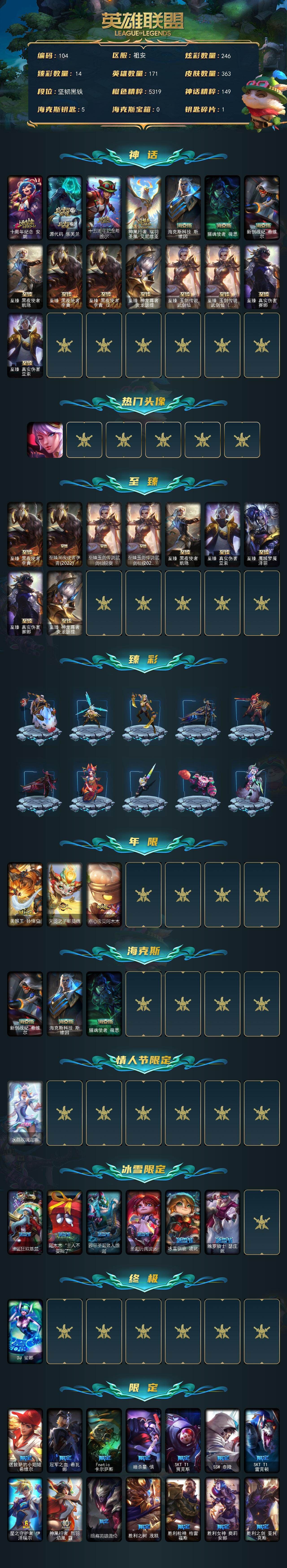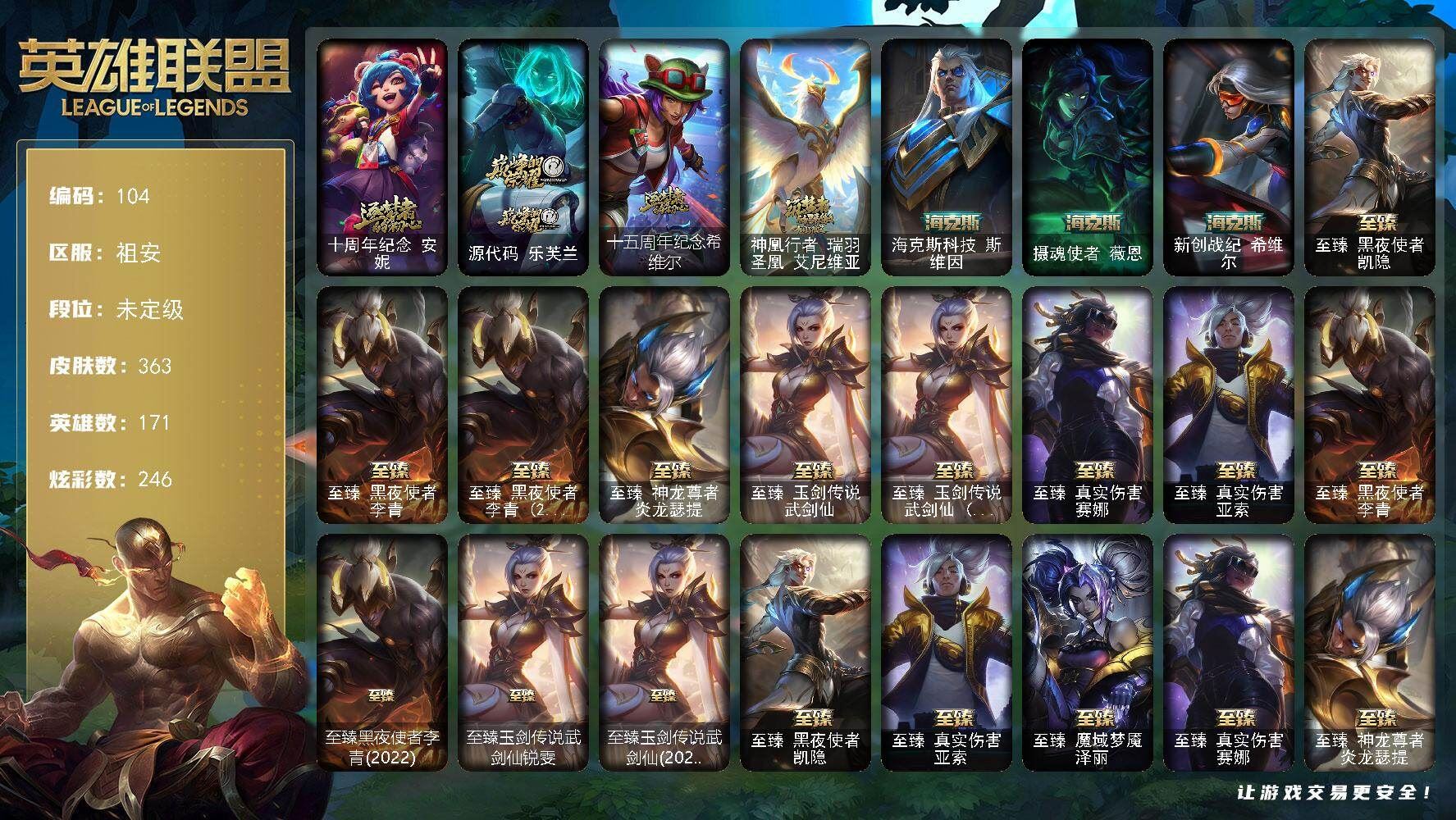 r52006 可二次电信祖安未定级段位-171英雄-363皮肤-246炫彩-1终极-16神话-39限定-38传说-85史诗【神话皮肤】:十周年纪念安妮,源代码乐芙兰,十五周年纪念希维尔,神凰行者瑞羽圣凰艾尼维亚,海克斯科技斯维因,摄魂使者薇恩,新创战纪希维尔,至臻真实伤害赛娜,至臻真实伤害亚索,至臻黑夜使者凯隐,至臻黑夜使者李青,至臻黑夜使者李青2022,至臻神龙尊者炎龙瑟提,至臻玉剑传说武剑仙,至臻玉剑传说武剑仙2022【热门头像】:觅心之翼奎因头像【至臻皮肤】:至臻黑夜使者李青,至臻黑夜使者李青(2022),至臻玉剑传说武剑仙锐雯,至臻玉剑传说武剑仙(2022),至臻黑夜使者凯隐,至臻真实伤害亚索,至臻魔域梦魇泽丽,至臻真实伤害赛娜,至臻神龙尊者炎龙瑟提【臻彩皮肤】:天龙之子卡莎飞龙乘云,无畏骑士瑟庄妮赤子初心,冰霜之刃艾瑞莉娅炫金,闭月之颜貂蝉炫金莲华,西部天使赛娜神选天使长,黎明使者锐雯黑夜使者,西部天使赛娜贝利尔之怠,灵魂莲华卡西奥佩娅流火,持七彩冰棍的雪人易,灵魂莲华亚索霜见之时,可爱可爱粉红红布里茨,春晖神女艾希玉露金风,魔女阿卡丽虚荣,净雪之月莫甘娜冬虹【年限皮肤】:美猴王孙悟空,天龙之子斯莫德,点心宝贝阿木木【海克斯皮肤】:新创战纪希维尔,海克斯科技斯维因,摄魂使者薇恩【情人节限定】:水晶玫瑰迦娜【冰雪限定】:圣诞狂欢基兰,阿木木“主人不要我了”,邪恶圣诞老人维迦,圣诞玩偶波比,冰雪驯鹿波比,魄罗骑士瑟庄妮【终极皮肤】:DJ娑娜【限定皮肤】:送披萨的小姐姐希维尔,冠军之血希瓦娜,Fnatic卡尔萨斯,暗杀星慎,SKTT1贾克斯,SSW泰隆,SKTT1雷克顿,星之守护者伊泽瑞尔,神凰行者烈羽焰凰霞,暗裔英雄盖伦,胜利之树茂凯,胜利枪神格雷福斯,胜利女神奥莉安娜,胜利之剑亚托克斯,胜利枪神卢锡安,胜利机器人布里茨,胜利女神瑟庄妮,胜利凤凰艾尼维亚,胜利之王泰达米尔,胜利巨口克格莫,鬼影重重魔腾,无头骑士赫卡里姆,泳池派对格雷福斯,蒙多蒙多,暗影沃里克,都铎王朝图奇,红桃杰克崔斯特,防暴士兵格雷福斯,防暴天使凯尔【传说皮肤】:地狱之门卫士加里奥,战地机甲厄加特,大天使长米迦勒凯尔,战场女武神凯尔,源计划林易,霸天零式赛恩,欧米伽小队幽灵特工,合金巨兽努努和威朗普,女皇艾希,源计划联合艾希,西部天使艾希,恶魔之刃泰达米尔,绅士科加斯,双重冰晶艾尼维亚,电玩女神娑娜,女警狙击凯特琳,苹果机器人布里茨,地狱行者孙悟空,源计划净化薇恩,屠龙勇士潘森,死亡骑士盖伦,钢铁军团盖伦,枯萎之壤泽拉斯,黯黑魔龙希瓦娜,冰霜亚龙希瓦娜,偶像歌手阿狸,灵魂莲华阿狸,苍穹之光韦鲁斯,金牌主播德莱文,霸天异形卡兹克,灌篮高手德莱厄斯,黑夜使者亚索,暗星尊烬,星之守护者金克丝,西部魔影卢锡安,真实伤害艾克,星之守护者洛,灵魂莲华瑟提,各种道具详情看截图、低价出售找回包 赔、截图展示段位不代 表实际段位,如赛季更新等不可抗拒因素发生变化、时限道具不保证所剩时间、标题未写送点劵默认不送【卖号买号首选亿梦】