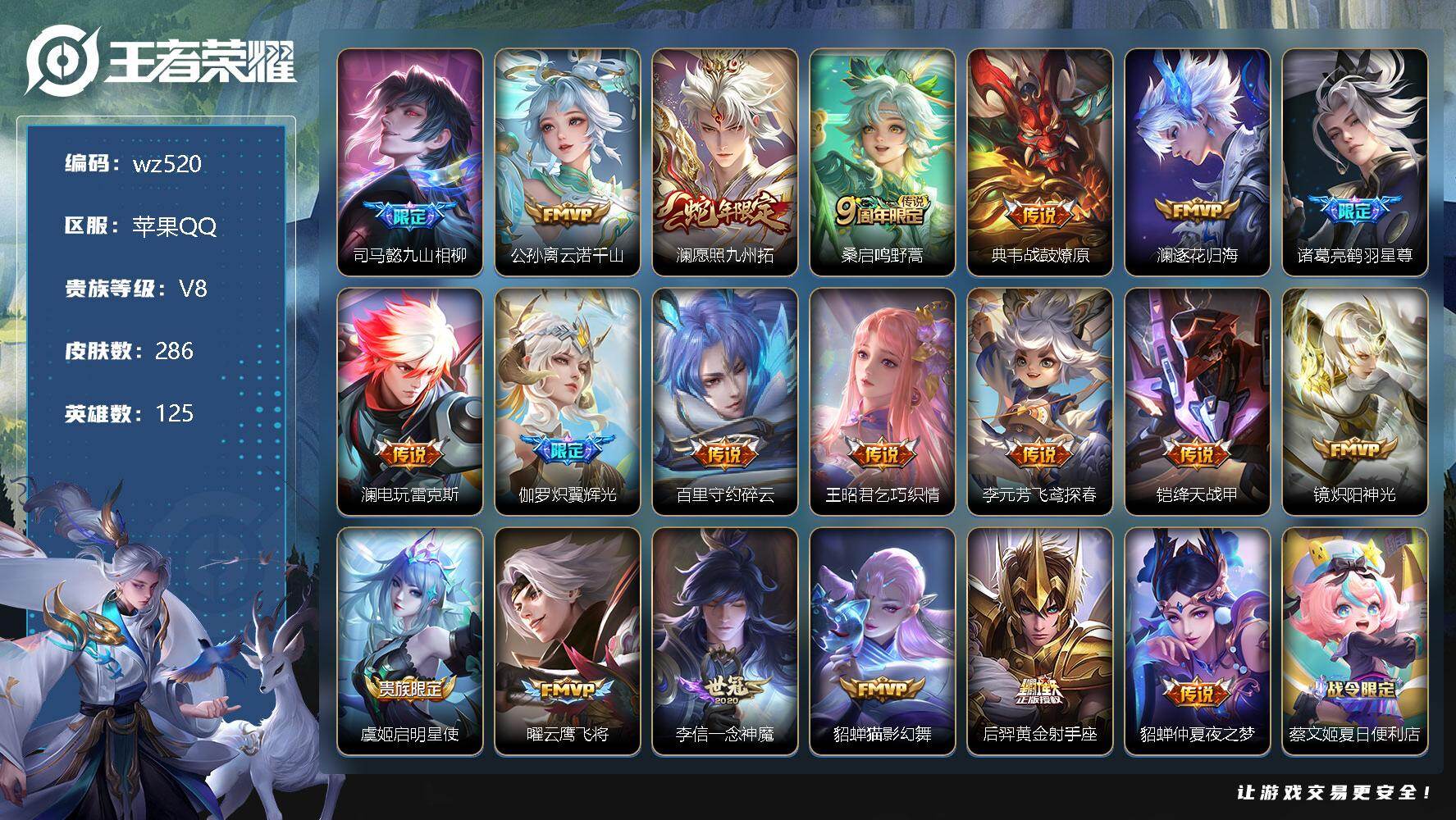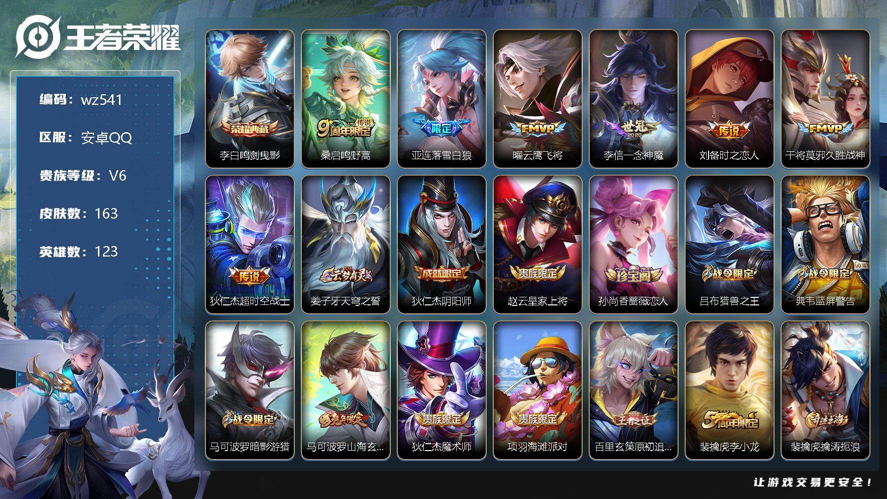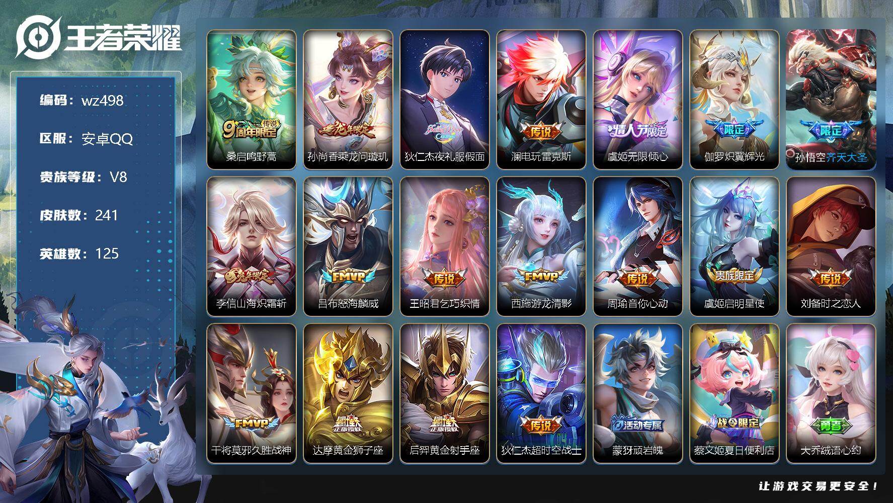 【wz473】【商品标题】:安卓Q-V0-最强王者段位-124英雄-235皮肤-1典藏-0珍品无双-0无双-0珍品传说-13传说-72史诗