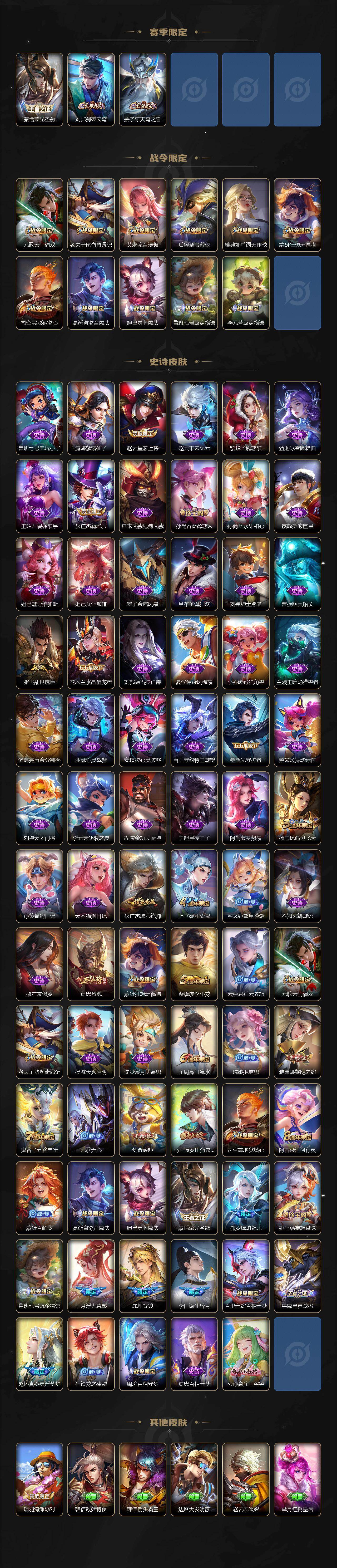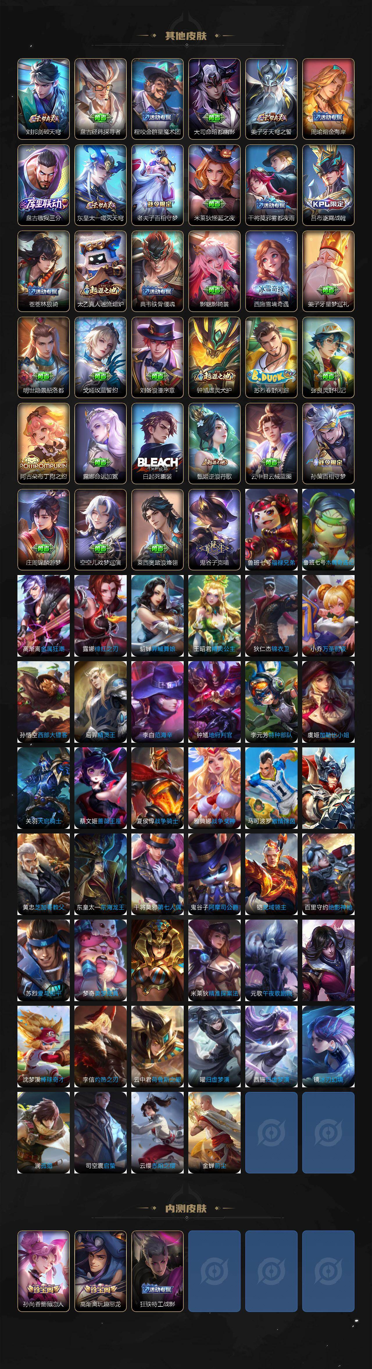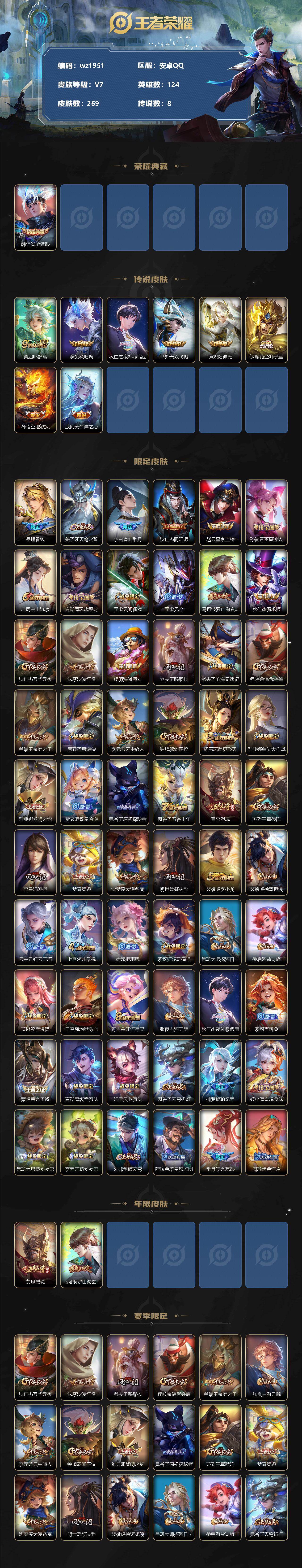 【wz1951】安卓Q-V7-最强王者段位-124英雄-269皮肤-1典藏-0珍品无双-0无双-0珍品传说-8传说-76史诗 【英雄全皮】:鬼谷子全皮,空空儿全皮,影全皮 【荣耀典藏】:韩信弑枪猎影 【传说皮肤】:桑启鸣野蒿,澜逐花归海,狄仁杰夜礼服假面,马超无双飞将,镜炽阳神光,达摩黄金狮子座,孙悟空地狱火,武则天海洋之心 【限定皮肤】:暃埋骨钱,姜子牙天穹之誓,李白谪仙醉月,狄仁杰阴阳师,赵云皇家上将,孙尚香蔷薇恋人,庄周高山流水,高渐离玩趣恶龙,元歌云间偶戏,元歌无心,马可波罗山海玄木吟,狄仁杰魔术师,狄仁杰万华元夜,达摩沙漠行僧,项羽海滩派对,老夫子醍醐杖,老夫子航海奇遇记,程咬金演武夺筹,兰陵王金庭之子,后羿圣弓游侠,李元芳云中旅人,钟馗驱傩正仪,杨玉环遇见飞天,雅典娜单词大作战,雅典娜黎明之约,蔡文姬繁星吟游,鬼谷子原初探秘者,鬼谷子五谷丰年,黄忠烈魂,苏烈千军破阵,弈星混沌棋,梦奇顽趣,沈梦溪大漠名商,明世隐疑决卦,裴擒虎李小龙,裴擒虎擒涛扼浪,云中君纤云弄巧,上官婉儿梁祝,嫦娥拒霜思,蒙犽狂想玩偶喵,鲁班大师探海日志,桑启海盐诗旅,艾琳流音漫舞,司空震地狱燃心,阿古朵江河有灵,张良古海寻踪,狄仁杰夜礼服假面,蒙犽百解令,蒙恬荣光圣徽,高渐离燃音魔法,妲己灵卜魔法,鬼谷子天穹祈灯,伽罗琥珀纪元,姬小满妄想食味,鲁班七号蔬乡物语,李元芳蔬乡物语,刘邦剑破天穹,程咬金群星魔术团,芈月浮光幕影,周瑜熔金海岸 【年限皮肤】:黄忠烈魂,马可波罗山海玄木吟 【赛季限定】:狄仁杰万华元夜,达摩沙漠行僧,老夫子醍醐杖,程咬金演武夺筹,兰陵王金庭之子,张良古海寻踪,李元芳云中旅人,钟馗驱傩正仪,雅典娜黎明之约,鬼谷子原初探秘者,苏烈千军破阵,弈星混沌棋,梦奇顽趣,沈梦溪大漠名商,明世隐疑决卦,裴擒虎擒涛扼浪,鲁班大师探海日志,桑启海盐诗旅,鬼谷子天穹祈灯,蒙恬荣光圣徽,刘邦剑破天穹,姜子牙天穹之誓 【战令限定】:元歌云间偶戏,老夫子航海奇遇记,艾琳流音漫舞,后羿圣弓游侠,雅典娜单词大作战,蒙犽狂想玩偶喵,司空震地狱燃心,高渐离燃音魔法,妲己灵卜魔法,鲁班七号蔬乡物语,李元芳蔬乡物语 【史诗皮肤】:鲁班七号电玩小子,露娜紫霞仙子,赵云皇家上将,赵云未来纪元,貂蝉圣诞恋歌,甄姬冰雪圆舞曲,王昭君偶像歌手,狄仁杰魔术师,宫本武藏鬼剑武藏,孙尚香蔷薇恋人,孙尚香水果甜心,嬴政摇滚巨星,妲己魅力维加斯,妲己女仆咖啡,墨子金属风暴,吕布圣诞狂欢,刘禅绅士熊喵,曹操幽灵船长,张飞乱世虎臣,花木兰水晶猎龙者,刘邦德古拉伯爵,夏侯惇乘风破浪,小乔缤纷独角兽,兰陵王暗隐猎兽者,诸葛亮黄金分割率,亚瑟心灵战警,安琪拉心灵骇客,百里守约特工魅影,铠曙光守护者,蔡文姬舞动绿茵,刘禅天才门将,李元芳逐浪之夏,程咬金功夫厨神,白起星夜王子,阿轲节奏热浪,杨玉环遇见飞天,孙策猫狗日记,大乔猫狗日记,狄仁杰鹰眼统帅,上官婉儿梁祝,蔡文姬繁星吟游,不知火舞魅语,橘右京修罗,黄忠烈魂,蒙犽狂想玩偶喵,裴擒虎李小龙,云中君纤云弄巧,元歌云间偶戏,老夫子航海奇遇记,杨戬天秀启明,沈梦溪月团寄思,庄周高山流水,嫦娥拒霜思,雅典娜黎明之约,鬼谷子五谷丰年,元歌无心,梦奇顽趣,马可波罗山海玄木吟,司空震地狱燃心,阿古朵江河有灵,蒙犽百解令,妲己灵卜魔法,高渐离燃音魔法,蒙恬荣光圣徽,伽罗琥珀纪元,姬小满妄想食味,鲁班七号蔬乡物语,芈月浮光幕影,暃埋骨钱,李白谪仙醉月,百里守约百相守梦,牛魔星界战将,赵怀真器灵浮梦炉,狂铁龙之律动,周瑜百相守梦,黄忠百相守梦,公孙离涂山容容 【其他皮肤】:项羽海滩派对,韩信教廷特使,韩信街头霸王,达摩大发明家,赵云忍炎影,芈月红桃皇后,白起白色死神,牛魔西部大镖客,扁鹊化身博士,扁鹊救世之瞳,宫本武藏未来纪元,安琪拉玩偶对对碰,孙膑天使之翼,姜子牙时尚教父,妲己少女阿狸,典韦黄金武士,亚瑟死亡骑士,达摩拳王,张飞五福同心,甄姬花好人间,刘备万事如意,宫本武藏万象初新,后羿阿尔法小队,狄仁杰阴阳师,刘备纽约教父,刘备汉昭烈帝,关羽龙腾万里,墨子进击墨子号,钟无艳海滩丽影,宫本武藏霸王丸,王昭君幻想奇妙夜,狂铁命运角斗场,老夫子功夫老勺,牛魔制霸全明星,孙尚香沉稳之力,诸葛亮掌控之力,李白敏锐之力,鬼谷子幻乐之宴,苏烈坚韧之力,大乔守护之力,项羽科学大爆炸,明世隐虹云星官,庄周奇妙博物学,小乔丁香结,吕布野性能量,孙膑归虚梦演,高渐离玩趣恶龙,沈梦溪鲨炮海盗猫,姜子牙炽热元素使,弈星混沌棋,哪吒次元突破,明世隐疑决卦,盾山圆桌骑士,老夫子醍醐杖,狂铁特工战影,廉颇无尽征程,鬼谷子原初探秘者,雅典娜单词大作战,狄仁杰万华元夜,刘禅秘密基地,杨戬次元傲视,露娜瓷语鉴心,程咬金演武夺筹,张良缤纷绘卷,钟馗驱傩正仪,鲁班大师乓乓大师,苏烈千军破阵,后羿圣