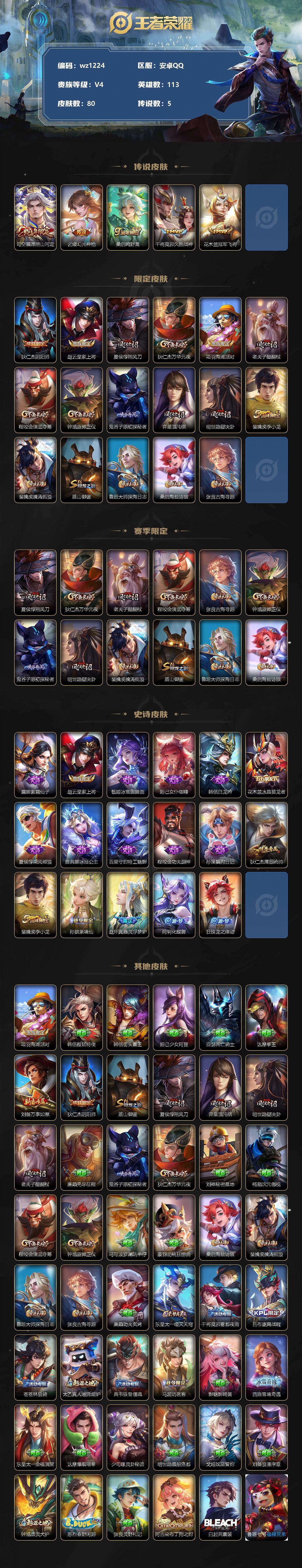 【wz1224】【商品标题】:安卓Q-V4-永恒钻石II段位-113英雄-80皮肤-0典藏-0珍品无双-0无双-0珍品传说-5传说-17史诗 【传说皮肤】:司空震愿照山河定,云缨幻光神枪,桑启鸣野蒿,干将莫邪久胜战神,花木兰冠军飞将 【限定皮肤】:狄仁杰阴阳师,赵云皇家上将,夏侯惇朔风刀,狄仁杰万华元夜,项羽海滩派对,老夫子醍醐杖,程咬金演武夺筹,钟馗驱傩正仪,鬼谷子原初探秘者,弈星混沌棋,明世隐疑决卦,裴擒虎李小龙,裴擒虎擒涛扼浪,盾山御銮,鲁班大师探海日志,桑启海盐诗旅,张良古海寻踪 【赛季限定】:夏侯惇朔风刀,狄仁杰万华元夜,老夫子醍醐杖,程咬金演武夺筹,张良古海寻踪,钟馗驱傩正仪,鬼谷子原初探秘者,弈星混沌棋,明世隐疑决卦,裴擒虎擒涛扼浪,盾山御銮,鲁班大师探海日志,桑启海盐诗旅 【史诗皮肤】:露娜紫霞仙子,赵云皇家上将,甄姬冰雪圆舞曲,妲己女仆咖啡,韩信白龙吟,花木兰水晶猎龙者,夏侯惇乘风破浪,雅典娜冰冠公主,百里守约特工魅影,程咬金功夫厨神,孙策猫狗日记,狄仁杰鹰眼统帅,裴擒虎李小龙,孙膑茶境仙,赵怀真器灵浮梦炉,阿轲化蝶舞,狂铁龙之律动 【其他皮肤】:项羽海滩派对,韩信教廷特使,韩信街头霸王,妲己少女阿狸,亚瑟死亡骑士,达摩拳王,刘备万事如意,狄仁杰阴阳师,盾山御銮,夏侯惇朔风刀,弈星混沌棋,明世隐疑决卦,老夫子醍醐杖,廉颇无尽征程,鬼谷子原初探秘者,狄仁杰万华元夜,刘禅秘密基地,杨戬次元傲视,程咬金演武夺筹,钟馗驱傩正仪,马可波罗潮玩牛仔,蒙犽胡桃狂想曲,桑启海盐诗旅,裴擒虎擒涛扼浪,鲁班大师探海日志,张良古海寻踪,廉颇功夫炙烤,东皇太一噬灭天穹,干将莫邪雾都夜雨,吕布逐霄战戟,苍苍林狼骑,太乙真人谧流熔炉,典韦铁骨偃魂,马超访茗客,影魅影绮裳,西施雪境奇遇,东皇太一金福满堂,达摩爆裂喵拳,少司缘灵卦秘语,明世隐景韶洛都,戈娅玫蓝誓约,刘备浪漫序章,钟馗虚灵犬护,苏烈春野闲踪,张良灵野札记,阿古朵布丁狗之约,白起死霸装,鲁班七号福禄兄弟,鲁班七号木偶奇遇记,曹操死神来了,孙悟空西部大镖客,铠龙域领主,裴擒虎街头旋风,元歌午夜歌剧院,李信灼热之刃,镜冰刃幻境,澜孤猎,司空震启蛰 【营地ID】:99156692
