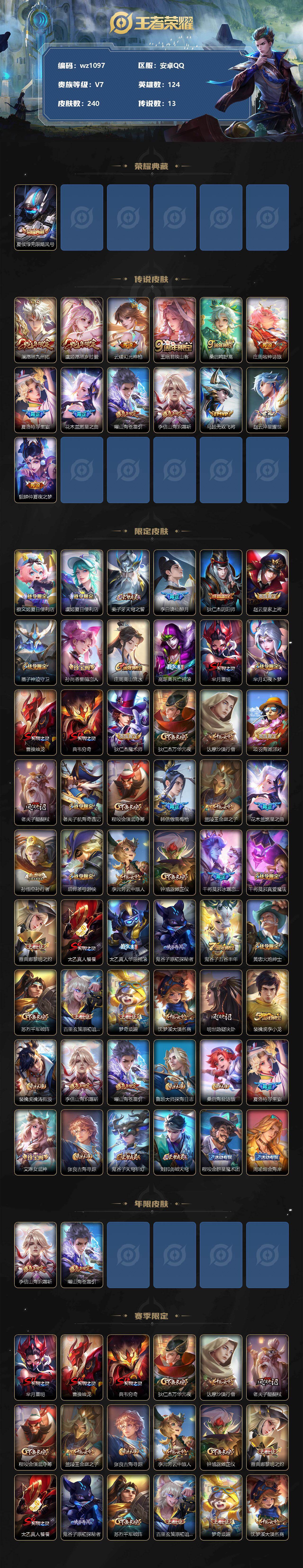 【wz1097】【商品标题】:安卓Q-V7-尊贵铂金III段位-124英雄-240皮肤-1典藏-0珍品无双-0无双-0珍品传说-13传说-70史诗 【荣耀典藏】:夏侯惇无限飓风号 【传说皮肤】:澜愿照九州拓,虞姬愿照岁时盈,云缨幻光神枪,王昭君映山客,桑启鸣野蒿,庄周牧神诗旅,夏洛特浮生妄,花木兰燃星之曲,曜山海苍雷引,李信山海炽霜斩,马超无双飞将,赵云淬星耀世,貂蝉仲夏夜之梦 【限定皮肤】:蔡文姬夏日便利店,虞姬夏日便利店,姜子牙天穹之誓,李白谪仙醉月,狄仁杰阴阳师,赵云皇家上将,墨子神迹守卫,孙尚香蔷薇恋人,庄周高山流水,高渐离死亡摇滚,芈月重明,芈月幻夜卜梦,曹操烛龙,典韦穷奇,狄仁杰魔术师,狄仁杰万华元夜,达摩沙漠行僧,项羽海滩派对,老夫子醍醐杖,老夫子航海奇遇记,程咬金演武夺筹,韩信傲雪梅枪,兰陵王金庭之子,花木兰燃星之曲,孙悟空孙行者,后羿圣弓游侠,李元芳云中旅人,钟馗驱傩正仪,干将莫邪冰霜恋舞曲,干将莫邪真爱魔法,雅典娜黎明之约,太乙真人饕餮,太乙真人华丽摇滚,鬼谷子原初探秘者,鬼谷子五谷丰年,黄忠火炮绅士,苏烈千军破阵,百里玄策原初追逐者,梦奇顽趣,沈梦溪大漠名商,明世隐疑决卦,裴擒虎李小龙,裴擒虎擒涛扼浪,李信山海炽霜斩,曜山海苍雷引,鲁班大师探海日志,桑启海盐诗旅,夏洛特浮生妄,艾琳女武神,张良古海寻踪,鬼谷子天穹祈灯,刘邦剑破天穹,程咬金群星魔术团,周瑜熔金海岸 【年限皮肤】:李信山海炽霜斩,曜山海苍雷引 【赛季限定】:芈月重明,曹操烛龙,典韦穷奇,狄仁杰万华元夜,达摩沙漠行僧,老夫子醍醐杖,程咬金演武夺筹,兰陵王金庭之子,张良古海寻踪,李元芳云中旅人,钟馗驱傩正仪,雅典娜黎明之约,太乙真人饕餮,鬼谷子原初探秘者,苏烈千军破阵,百里玄策原初追逐者,梦奇顽趣,沈梦溪大漠名商,明世隐疑决卦,裴擒虎擒涛扼浪,鲁班大师探海日志,桑启海盐诗旅,鬼谷子天穹祈灯,刘邦剑破天穹,姜子牙天穹之誓 【战令限定】:墨子神迹守卫,蔡文姬夏日便利店,虞姬夏日便利店,芈月幻夜卜梦,老夫子航海奇遇记,后羿圣弓游侠,干将莫邪真爱魔法,黄忠火炮绅士 【史诗皮肤】:鲁班七号电玩小子,项羽苍穹之光,露娜紫霞仙子,赵云皇家上将,貂蝉圣诞恋歌,甄姬冰雪圆舞曲,王昭君偶像歌手,狄仁杰魔术师,宫本武藏鬼剑武藏,孙尚香蔷薇恋人,孙尚香水果甜心,嬴政摇滚巨星,妲己魅力维加斯,妲己女仆咖啡,墨子金属风暴,吕布圣诞狂欢,刘禅绅士熊喵,李白千年之狐,张飞乱世虎臣,花木兰水晶猎龙者,夏侯惇乘风破浪,小乔缤纷独角兽,兰陵王暗隐猎兽者,诸葛亮黄金分割率,亚瑟心灵战警,百里守约特工魅影,铠曙光守护者,蔡文姬舞动绿茵,李元芳逐浪之夏,程咬金功夫厨神,阿轲节奏热浪,孙策猫狗日记,大乔猫狗日记,干将莫邪冰霜恋舞曲,伽罗箭羽风息,狄仁杰鹰眼统帅,大乔白蛇,小乔青蛇,不知火舞魅语,百里玄策原初追逐者,裴擒虎李小龙,蒙犽龙鼓争鸣,老夫子航海奇遇记,杨戬天秀启明,干将莫邪真爱魔法,安琪拉时之奇旅,孙悟空孙行者,庄周高山流水,黄忠火炮绅士,雅典娜黎明之约,韩信傲雪梅枪,鬼谷子五谷丰年,梦奇顽趣,蔡文姬夏日便利店,亚连破空之剑,李白谪仙醉月,艾琳陌上桑,百里守约百相守梦,孙膑茶境仙,弈星万物之道,赵怀真器灵浮梦炉,阿轲化蝶舞,刘禅鸭鸭历险记,狂铁龙之律动,亚瑟布丁狗之誓,后羿石田雨龙,周瑜百相守梦,黄忠百相守梦,西施织梦人,公孙离涂山容容 【其他皮肤】:项羽海滩派对,韩信教廷特使,韩信街头霸王,露娜哥特玫瑰,阿轲爱心护理,赵云白执事,赵云忍炎影,艾琳女武神,白起白色死神,扁鹊化身博士,宫本武藏未来纪元,孙膑天使之翼,姜子牙时尚教父,妲己少女阿狸,典韦黄金武士,达摩拳王,花木兰兔女郎,甄姬花好人间,刘备万事如意,后羿阿尔法小队,狄仁杰阴阳师,刘备纽约教父,高渐离死亡摇滚,关羽龙腾万里,钟无艳海滩丽影,太乙真人饕餮,曹操烛龙,王昭君幻想奇妙夜,芈月重明,狂铁命运角斗场,老夫子功夫老勺,孙尚香沉稳之力,典韦穷奇,李白敏锐之力,鬼谷子幻乐之宴,太乙真人华丽摇滚,苏烈坚韧之力,明世隐虹云星官,小乔丁香结,吕布野性能量,沈梦溪鲨炮海盗猫,姜子牙炽热元素使,哪吒次元突破,鲁班七号黑桃队长,明世隐疑决卦,老夫子醍醐杖,鬼谷子原初探秘者,狄仁杰万华元夜,刘禅秘密基地,程咬金演武夺筹,张良缤纷绘卷,钟馗驱傩正仪,墨子神迹守卫,鲁班大师乓乓大师,苏烈千军破阵,后羿圣弓游侠,典韦铁甲之心,达摩沙漠行僧,芈月幻夜卜梦,程咬金无双福将,兰陵王金庭之子,沈梦溪大漠名商,蒙犽胡桃狂想曲,李元芳云中旅人,桑启海盐诗旅,海月幻泉雾影,猪八戒潮玩探月行,牛魔牛运亨通,白起乐园追猎者,赵怀真太极少年,裴擒虎擒涛扼浪,太乙真人劲辣红锅,莱西奥西部游侠,鲁班大师探海日志,姬小满零食大作战,张良古海寻踪,鬼谷子天穹祈灯,廉颇功